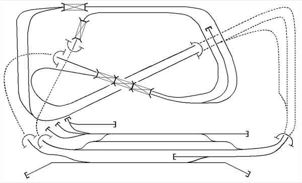 Схема кольцевая, двухуровневая, с одной четырехпутной станцией и двухпутным разъездом на нижнем уровне. Источник >>>