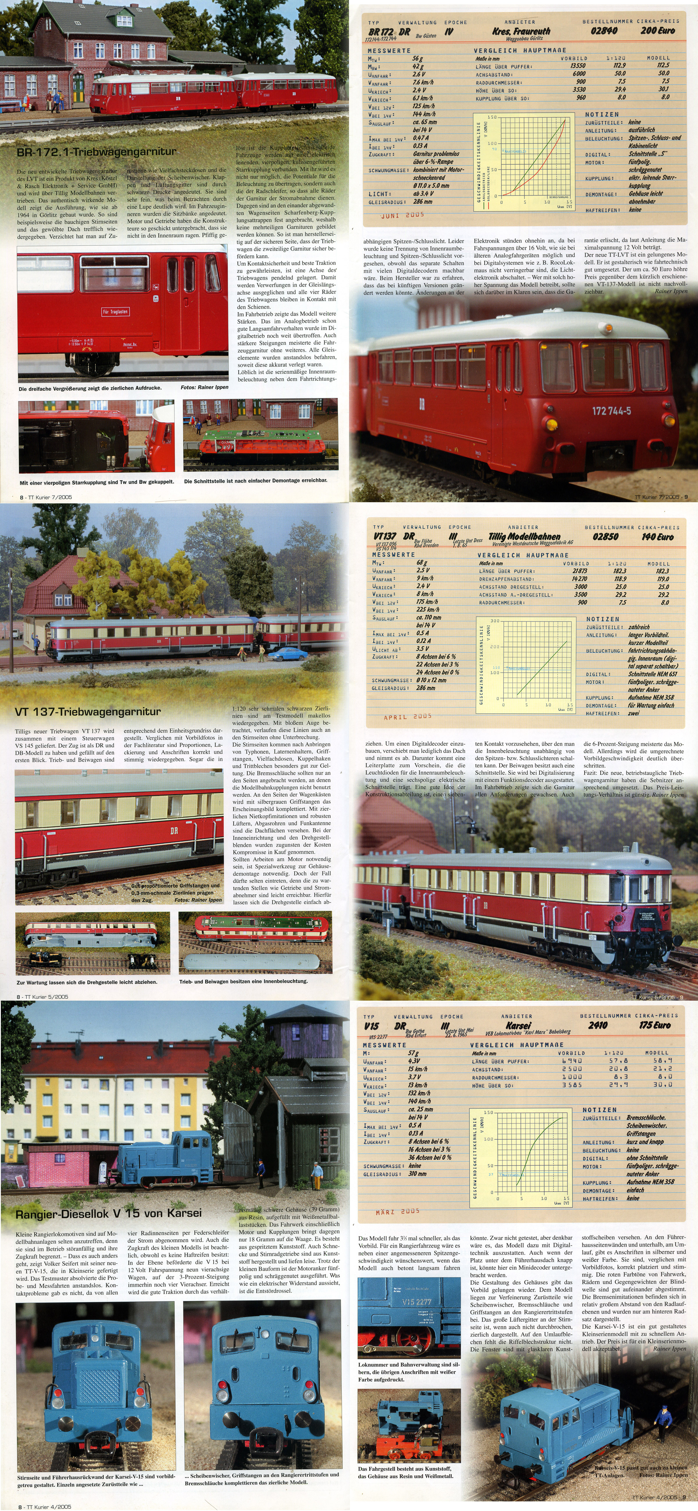 Автор: неизвестен Источник: "TT kurier", 2005. Тип файла: jpg. Объем файла: 4.657 Mb Статьи из разных номеров журнала "TT kurier" за 2005 г. посвящены моделям автомотрис VT137 (Tillig), ВR172.1 (Kres) и тепловоза V15 (Karsei). На немецком языке, с иллюстрациями.