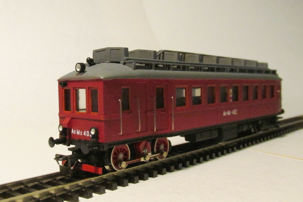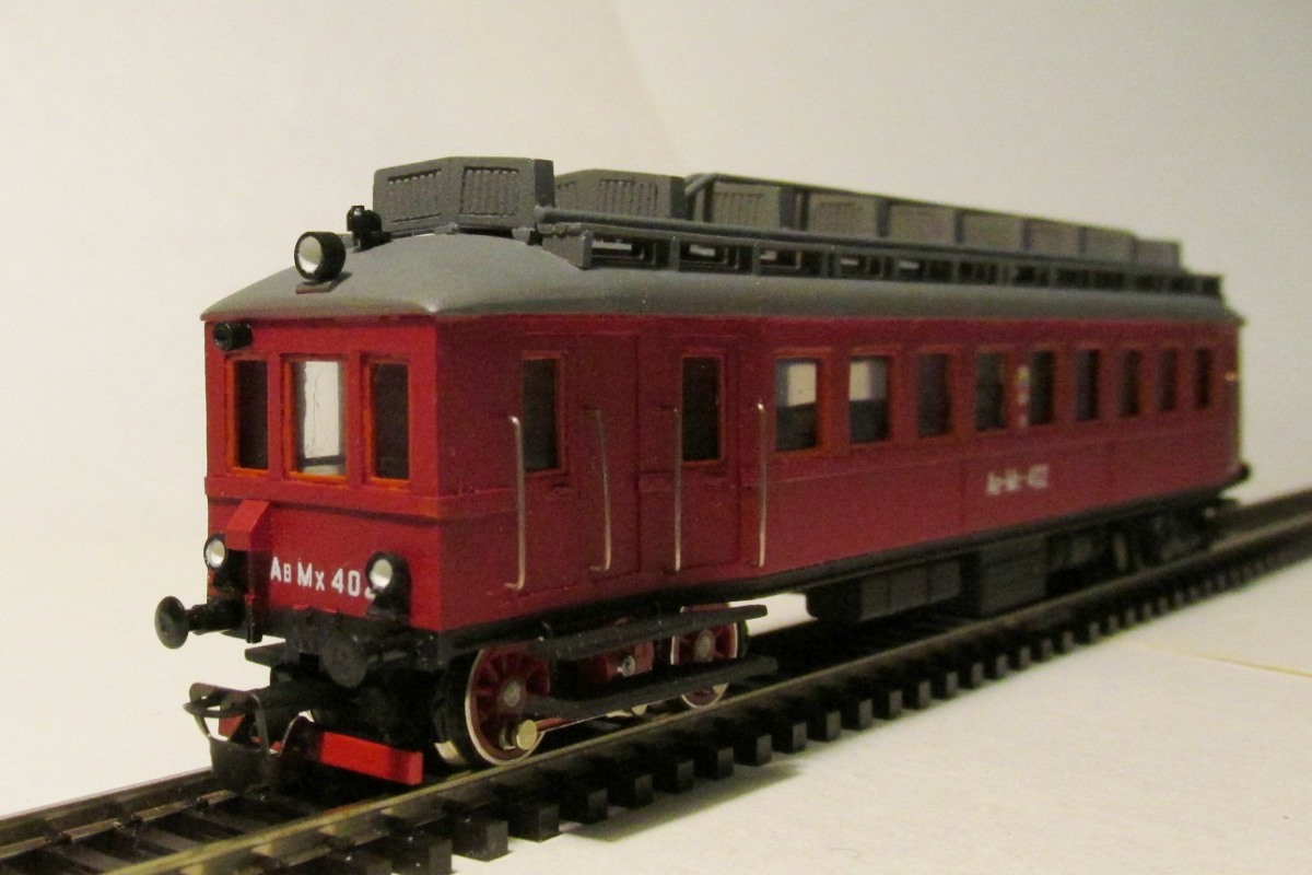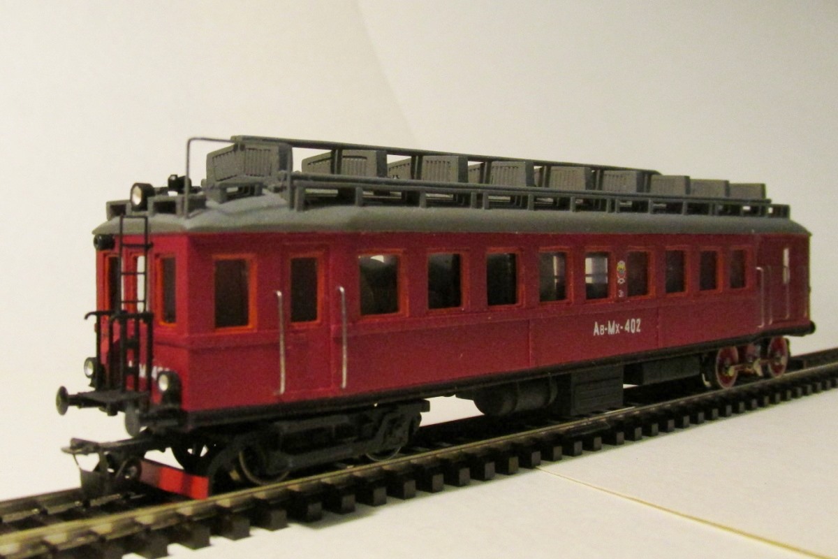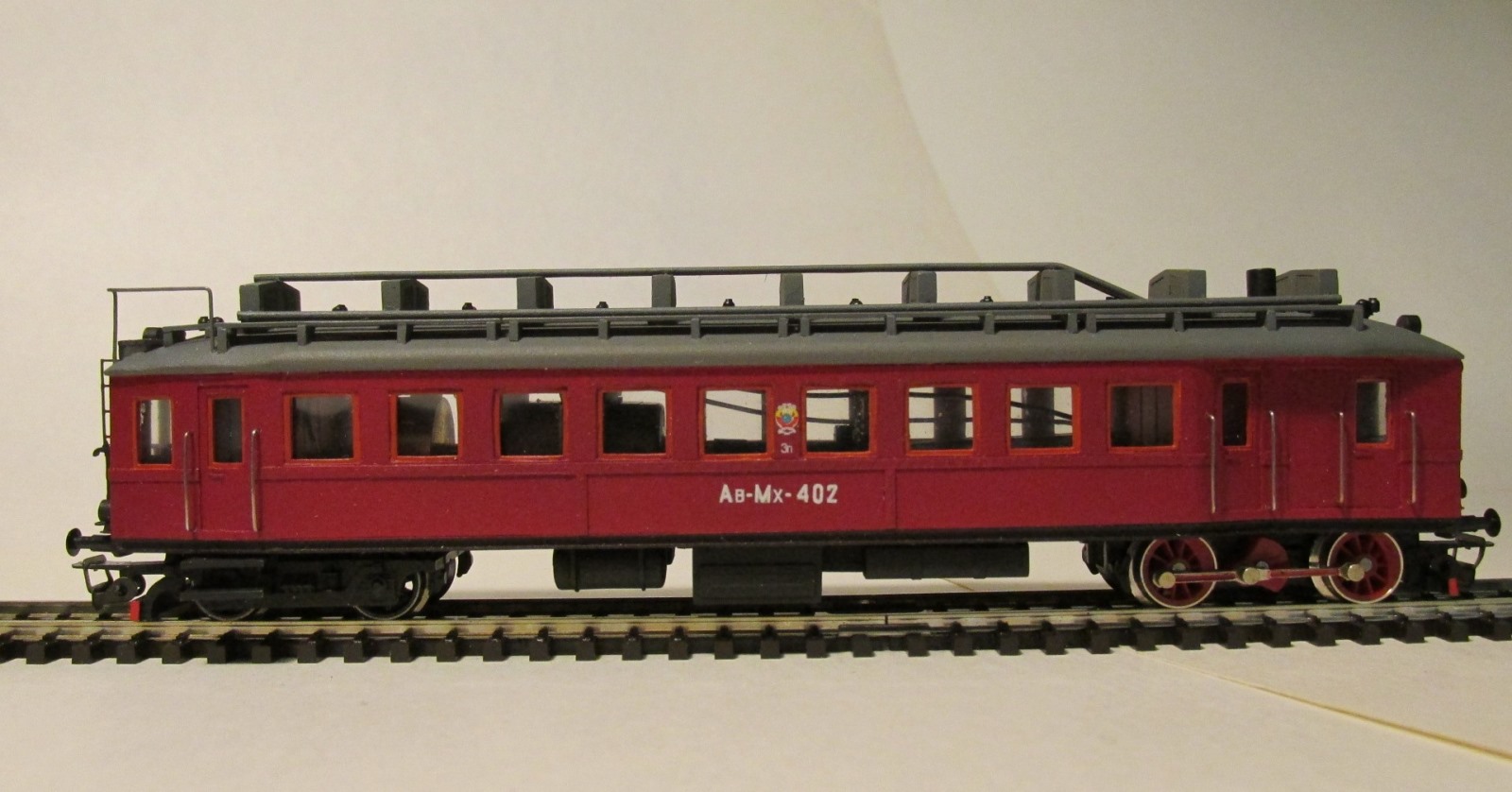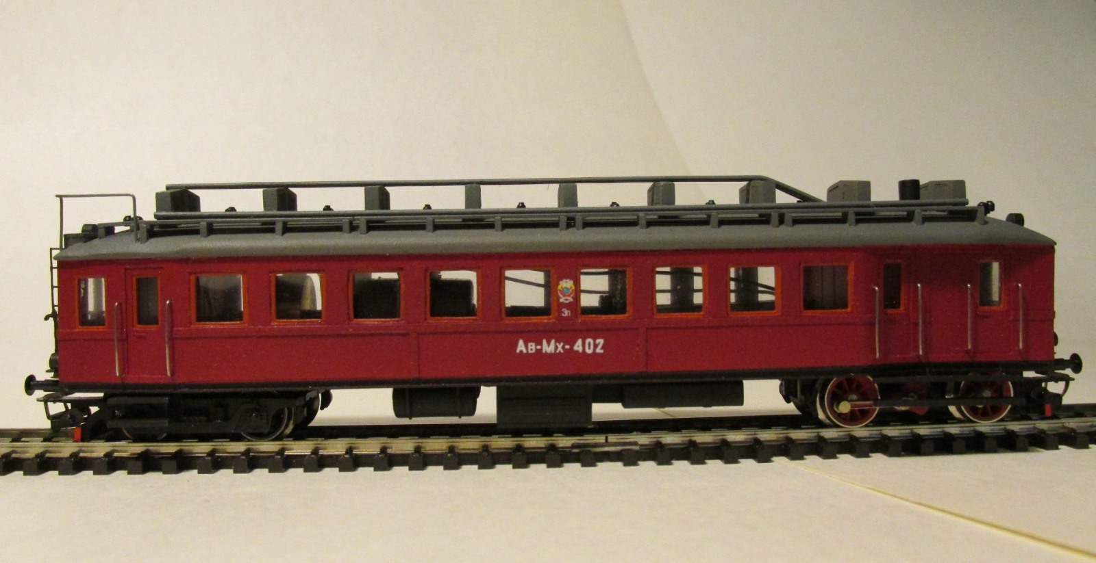 Разновидности: модель выполнена в одном экземпляре Эпоха: II Принадлежность: СЖД Фирма-производитель: Мурашов А. Год начала производства: 2016 Описание моделиХодовая модель автомотрисы АВ-Мх-402 изготовлена моделистом Алексеем Мурашовым (г. Наро-Фоминск) в 2015-16 гг. Модель выполнена "с нуля", с использованием небольшого количества мелких деталей от моделей производства фирм ВТТВ, Tillig, "Пересвет" (в т.ч. - колёса, отбойный вал с дышлами, сцепки, буфера). Привод выполнен на одну тележку - моторную (как и на прототипе). Видео прохождения модели по Раменскому макету. Описание прототипаВ 1929 г. фирма Эсслинген в Германии построила по заказу СССР две четырёхосные автомотрисы с механической передачей, которые получили обозначения Ав-Мх-401 и Ав-Мх-402. Каждая мотриса приводилась в движение дизельным двигателем мощностью 165 л/с, ось которого была параллельна осям колёсных пар и приводила их в движение с помощью отбойного вала и двух дышел (по обе стороны движущей тележки). Максимальная скорость мотрис составляла 75 км/ч, количество мест для сидения - 86 (после ликвидации туалета - 90), для стояния - 18. В 1929-32 гг. автомотрисы Ав-Мх обслуживали пассажирское движение на участке Сочи-Туапсе С.-Кв. ж.д., затем были переданы на Западную ж.д. (депо Москва, затем депо Рославль) и использовались главным образом для служебных перевозок.