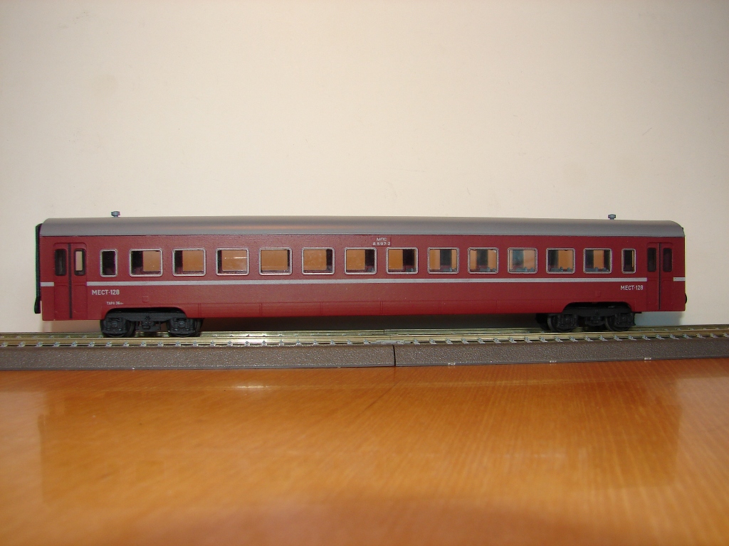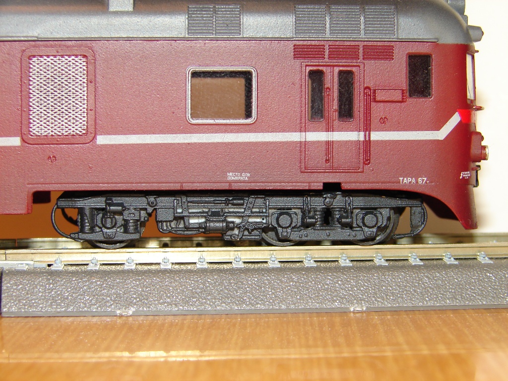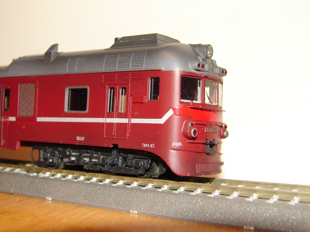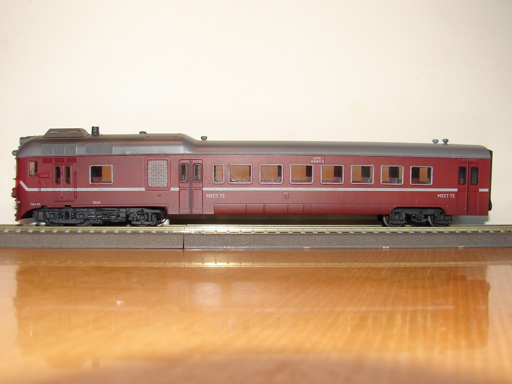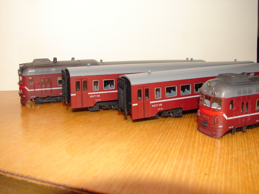 Разновидности: нет Эпоха: 4-5 (условно) Принадлежность: СЖД. Фирма-производитель: Юрий Кацапов. Год начала производства: 2020 Описание моделиМодель дизель-поезда Д1 выпускается петербургским мелкосерийным производителем Юрием Кацаповым по предварительным заказам с 2020 г. В состав модели входят 2 головных и 2 промежуточных прицепных вагона. Модель неходовая, возможность обмоторивания не предусмотрена. Отсутствуют и межвагонные сцепные устройства, что делает невозможным движение дизель-поезда на макете, даже в прицепном варианте. Все детали вагонов отлиты из смолы, надписи выполнены тампопечатью. При этом на положенные места не нанесены ни герб МПС СССР, ни логотип РЖД, что позволяет использовать модель как в четвёртой, так и в пятой модельной эпохе. В целом модель выполнена на высоком копийном уровне с правильными пропорциями и хорошей проработкой деталей. Однако некоторые технические решения производителя непонятны. В частности, удивляет полное отсутствие крепления кузовов вагонов к раме. Другие модели дизель-поезда Д1: - от "ТТ-ТТ" (выпуск модели отменен); Описание прототипаЧетырёхвагонный дизель-поезд Д1 был разработан венгерским заводом «Ганц-Маваг» специально для Советских железных дорог в рамках «международного разделения труда» стран СЭВ. Он выпускался с 1963 по 1989 г.г., всего было построено 605 единиц. Дизель-поезд Д1 являлся развитием ранее выпускавшегося тем же заводом трёхвагонного дизель-поезда серии Д. Д1 состоит из двух моторных головных и двух промежуточных прицепных вагонов. В каждом из головных вагонов установлен дизельный двигатель мощностью 730 л.с. Максимальная скорость – 120 км/ч. Штатно дизель-поезд Д1 имеет 400 посадочных мест, однако при необходимости количество прицепных вагонов можно увеличить до четырёх. Эти поезда поступали на многие дороги Европейской части СССР, где использовались для пригородного и местного пассажирского сообщения на неэлектрифицированных линиях. На сети РЖД дизель-поезда Д1 использовались в пассажирском движении до 2103 г., в некоторых странах СНГ до сих пор находятся в эксплуатации. Интересный факт – поезд Д1-720 был переоборудован в двухвагонную служебную мотрису начальника Октябрьской железной дороги. Внутри имелись рабочий кабинет, купе для отдыха и зал для совещаний. Вагоны были выкрашены красками «металлик» по оригинальной цветографической схеме. Много лет машинистом этой мотрисы работал известный Санкт-Петербургский любитель ТТ Сергей Иванов. Сейчас Д1-720 представлен в натурной экспозиции ЦМЖТ на ст. Лебяжье.