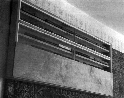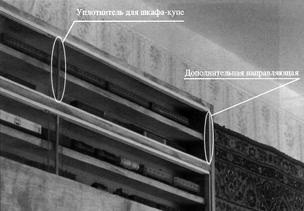 Пыль, правда, может проникнуть ещё через щели между стеклом и боковой стенкой полки. И это обстоятельство тоже учтено в моей конструкции. Что касается щели между стеклом и стеной полки, то здесь есть простое решение, подсмотренное мною в конструкциях старых деревянных полок. Покупая направляющие, необходимо приобрести их с запасом. Остатки направляющих необходимо подогнать по высоте и приклеить на боковые стенки полки (см. фотографию). Стекло полки должно легко заходить в образовавшийся паз.