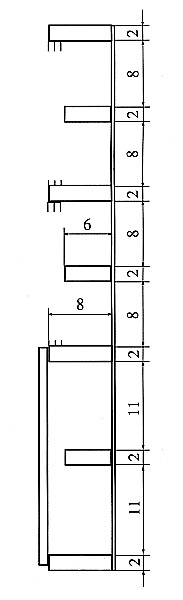 Замеры коробочек разных производителей дали следующие размеры: при той же глубине полки в 8 см (с наружной дверцей, как показано на схеме), высота просвета полочки должна быть 11 см. Это позволяет хранить на одной полочке (по высоте-ширине) 4 коробочки от ТТ-Модель, или 3 «стандартные» вагонные коробочки от «Пересвета», или 2 старые, или 2 новые локомотивные коробочки от «Пересвета», или 4 коробочки от вагонов «Gonchar ТТ», или 3 коробочки от Tillig, или некоторые их комбинации.