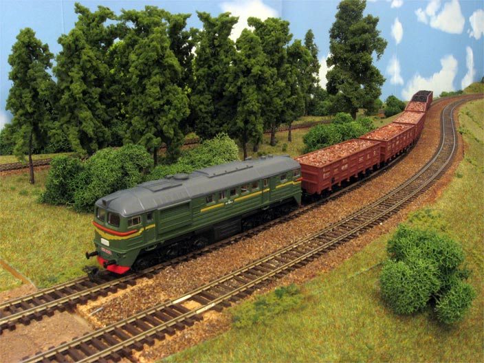 Состав из 6 полувагонов смотрится вполне реалистично, хотя для магистральной линии Советских железных дорог, безусловно, коротковат. Тем не менее, его длина вместе с тепловозом на макете составляет без малого метр.