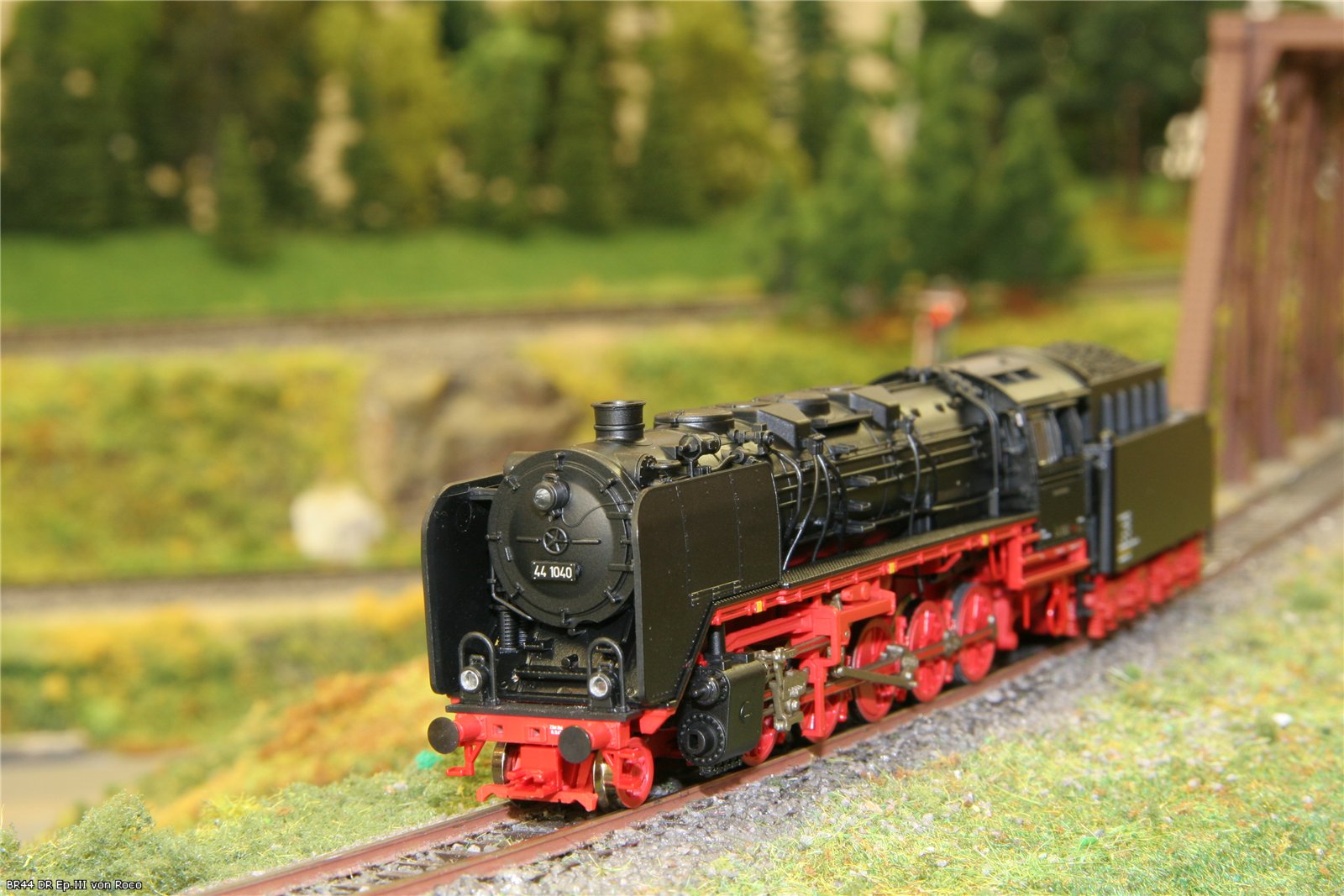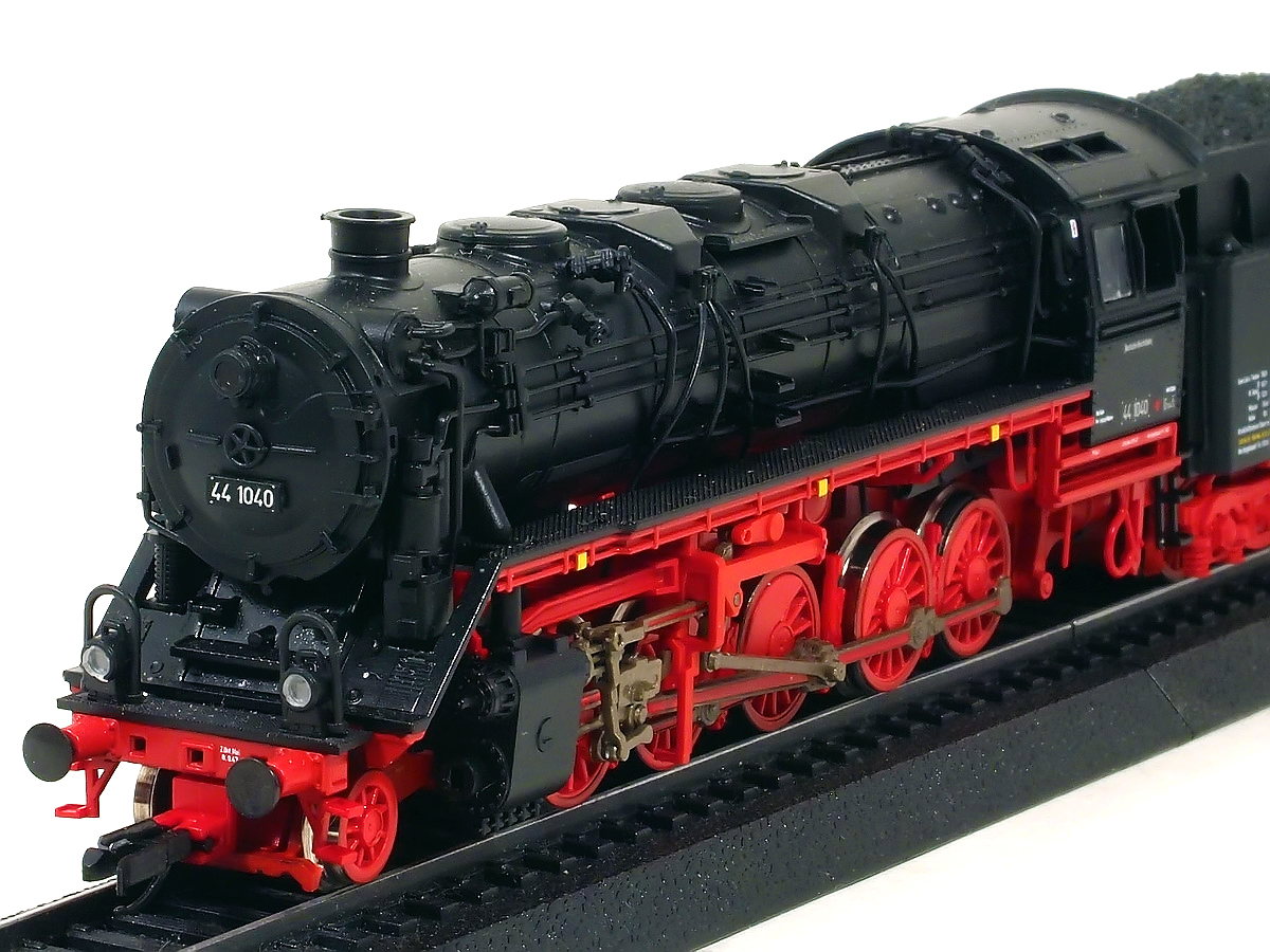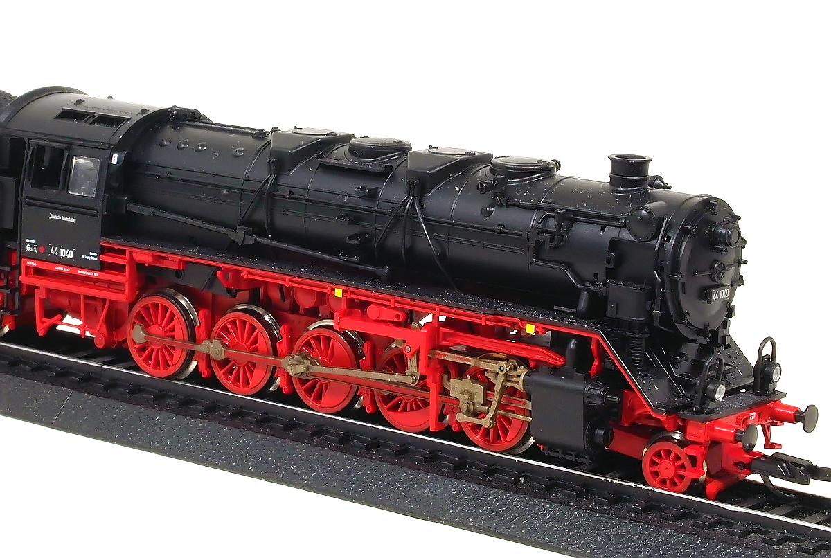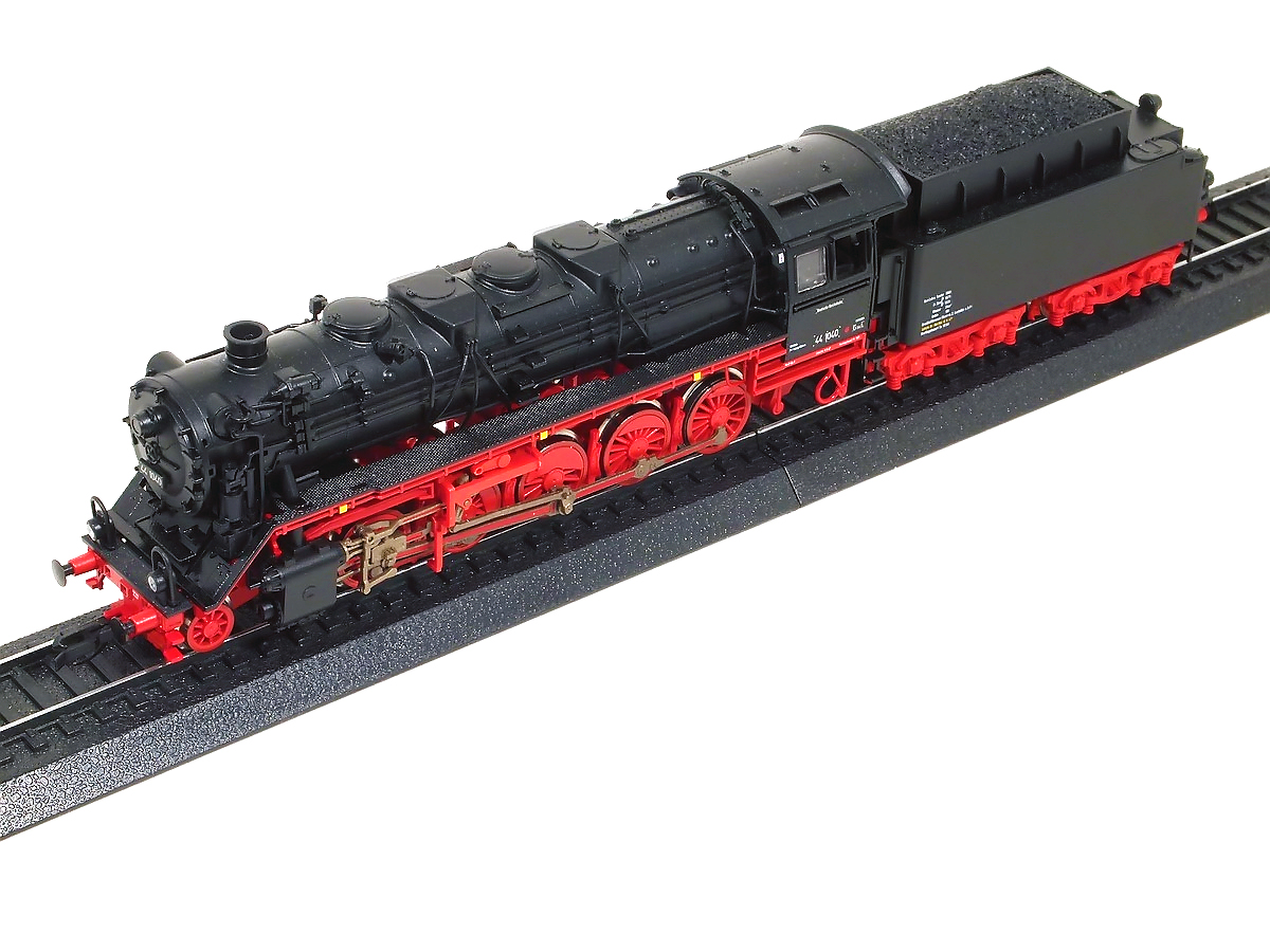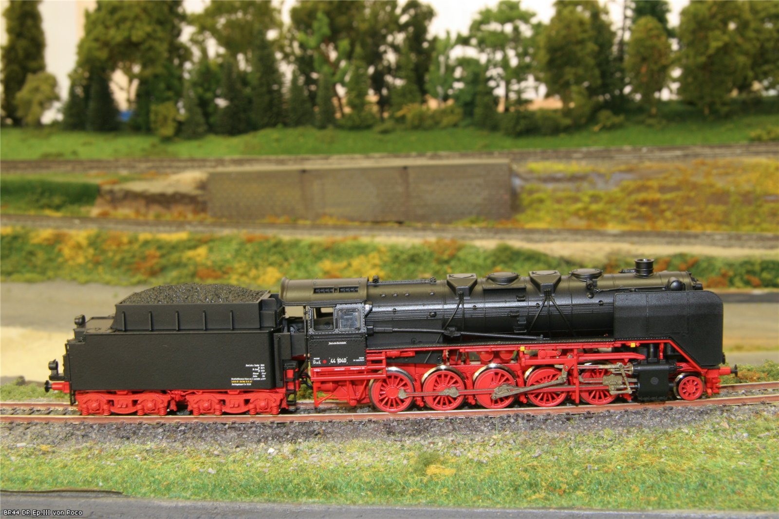 Автор: C.Гуцу. Фото С.Гуцу Предлагаю Вашему вниманию обзор модели паровоза BR-44 в типоразмере ТТ производства Австрийской фирмы ROCO. Данную модель ждали давно. Компания анонсировала ее выпуск еще почти за год до начала продаж, причем обещала при этом небывало низкую для Европейских производителей цену на уровне 175 Евро, что являло собой тоже своего рода маленькую сенсацию, ибо "большие" паровозы 50-й и 52.8-й серии от Тиллига в то время стоили на уровне 225-250 Евро. Конечно в итоле цена оказалась немного выше обещанной но не намного. Всего на 15 евро. Модель анонсирована была изначально в сразу двух версиях: 36010 с дымоотбойниками Вагнера – III эпоха и 36011 c дымоотбойниками Витте IV эпоха. Позже фирма расширила ассортимент модификаций данного локомотива и к этим двум добавились 36012 (DR IV эпоха), 36013 (DRG II эпоха), 36014 (DR III эпоха).  Героем нашего обзора стала модель 36011. Модель упакована в стандартную для моделей ROCO синюю коробку с ложементом из темного мелкозернистого поролона. Думаю, останавливаться на упаковке не стоит, ибо она стандартна и знакома наверное всем, кто как-либо знаком с продукцией фирмы ROCO. Внутри упаковки находился пакетик с накладными деталями, инструкция к модели, листок с перечнем запчастей и, собственно, сама модель.   Модель оснащена пятиполюсным мотором с маховиком, размещенным в тендере и 6-ти штырьковым разьемом под декодер по стандарту NEM651. Разъем установлен вертикально, поэтому для установки декодера придется согнуть его ножки под прямым углом, либо воспользоваться угловым переходником, как в Тиллиговской модели паровоза 50-й серии. Также у данной модели работает освещение спереди и сзади, которое включается в направлении движения модели. Освещение трехточечное. Модель имеет очень плавный и очень тихий ход. Это одна из самых тихих моделей, попадавших ко мне в руки. Мотора почти не слышно даже на полном ходу локомотива. Основной шум при движении это шум от колес во время движения по рельсам.  Длина модели по буферам равна ровно 190 мм. Локомотив немаленький. Отмечу также что и масса днного локомотива тоже заставляет проникнуться уважением. Легонькой модель не назовешь. Вес модели вместе с установленными на нее накладными деталями равен 265 грамм. Корпус модели локомотива изготовлен из пластмссы, а корпус тендера из металла. Сам корпус тендера одновременно является и балластом. Детлировка модели выполнена на очень высоком уровне. Множество элементов конструкции выполнены в виде отдельных деталей. Литье очень качественное без малейших намеков на облои. Накладные детали из пакетика представляют собой дополнительную сцепку для установки в передней части модели по желанию, кожухи шатунов паровых машин и тормозные шланги с винтовыми упряжьями для установки на буферные брусья. В инструкции к модели фирма предупреждает, что установка данных деталей может привести к увеличению минимального проходимого радиуса кривой. Я их установил, ибо не люблю кривые малого радиуса, да и с данными деталями модель смотрится эффектнее.    Довольно неплохо проработан также и интерьер кабины машиниста. Единственный элемент модели,который вызывает легкое недоумение, это уж очень сильно отстоящие от корпуса тендера назад задние буферные фонари. Будь они хоть на 1,5-2 мм ближе к тендеру, они бы не смотрелись столь вычурно.  Окраска выполнена весьма акку