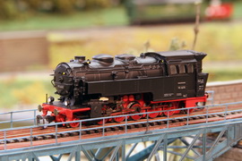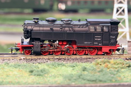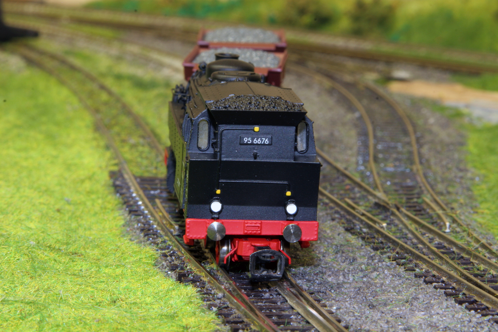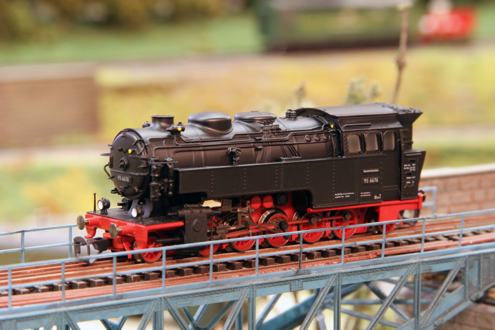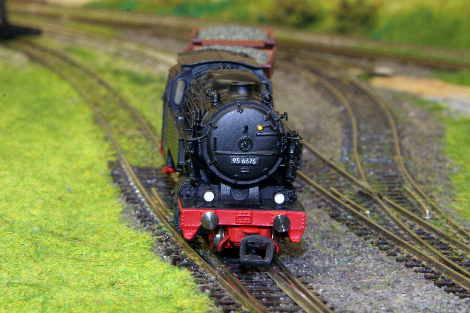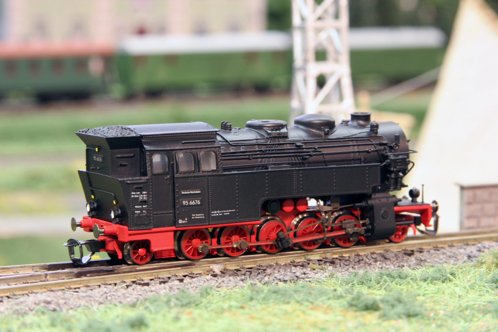 Автор: Д. Мамин. Фото модели: Дмитрия Мамина Решил сделать обзор, посвященный модели паровоза BR95 -6776 производимого фирмой Beckmann TT. Модель неновая и выпускается уже около 10ти лет. По словам самого господина Бекманна, данная модель показала лучшие результаты продаж за всю историю фирмы. Если более конкретно, то за первые пять лет выпуска было продано около 700 моделей. В настоящее время рекомендованная цена составляет 235 Евро. Модель выпускается лишь в одном варианте BR95 -6776 эпоха III DR. Стоит сказать несколько слов о прототипе, поскольку это действительно легендарный паровоз. На границе бывших Восточной и Западной Германии в земле Саксония –Анхальт существует горная местность именуемая Харц (Harz). В 1885-м году из расположенного у подножья гор Бланкебурга в горный массив, богатый полезными ископаемыми, акционерной компанией HBE (Halberstadt – Blankenburger Eisenbahn-Gesellschaft) была проложена железная дорога. Дорога имела уклоны до 60 тысячных, поэтому на участках с уклонами от 40 до 60-ти тысячных была применена зубчатая рейка для использования зубчатых паровозов системы Романа Абта. Позже подобные зубчатые паровозы системы Романа Абта нашли применение в соседней Тюрингии на дорогах, входящих в состав Прусских Государственных железных дорог K.P.E.V. На Прусских ж.д. эти паровозы с осевой формулой 0-3-1 получили серию Т26. На HBE работали подобные машины с аналогичной осевой формулой 0-3-1, отличавшиеся наружной рамой и имевшие незначительно меньший служебный вес. Зубчатые паровозы были дорогими в эксплуатации и имели недостаточную мощность и силу тяги для удовлетворения возрастающих потребностей в увеличении веса поездов. К середине 1910-х годов стало ясно, что необходима замена зубчатых паровозов типа 0-3-1 более мощными Машинами. Прусские ж.д. стали разрабатывать проект нового мощного зубчатого паровоза с осевой формулой 1-4-1 Т28, а НBE разработали проект паровоза с осевой формулой 1-5-1. Проект паровоза HBE предполагал использование классической фрикционной (за счет сцепления колес с рельсами) тяги, однако паровоз так же имел зубчатые колеса используемые в купе с классическими тормозами для торможения при следовании по участкам оборудованным зубчатой рейкой. Некоторое время спустя тормозные зубчатые колеса были демонтированы. Паровозы НBE 1-5-1 получили обозначение TIERKLASSE ( «звериная серия» ) так как они вместо номеров получали имена животных: MAMMUT (Мамонт), WISENT (Зубр), BUFFEL (Буйвол) и ELCH (Лось). Испытания локомотивов 1-5-1 НBE подтвердили возможность эксплуатации паровозов с классической фрикционной тягой на уклонах до 60-ти тысячных и выявили неоспоримые преимущества этих машин перед Т28. Базируясь на итогах испытаний НBE 1-5-1 и Т28 Прусские ж.д. выдали заказ на проектирование собственного горного паровоза 1-5-1 серии Т20 получившего позже серию BR95.0 который пришел на замену зубчатым Т26. А MAMMUT, WISENT, и BUFFEL проработали в Бланкенбурге до конца 1960-х годов, когда дорога в горы была электрифицирована (кстати, на 25kV 50Hz). С четвертым паровозом данной серии произошел трагический инцидент 4 мая 1951года. После ремонта на паровозоремонтом заводе в Майнингене при пробной растопке котла, из-за неисправности манометра, допущено превышение предельного давления в котле до 24-х атмосфер, что привело к взрыву котла. Здание цеха было полностью разрушено, котел паровоза пролетел по воздуху около ста метров и у