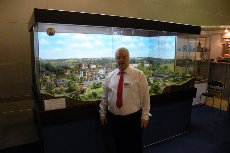 Кадр 2. Геннадий Никитин - руководитель творческого объединения "НИКО" и соорганизатор выставки, на фоне своего демонстрационного макета. К радости посетителей, маленьких и взрослых, макет иногда запускали.