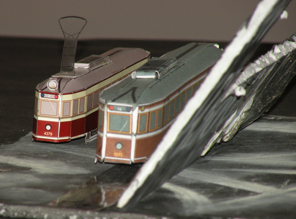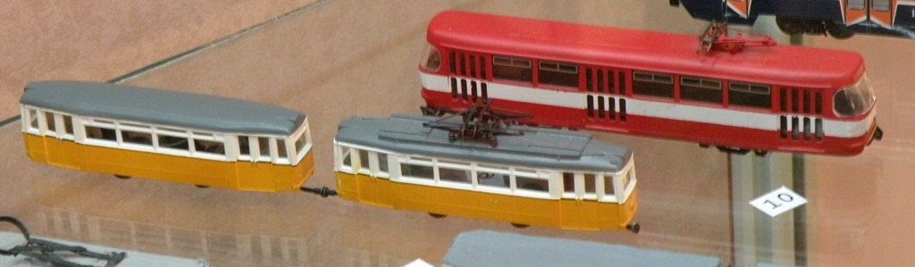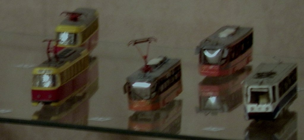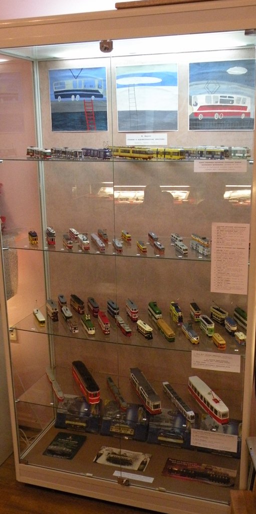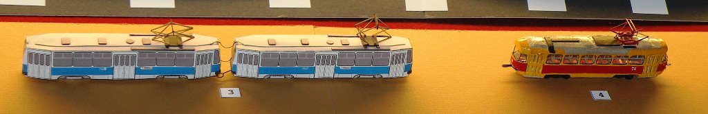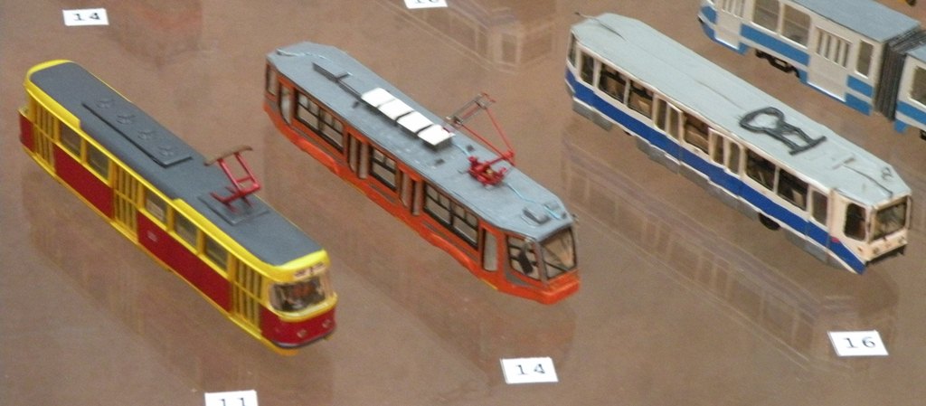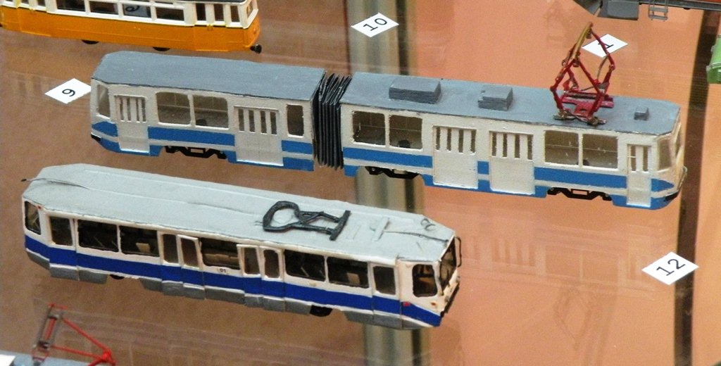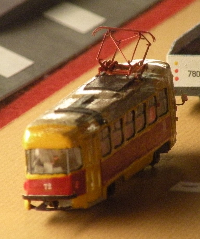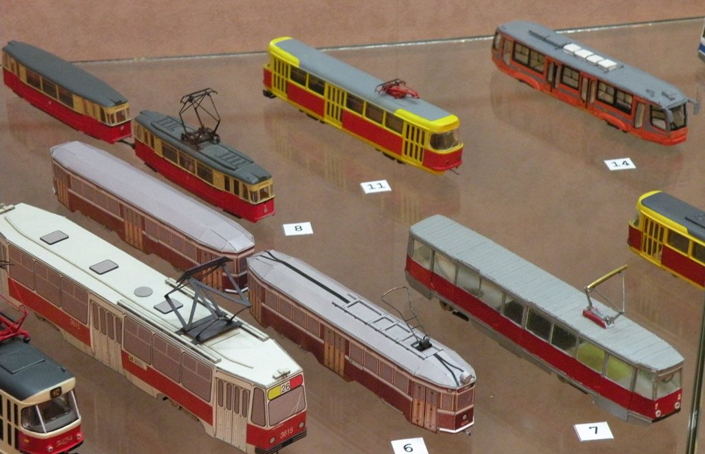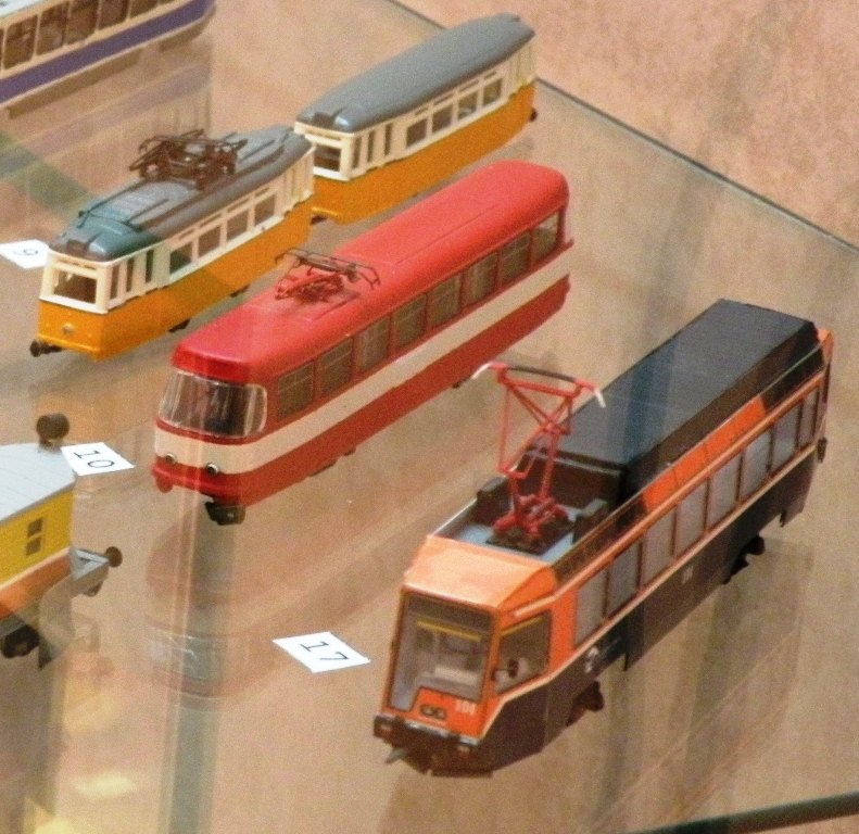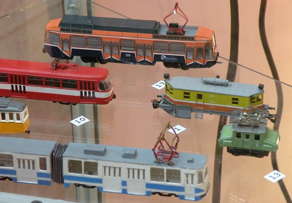 Автор: И.Сергеев. В Петербурге завершилась работа первой трамвайно-модельной выставки "Шёл по улице трамвай", проходившей с 1 по 20 ноября в музее "Разночинный Петербург". Выставка отлично освещалась всевозможными средствами массовой информации (телевидение, радио, Интернет), поэтому мы ограничимся простым описанием той части модельной экспозиции, которая была представлена в типоразмере ТТ / ТТm. Основная часть моделей (в разных масштабах) была выставлена в большой витрине, в центральной части экспозиции. Ещё несколько моделей удачно "поселились" в небольших исторических витринах на "Станции Советская" экскурсионного маршрута, вместе с фотографиями и некоторыми реальными предметами той поры. Здесь модельные трамвайчики наглядно иллюстрировали определенный период жизни ленинградского трамвая: так, модель МС-4 символизировала период 20-х гг., ЛМ-33 - тридцатые; промышленный электровозик ГЭТ с грузовой платформой - военные годы, когда трамвайные пути широко использовались для транспортировки грузов и т.д. Основу экспозиции в ТТ / ТТm составили модели из коллекции московского любителя транспорта Льва Мощевитина. Большая часть его коллекции - картонные модели трамваев: - Усть-Катавский КТМ-5М3 (71-605) - автор Шандор Штец (Ужгород, Украина), конверсия Романа Мишина (Москва). В модели устроено освещение салона; - Ленинградский ЛВС-97 - автор Константин Смирнов (Санкт-Петербург); - две модели Усть-Катавского КТМ-23 (71-623) - автор Максим Компанец (Тула); - две модели уральского "Спектра" (71-402) - автор Денис Денисов (Тула); - две модели Усть-Катавского КТМ-8К (71-608К) - автор Д.Денисов; - Луганский ЛТ-10 - автор Дмитрий Никольский (Тула). В отличие от перечисленных выше картонных моделей, выполненных на основе "стопроцентно ручной" технологии, эта модель представляет собой склейку, собранную из выкройки, распечатанной типографским способом. На фоне картонных самоделок в экспозиции Л.Мощевитина выделялись несколько серийных пластмассовых моделей. Эти последние отличаются двумя особенностями: во-первых, они представляют трамваи зарубежного производства; во-вторых, все они расчитаны на рельсовую колею 9 мм, то есть принадлежат к узкоколейному типоразмеру ТТm. В числе таких моделей были представлены: - немецкий трамвайный поезд Gotha (Гота) ЕТ50 и ещё один, более поздний - Gotha Т57/В57. Производство - Karsei Modellbahn (Германия); - три разных варианта чешской "Татры" Т4, производство - Grell (Китай). Две модели - конверсии Анатолия Кожуховского (Москва), ещё одна (обмоторенная) - конверсия Александра Шустова (Пущино). Безусловно, самой интересной для петербуржцев моделью, из числа представленных Л.Мощевитиным, следует признать пластмассовый ЛМ-33 (т.н. "Американка"). Модель выполнена Р.Мишиным на основе пластмассовых отливок, изготовленных в своё время Виктором Дёминым (Санкт-Петербург) на собственной пресс-форме. Эта пресс-форма не просто сохранилась до настоящего времени, но и находится в хорошем состоянии, требуя лишь небольшой доводки (в основном, в части крыши); однако, для тележек модели этого трамвая в типоразмере ТТ формы сделано не было. Вызывает большой вопрос и подбор соответствующей ходовки. Ещё несколько картонных моделей трамваев было предоставлено другими участниками выставки: - Ленинградские ЛМ-33 - две модели, изготовленные Сергеем Старцевым (Санкт-Петербург) на основе печатны