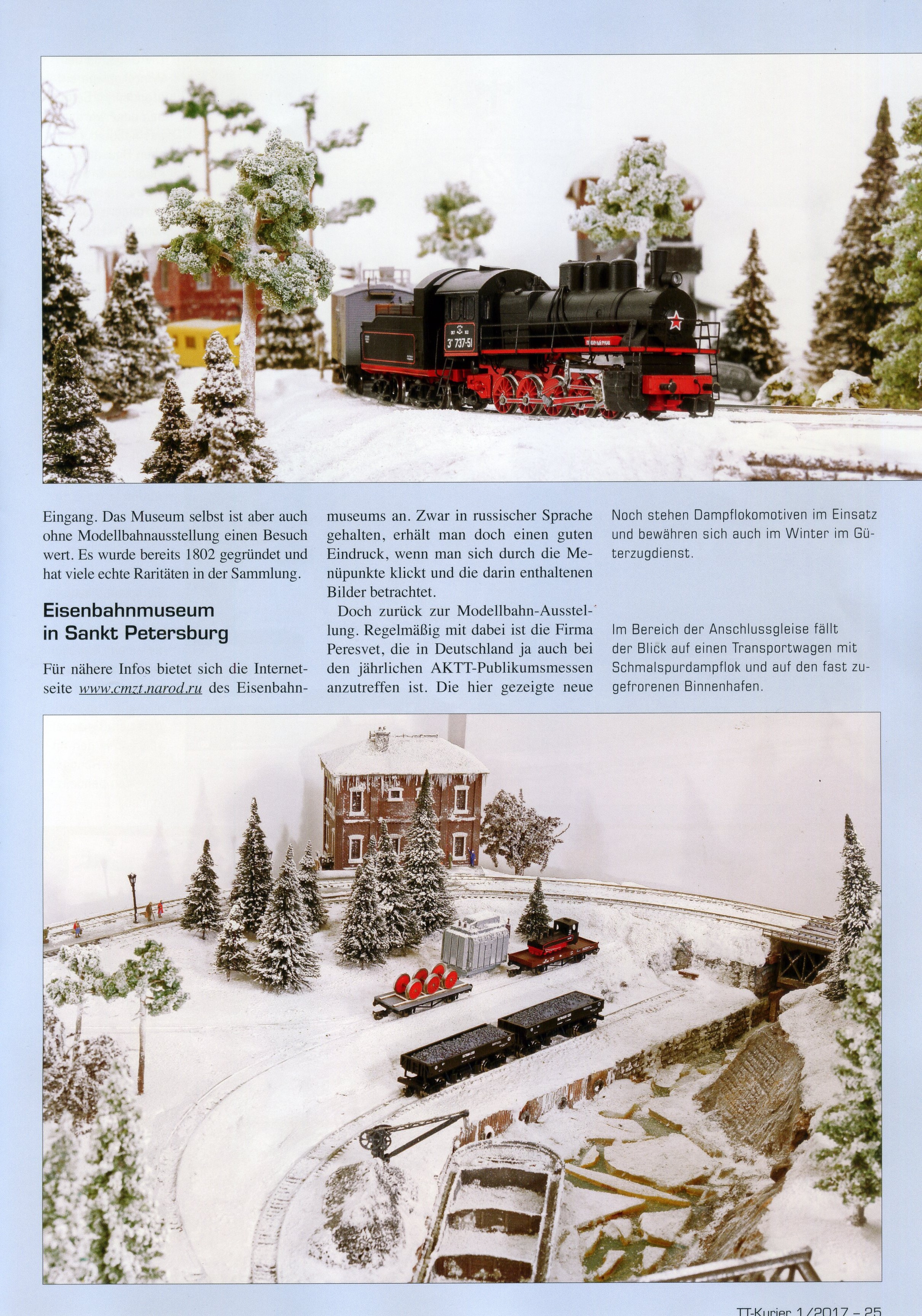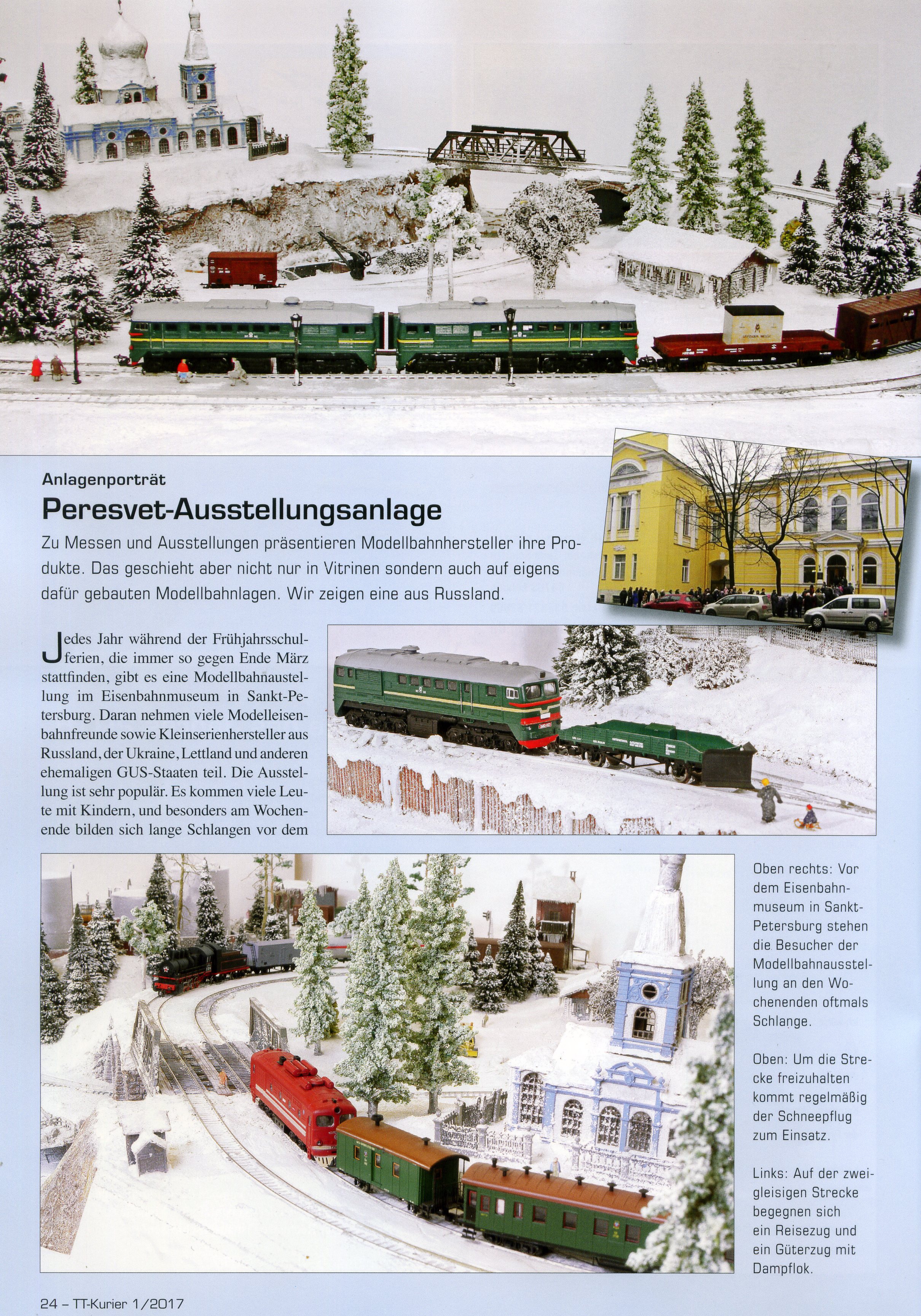 Автор: Th.Bradler. Источник: "TT-Kurier", 2017, № 1. Статья напоминает читателям старейшего немецкого регулярного ТТ-журнала о том, что в России живёт и здравствует фирма "Пересвет", специализирующаяся на производстве железнодорожных моделей в типоразмере ТТ. Тематический фокус статьи - известный "Зимний макет Пересвета", которому посвящены несколько иллюстраций. На макете - соврерменная продукция фирмы "Пересвет".