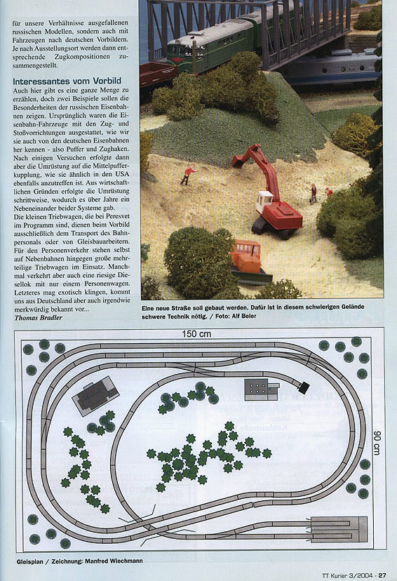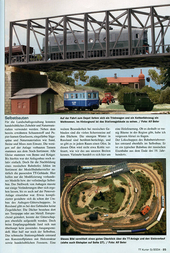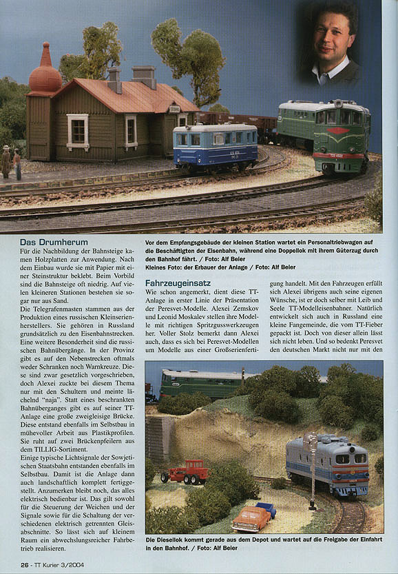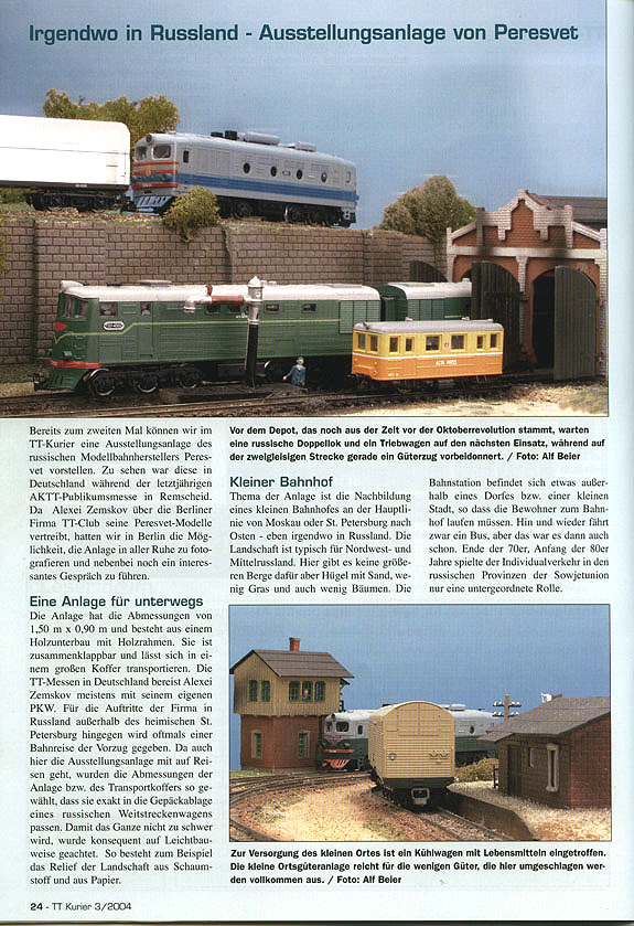 Автор: Th.Bradler. Источник: "TT-Kurier", 2004, № 5. Уже во второй раз мы представляем в нашем журнале образцы российского производителя моделей железной дороги - фирмы «Пересвет». Эти модели знакомы жителям Германии по прошлогодней ярмарке в Ремшейде. Директор «Пересвета», Алексей Земсков реализует свои модели через берлинскую фирму «ТТ-клуб», и благодаря этому мы получили возможность сфотографировать модели в Берлине и провести интересную беседу. МАКЕТ Демонстрационный макет «Пересвета» имеет габариты 1,5 х 0,90 м и состоит из деревянного фундамента с деревянной рамкой. Макет складной, и его можно транспортировать в большом чемодане, - например, по модельным выставкам в разных городах Германии. Это немаловажно для создателя макета - Алексея Земскова, часто путешествующего за пределами родного Петербурга, и преимущественно посредством железной дороги. Поэтому габариты путешествующего вместе с ним макета подобраны таким образом, что этот макет в сложенном виде вполне умещается на багажном месте в обычном российском вагоне дальнего следования. С этой же целью для изготовления макета использованы преимущественно лёгкие материалы. Например, рельеф ландшафта состоит из пенопласта и бумаги. МАЛЕНЬКИЙ ВОКЗАЛ Тема сооружения - это копия маленького станционного здания на магистральной железнодорожной линии Москва – Санкт-Петербург. Ландшафт макета типичен для северо-запада и средней полосы России. Здесь нет больших гор, но есть песчаные холмы, покрытые травой и немногочисленными деревьями. Железнодорожная станция находится в деревне или маленьком городке, так что жители должны самостоятельно добираться до вокзала. Возможно, несколько десятилетий назад здесь ходил автобус, но эти времена прошли. А ведь ещё не так давно, в конце 70-х – начале 80-х гг. в провинциальных городах Советского Союза индивидуальный транспорт (личные автомобили), в отличие от общественного, играл только вспомогательную роль. САМОДЕЛЬНЫЕ СТРОЕНИЯ Для оформления ландшафта используются самодельные заготовки и природные материалы. Наряду с пенопластом и бумагой идут в ход травянистые волокна, опилки, песок, камни и мох. Лишь хвойные деревья заимствованы из заводского ассортимента. На макете уложены рельсовые пути заимствованы от Bemo и Kreuger. Создание макета на первом этапе, до монтажа строений, было довольно простым делом. Проблемы возникли в связи с тем, что в ассортименте отсутствуют модели строений, подходящие для строительства маленького вокзала российских железных дорог. Здесь было два пути - конверсия имеющихся моделей зданий, или же самостоятельное создание моделей. Что касается конверсии, то оказалось возможным использовать лишь здание диспетчерского пункта от Auhagen. Более серьёзной перестройке подверглась модель пакгауза от Auhagen. Железнодорожные строения России не имеют черепичных крыш; они покрыты рубероидом или металлом. Поэтому вполне мог быть использован такого рода пакгауз. Однако, для вокзала с залом ожидания найти подходящую для конверсии готовую модель оказалось невозможным. Пришлось строить здание самостоятельно. Станционное здание было оформлено пластиковыми пластинами, имитирующими деревянную поверхность, а также самодельными оконными наличниками. Ещё одна особенность российских вокзальных строений - множество дымовых трубы на крыше. Жес