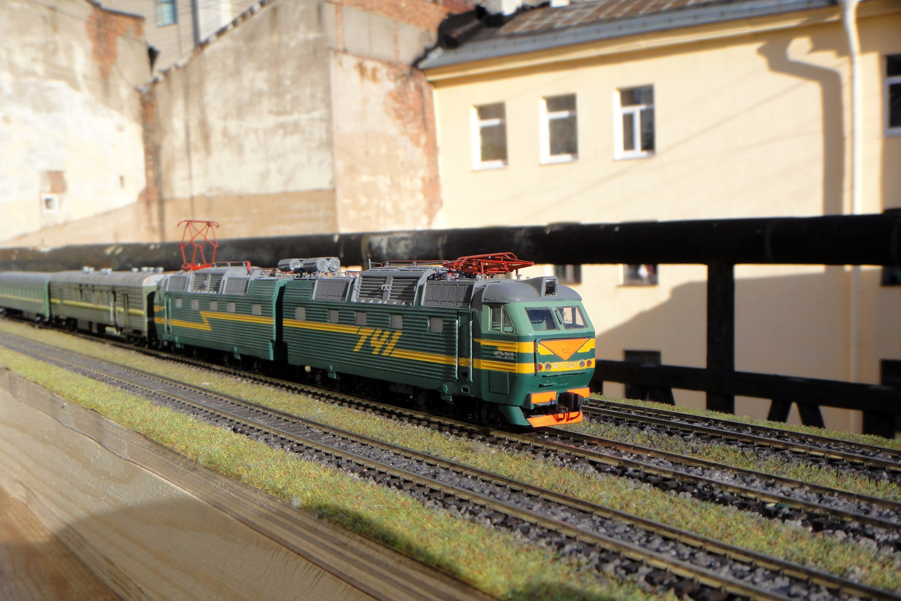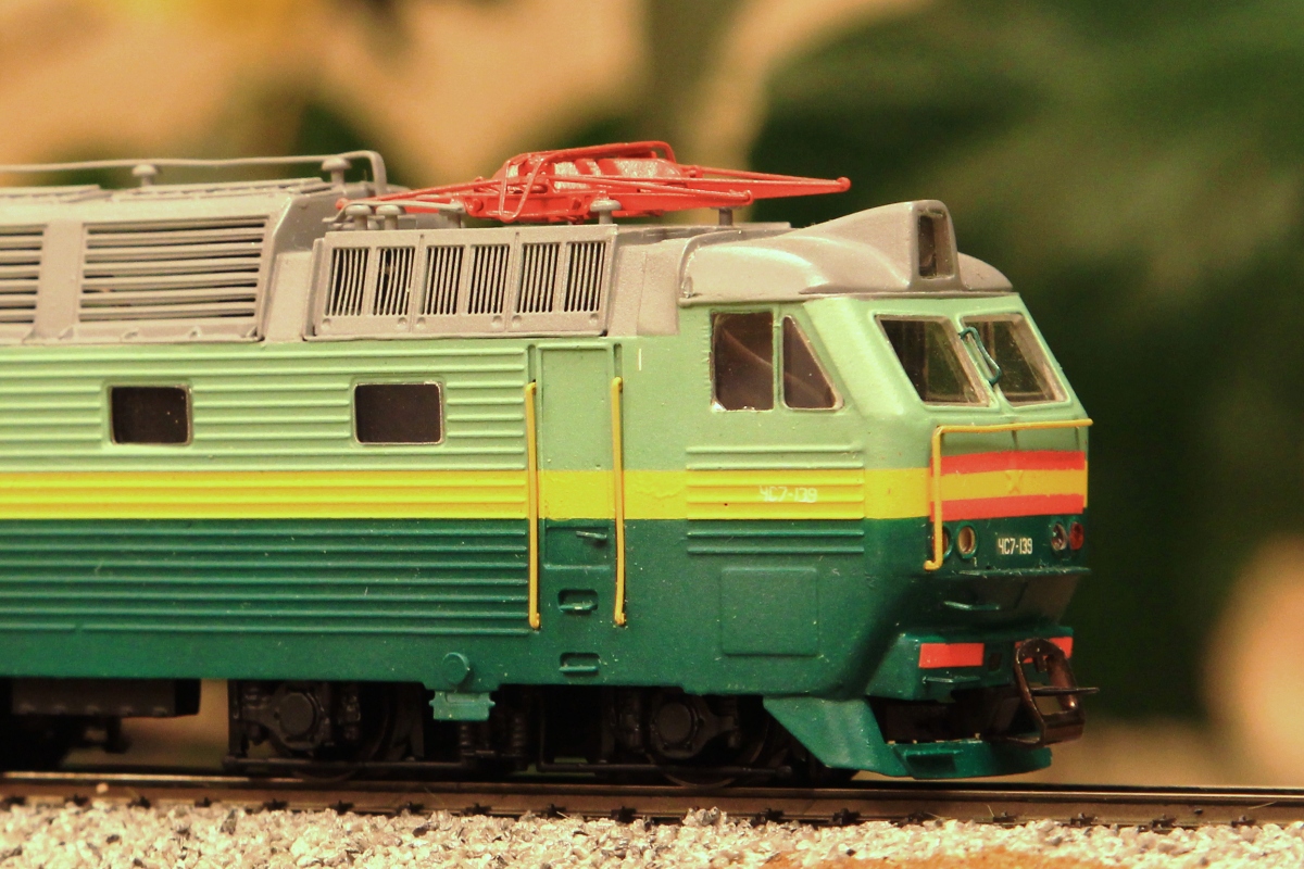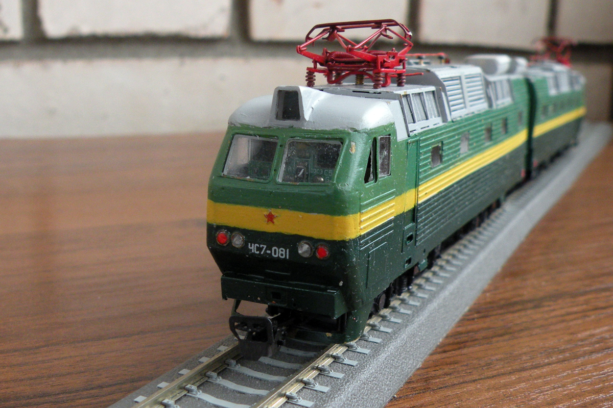 Разновидности: "кит" для самостоятельной сборки Эпоха: IV-V Принадлежность: СЖД, РЖД Фирма-производитель: Б.В.-Ж.Д. Год начала производства: 2011 (малая серия) Артикул: 1004 Описание моделиВ марте 2011 г. на выставке в Санкт-Петербурге Творческое объединение "Б.В.-Ж.Д." представило предварительный образец модели электровоза ЧС7. Модель изготовлена из травленой латуни в сотрудничестве с Мануфактурой "Норкин-Модель"; пантографы - от фирмы "СвеТТофор". Другие модели электровоза ЧС7: - от П.Шестакова; - от коллектива моделистов из Симферополя. Описание прототипаДвухсекционный электровоз ЧС7 был создан чехословацкой фирмой «Шкода» (заводской тип 82Е) как универсальный электровоз постоянного тока для вождения пассажирских поездов со скоростями до 160 км/ч и составами до 32 вагонов. Электровоз имел мощность длительного режима 6160 кВт и сцепной вес 172 т. В конструкции были применены многие аппараты электровозов ЧС2т, ЧС200 и ЧС6. Потребность в новой машине была вызвана тем, что шестиосные ЧС2 имели ограниченные тяговые возможности на участках с тяжёлым профилем пути, а восьмиосные ЧС200 и ЧС6 предназначались для работы на высоких скоростях с малым количеством остановок. Поставка ЧС7 в Советский Союз началась в 1983 г. Двадцать первых электровозов поступили в депо Челябинск Южно-Уральской ж.д. и в депо Москва- Киевская Московской ж.д. Всего, вплоть до 1992 г., в СССР и Россию было поставлено 286 электровозов этой серии. Ещё 5 ЧС7 Россия закупила в 1999 г. И ещё 30 машин закупила независимая Украина. В России электровозы этой серии эксплуатируются на Московской, Свердловской и Южно-Уральской ж.д.