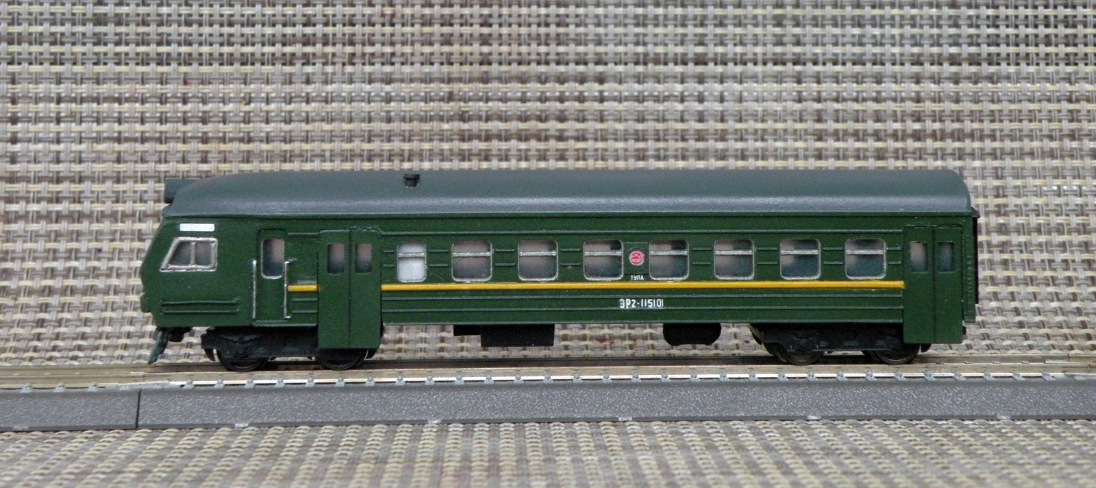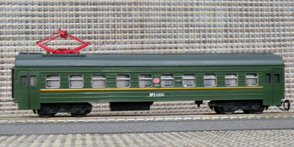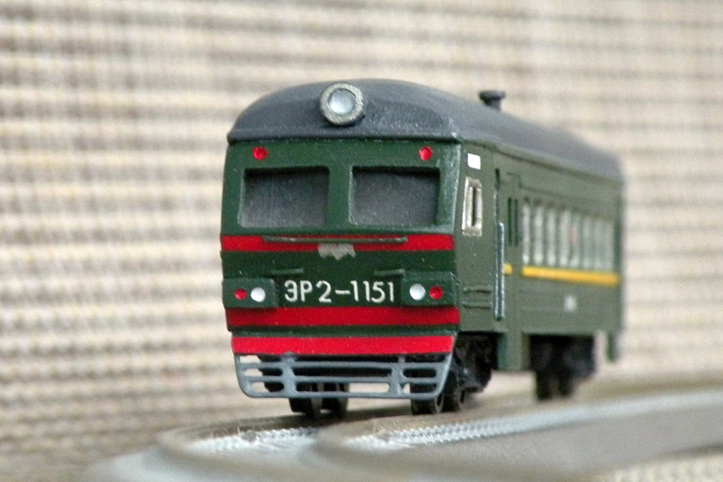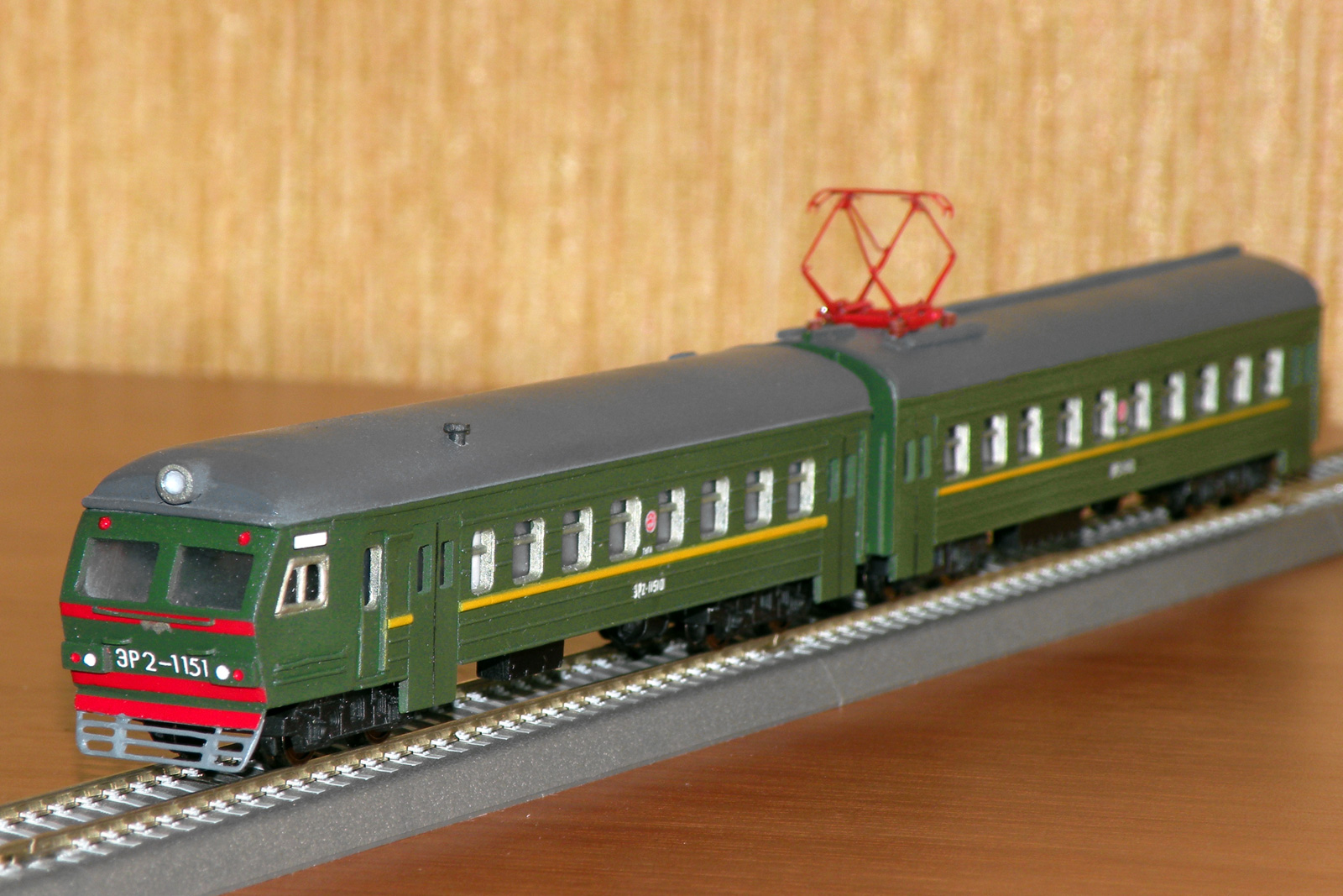 Эпоха: V Принадлежность: РЖД Фирма-производитель: Шустов А. Год начала производства: 2008 Описание моделиСтендовая модель электропоезда РЖД ЭР2-1151, депо Тула (А.Шустов) изготовлена в двухвагонном исполнении. Использованы корпуса, а также тележки "юниориских" 4-осных пассажирских вагонов от ВТТВ. Передняя часть головного вагона - авторская отливка из эпоксидной смолы. Достоверно известно о существовании одного экземпляра готовой модели в двухвагонном исполнении и нескольких отдельных отливок головной части. Другие модели электропоезда ЭР2 с изменённой формой кабины: - от Д.Денисова, - от Ю.Третьякова; - от "Parovoziki.ru" (малая серия). Описание прототипаЭлектропоезд постоянного тока ЭР2 с новой формой кабины изготавливался на Рижском вагоностроительном заводе с 1974 г. До настоящего времени в пассажирской эксплуатации ещё сохранилось много этих электропоездов.