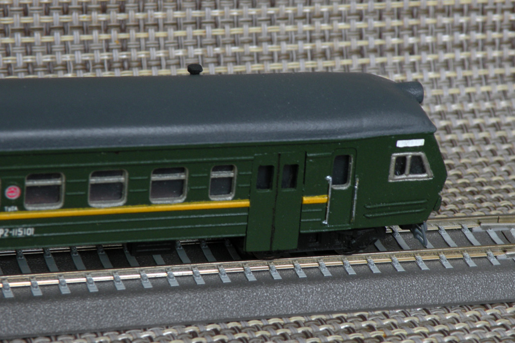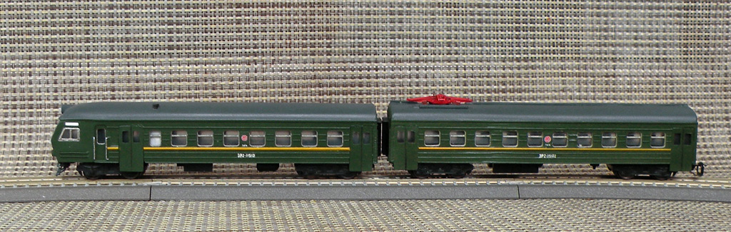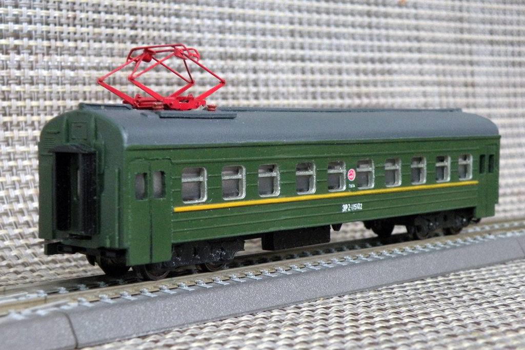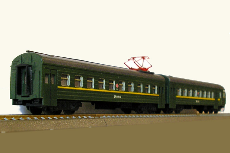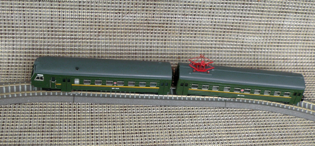 Эпоха: V Принадлежность: РЖД Фирма-производитель: Шустов А. Год начала производства: 2008 Описание моделиСтендовая модель электропоезда РЖД ЭР2-1151, депо Тула (А.Шустов) изготовлена в двухвагонном исполнении. Использованы корпуса, а также тележки "юниориских" 4-осных пассажирских вагонов от ВТТВ. Передняя часть головного вагона - авторская отливка из эпоксидной смолы. Достоверно известно о существовании одного экземпляра готовой модели в двухвагонном исполнении и нескольких отдельных отливок головной части. Другие модели электропоезда ЭР2 с изменённой формой кабины: - от Д.Денисова, - от Ю.Третьякова; - от "Parovoziki.ru" (малая серия). Описание прототипаЭлектропоезд постоянного тока ЭР2 с новой формой кабины изготавливался на Рижском вагоностроительном заводе с 1974 г. До настоящего времени в пассажирской эксплуатации ещё сохранилось много этих электропоездов.