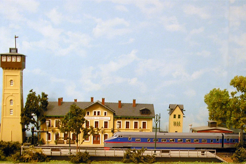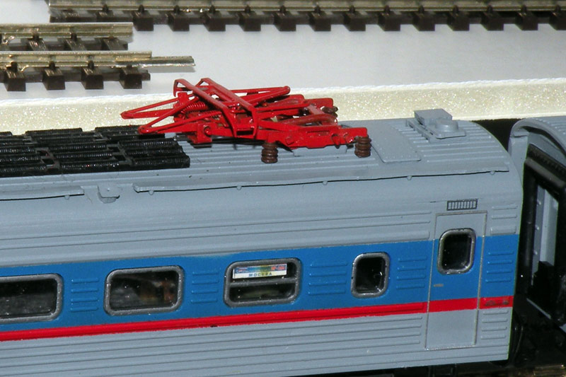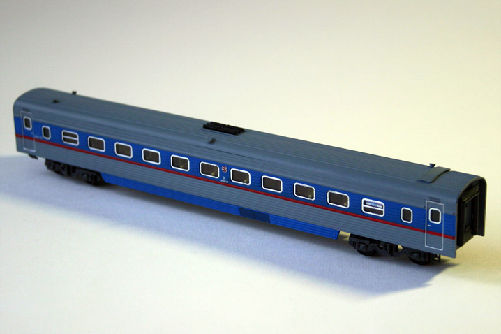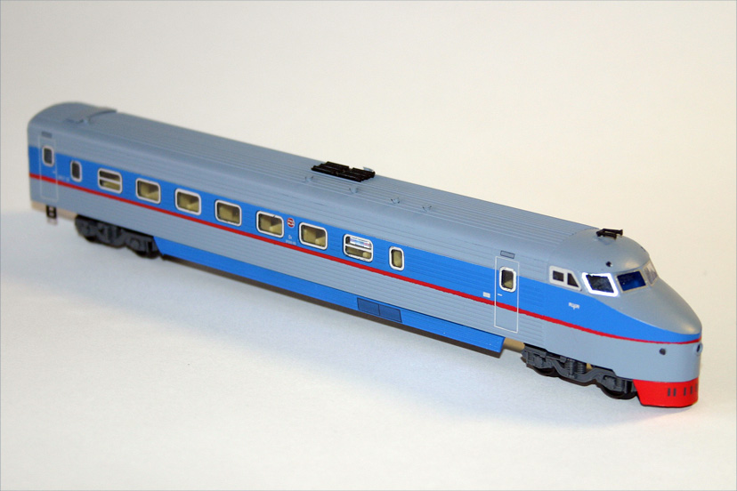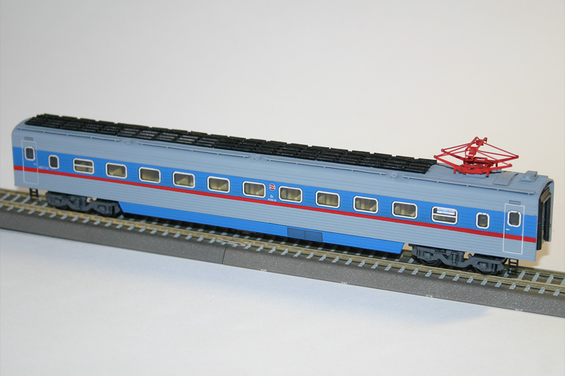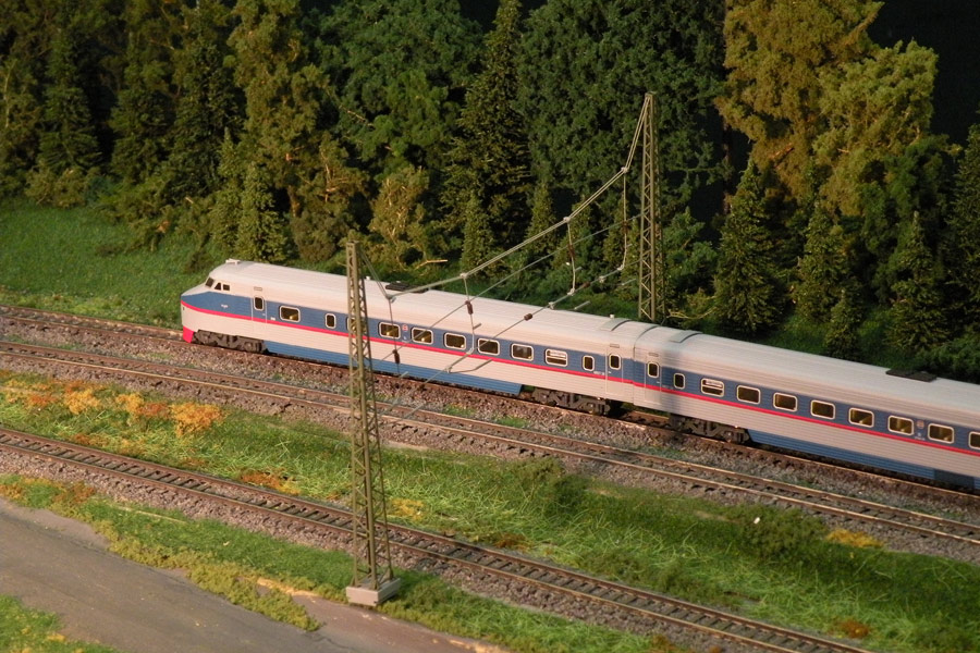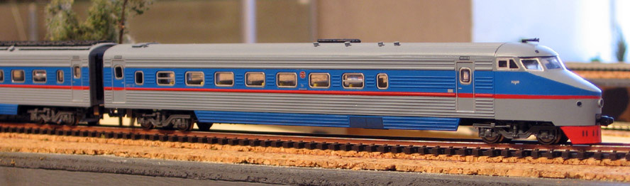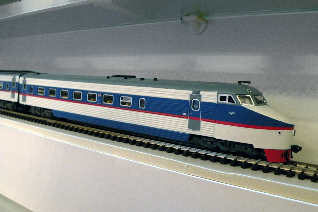 Эпоха: V Принадлежность: РЖД Фирма-производитель: В.Нетужилов. Год начала производства: 2006. Описание моделиМодель скоростного электропоезда ЭР200 (6-вагонный состав) изготовлена по мелкосерийной технологии по заказу депо Металлострой Октябрьской ж.д. В состав модели входят вагоны: головные (№№ 101 и 103), прицепные токосъёмные (№№ 122 и 132) и прицепные без пантографов (№№124 и 134). Модель стендовая; установка привода не предусмотрена. Освещения нет, но его установка в принципе возможна. Такого рода доработку (с использованием элементов ходовки от тепловоза BR215/218 от "Tillig") совершил в 2007 г. наро-фоминский моделист А.Мурашов. На модели немало накладных деталей. Установлены стандартные пантографы поизодства Tillig, не используемые на скоростном ЭПС. В салонах - интерьер, приблизительно соответствующий оригиналу. Описание прототипаПодготовительные работы по созданию скоростного моторвагонного поезда для линии Москва-Ленинград начались в 1965 г. В 1969 г. Рижский вагонзавод завершил проектирование 14-вагонного поезда, Постройка первого шестивагонного поезда осуществлялась заводом в 1973-1974 гг. в кооперации с пятьюдесятью конструкторскими бюро и многими заводами Советского Союза. Электропоезд получил обозначение ЭР200: электропоезд рижский, максимальная скорость 200 км/ч. Первая обкатка поезда 17 апреля 1974 г. дала максимальную скорость 160 км/ч., в декабре она была доведена до 206 км/ч. В период с начала 1975 г. до марта 1984 г. осуществлялась "доводка" поезда до эксплуатационного состояния. Регулярная эксплуатация первого поезда ЭР200 началсь 1 марта 1984 г., а последняя поездка состоялась 15 сентября 1995 г. За это время не было отменено ни одной графиковой поездки. В настоящее время в депо Металлострой петербургского ж.д. узла находится в эксплуатации два состава серии ЭР200. До сегодняшнего дня это самый быстрый поезд страны, проходящий расстояние между двумя столицами за 3 часа 55 минут (с лета 2006 г.). Летом 2008 г. состав эр200-1 установлен на вечную стоянку в музей на Варшавском вокзале в Петербурге.