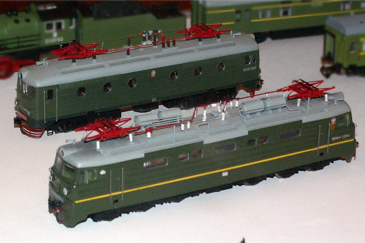 Эпоха: IV Принадлежность: СЖД Фирма-производитель: Александр Шувиков Описание моделиМодель электровоза ВЛ60п/к-2285 изготовлена московским моделистом Александром Шувиковым. Другие модели электровоза ВЛ60: - от "Gonchar TT" (малая серия). Описание прототипаВ 1957-58 гг. Новочеркасский электровозостроительный завод построил два грузовых шестиосных электровоза переменного тока (50 Гц, 20 кВ; впоследствии – 25 кВ) мощностью 4000 кВт, разработанных по собственному проекту, а с 1959 г строил эти локомотивы серийно. Опытные электровозы некоторое время обозначались серией Н6О (Новочеркасский, 6-осный, однофазный), а затем серия получила стандартное для советских электровозов обозначение ВЛ60 (Владимир Ленин). Электровозы имели конструкционную скорость 110 км/ч и опорно-осевое подвешивание электродвигателей. Механическая часть ВЛ60 значительно отличалась от всех ранее построенных в СССР электровозов – так, впервые кузов электровоза служил для передачи тягового усилия, и автосцепки размещались непосредственно на нём, а не на тележках. Кроме того, это был первый магистральный электровоз, спроектированный без буферов. На электровозах были установлены ртутные выпрямители (игнитроны). В период с 1959 по 1965 гг. было выпущено 1728 электровозов ВЛ60 (основной серии), которые стали основными грузовыми электровозами на линиях, электрифицированных на переменном токе. Первоначально они поступали на Красноярскую и Восточно-Сибирскую дороги, затем на Северо-Кавказскую, Горьковскую и ряд других дорог. В период 1962-65 гг. часть электровозов серии ВЛ60 выпускалась в пассажирском варианте (ВЛ60П) – всего 301 локомотив. В 1963-1966 гг. выпускались электровозы с рекуперативным торможением ВЛ60Р – 87 локомотивов, которые поступили на Восточно-Сибирскую и Дальневосточную железные дороги. С 1965 по 1967 гг. серийно строились электровозы ВЛ60К с кремниевыми выпрямителями переменного тока, значительно более удобными в эксплуатации, чем ртутные – 497 электровозов. Большинство их было направлено на Приволжскую, Московскую и Южно-Уральскую дороги. В период 1966-73 гг. ранее выпущенные электровозы ВЛ60 и ВЛ60П были модернизированы – ртутные выпрямители были на них заменены на кремниевые, и электровозы получили соответственно обозначения ВЛ60К и ВЛ60ПК. В 1987-90 гг. часть электровозов ВЛ60К начала эксплуатироваться в виде двухсекционных сцепов, которые получили обозначение серии 2ВЛ60К и новые номера. Всего было сделано около 550 таких сцепов, работающих на сети РЖД до сегодняшнего дня. Электровозы ВЛ60К можно встретить в железнодорожных музеях Санкт-Петербурга (ВЛ60К-065), Новосибирска (ВЛ60К-649),Челябинска (ВЛ60к-2557, наст. номер 2254).
