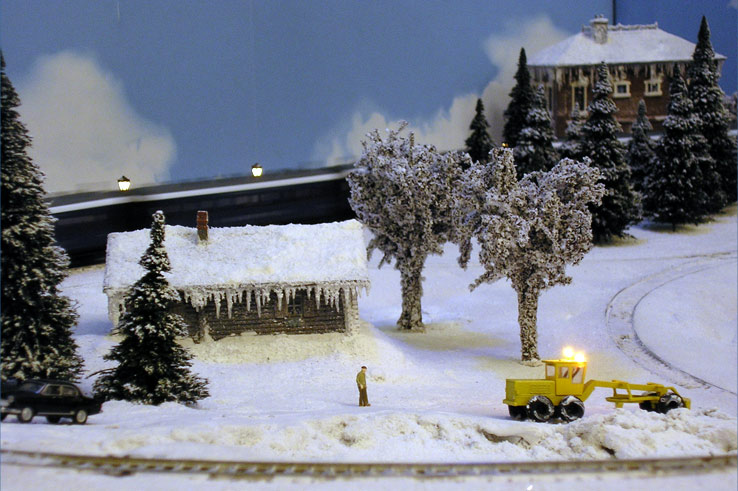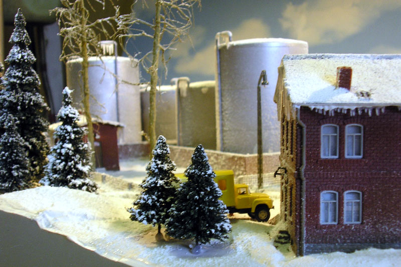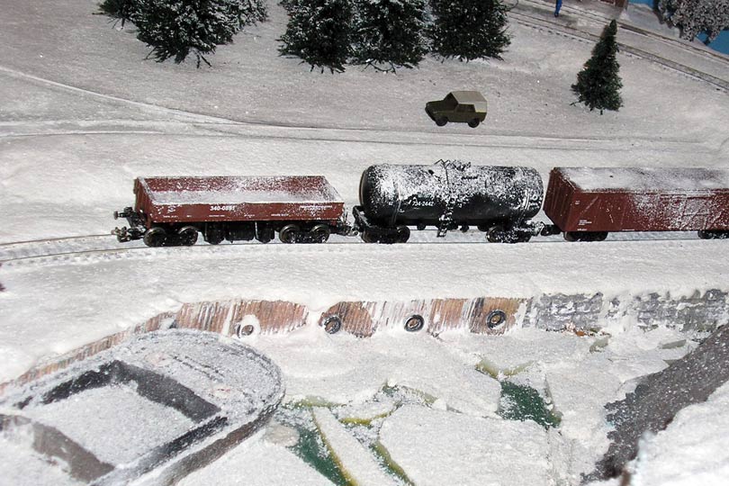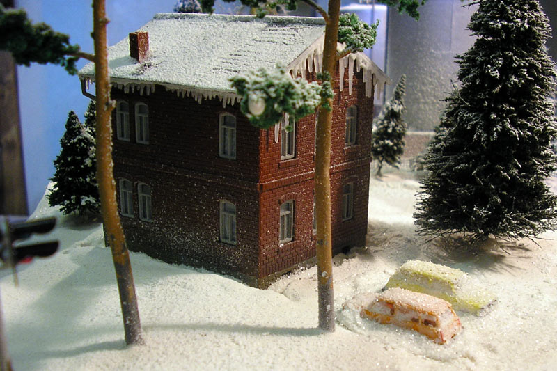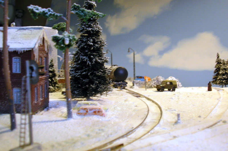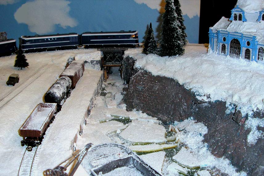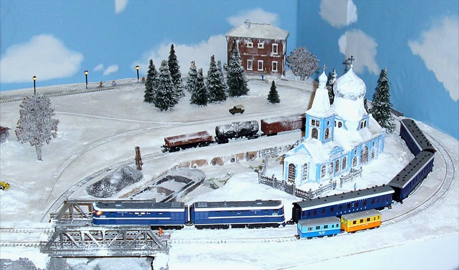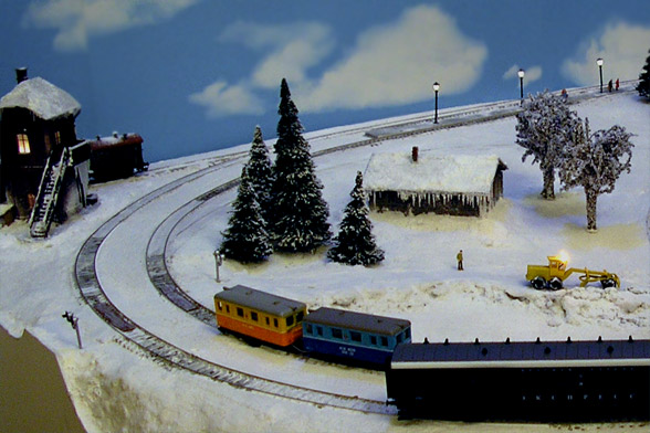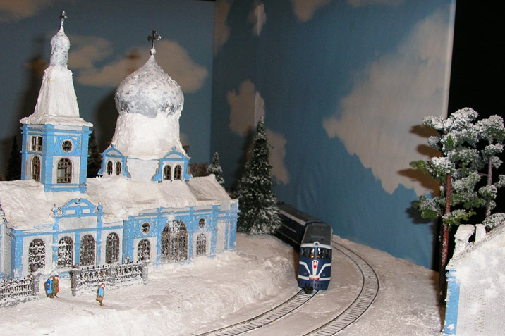 Рельсовая схма макета проста - двухпутный овал с ответвлениями. Из железнодорожных сооружений - станция, пост, двухпутный мост и однопутный тоннель-путепровод. Макет украшают здание церкви и дом причта (собраны из деталей вокзала в Н0, не считая самостоятельно изготовленных куполов), река с двумя небольшими судами, дожидающимися весны, одноэтажный жилой дом, а также много мелких интересных деталей. Внимание сразу же привлекает снегоуборочная машина - на ней смонтированы действующие фонари-мигалки. ярко перемигиваясь, они, в сочетании с заснеженной поверхностью и еловым перелеском создают совсем новогоднее настроение.