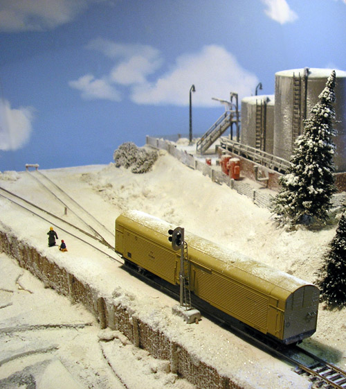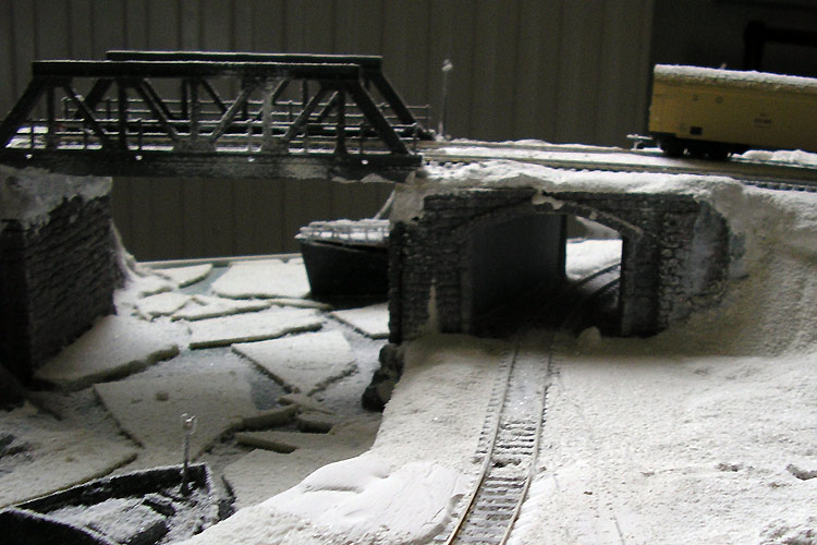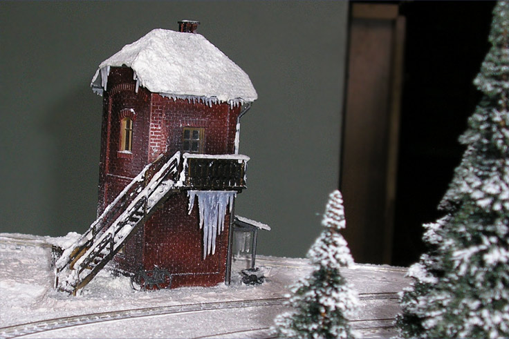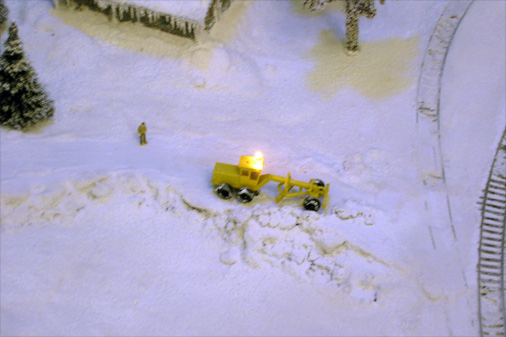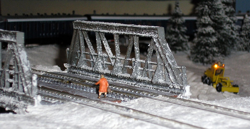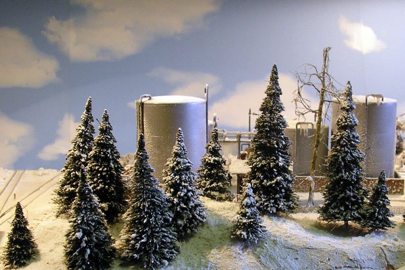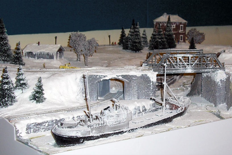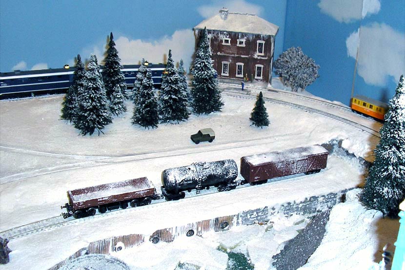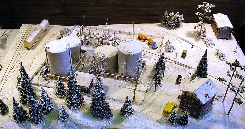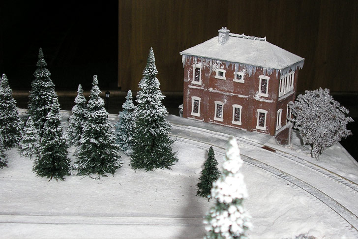 Рельсовая схма макета проста - двухпутный овал с ответвлениями. Из железнодорожных сооружений - станция, пост, двухпутный мост и однопутный тоннель-путепровод. Макет украшают здание церкви и дом причта (собраны из деталей вокзала в Н0, не считая самостоятельно изготовленных куполов), река с двумя небольшими судами, дожидающимися весны, одноэтажный жилой дом, а также много мелких интересных деталей. Внимание сразу же привлекает снегоуборочная машина - на ней смонтированы действующие фонари-мигалки. ярко перемигиваясь, они, в сочетании с заснеженной поверхностью и еловым перелеском создают совсем новогоднее настроение.