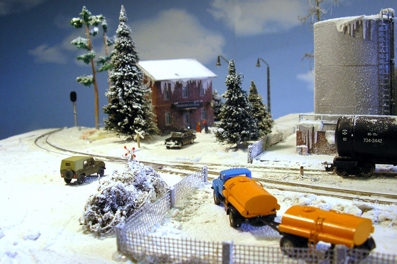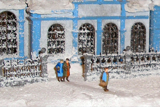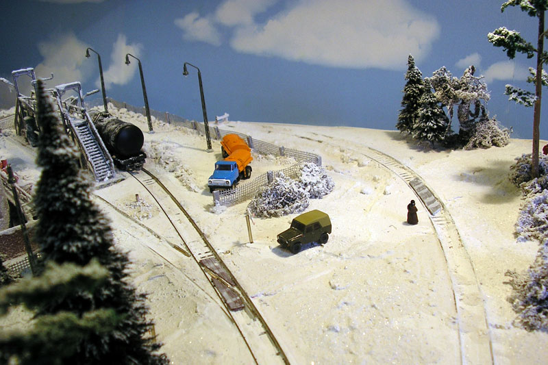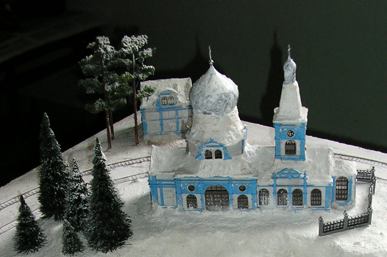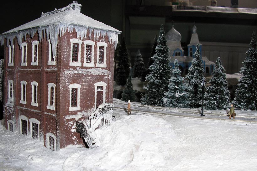 Макет, в существующем виде, впервые был представлен в марте 2007 г. на выставке в ЦМЖТ. Авторы макета - Леонид Москалёв и Алексей Земсков. Тема макета - русская зима - задаёт целую гамму разнообразных настроений, хорошо знакомых каждому нашему соотечественнику. В зависимости от освещения и от ракурса разглядывания макета его восприятие меняется, что лучше всего проследить по представленным фотографиям.