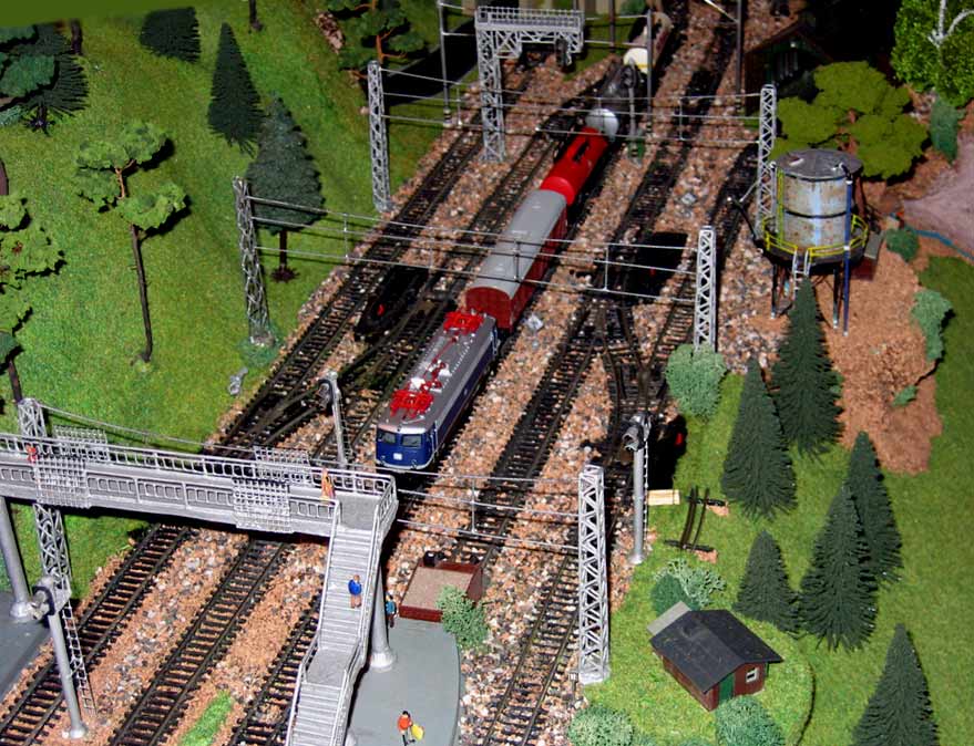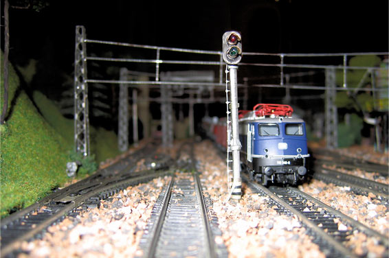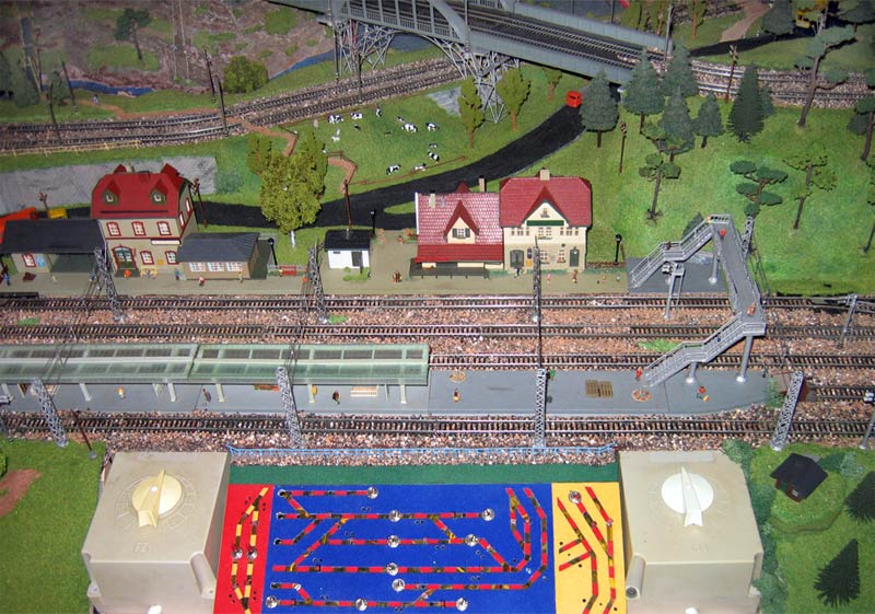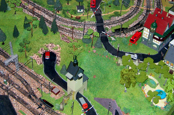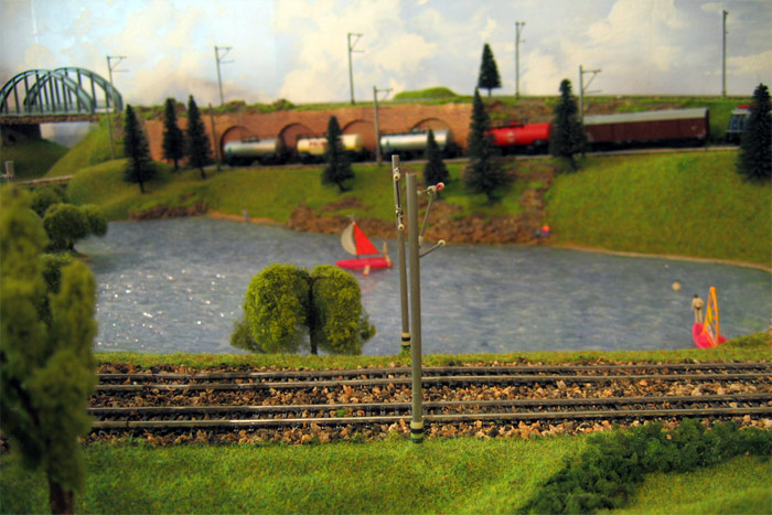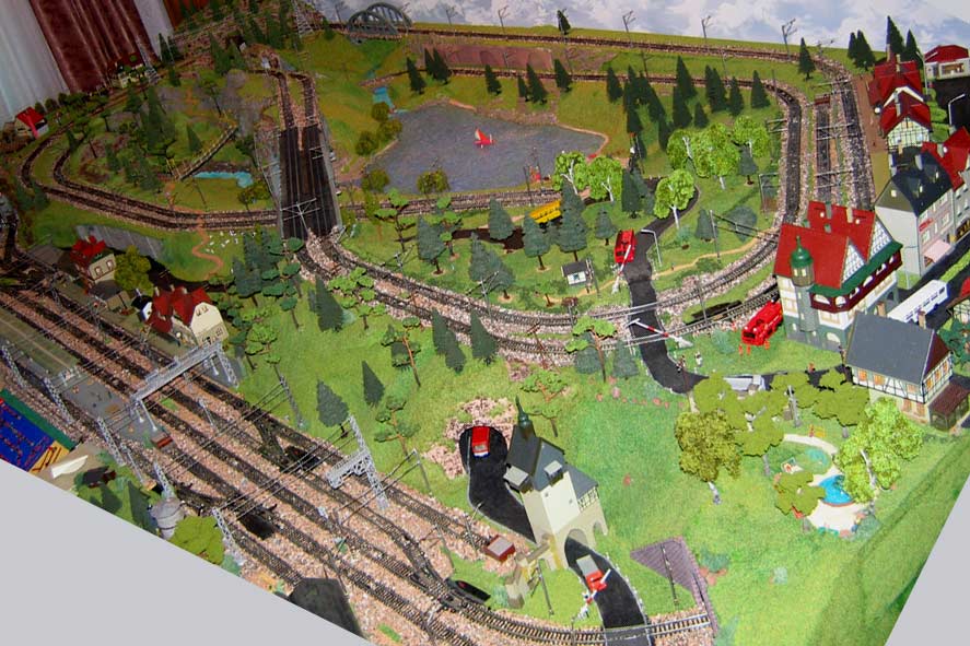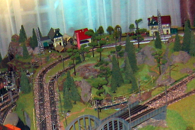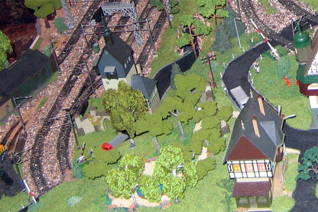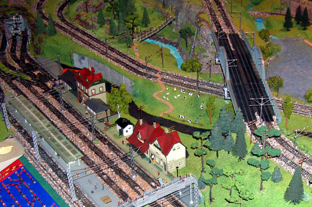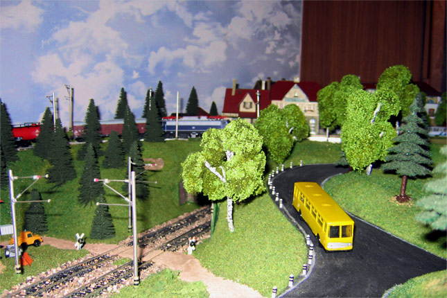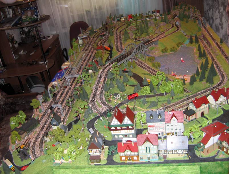 Большой домашний макет Александра Владимировича Плахова был создан два десятилетия тому назад в Туле, успешно пережил два переезда и теперь находится в г.Протвино Московской области. На макете, кроме хорошо знакомых строений немецкого производства, есть немало элементов, изготовленных автором макета самостоятельно. Во-первых, это металлические конструкции, с большим мастерством изготовленные из проволоки и придающие макету самобытный вид: мосты, опоры, контактная сеть, пункт экипировки локомотивов. Во-вторых, все светофоры на макете самодельные, на основе ламп накаливания. (Управление движением поездов производится с использованием самодельного диспетчесркого пульта).