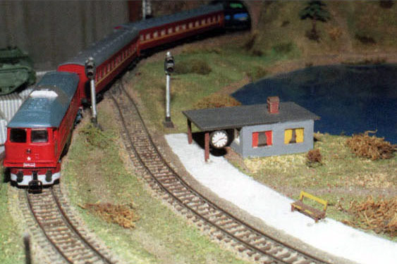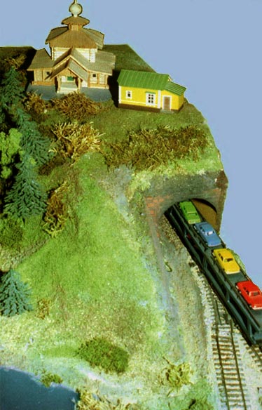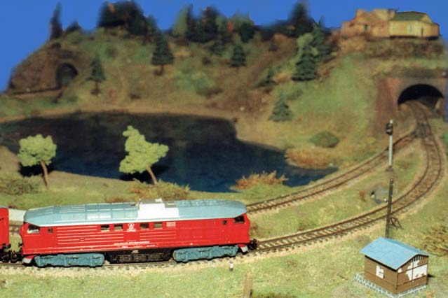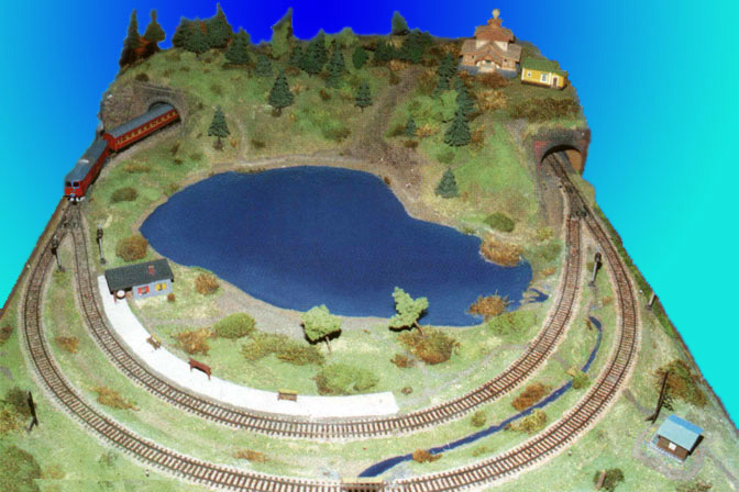 Демонстрационный макет питерской фирмы «ТТ-модель». Этот макет уже не первый раз выставляется на традиционных выставках «Железнодорожная модель» в ЦМЖТ в городе на Неве, и каждый раз пользуется вниманием у посетителей. Секрет успеха прост — ничего лишнего: рельсовый овал, двухпутный разъезд, тоннель, а в центре — большое озеро с прозрачной голубой водой. Без сомнения, макет вобрал в себя все известные премущества «настольного типоразмера». Как поведала нам директор совместного российско-германского предприятия «ТТ-модель», госпожа Светлана Сергеевна Кукоба, макет был построен в 1997 году сотрудником фирмы Юрием Кацаповым. Остается лишь пожалеть,что нам пока ничего не известно о других работах этого, безусловно, талантливого моделиста. Общие размеры макета — 1010 х 790 мм. Применены западногерманские путевой материал и стрелочные переводы. Травяной покров сымитирован опилками, а водная гладь весьма удачно получилась из куска прозрачного пластика. Макет надежен в работе и удобен для транспортировки. Автор текста Леонид Москалёв. Журнал "Железнодорожное дело".