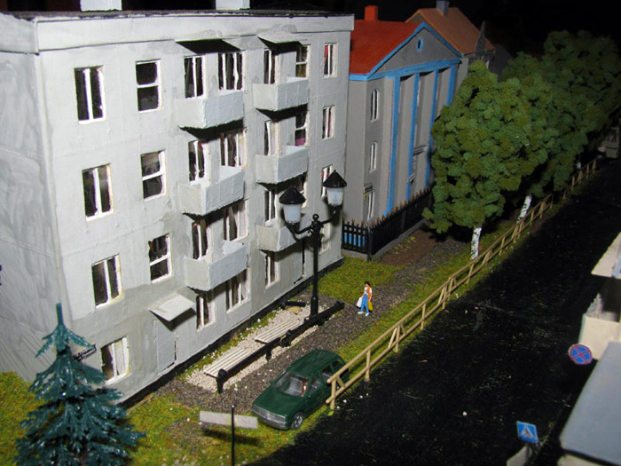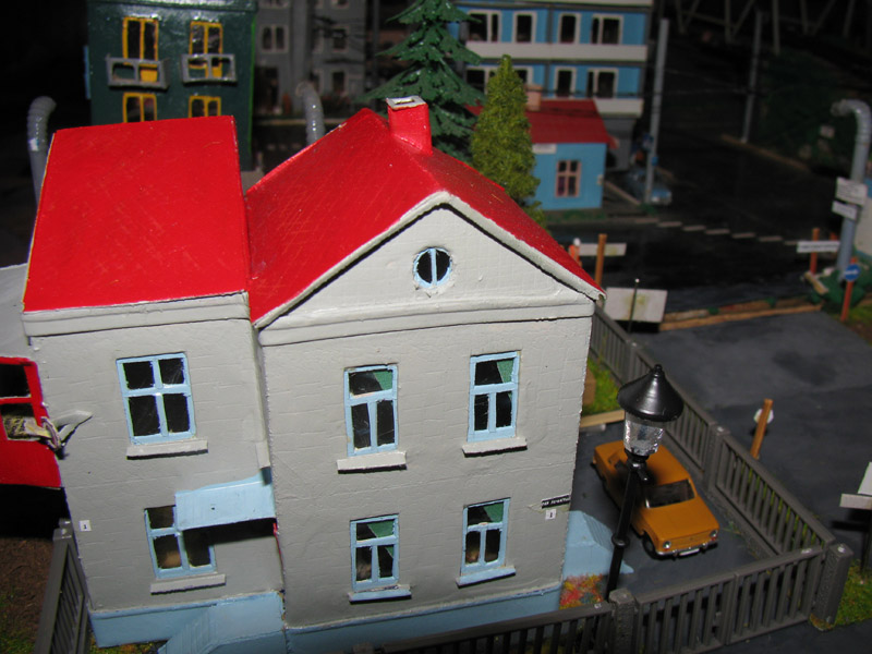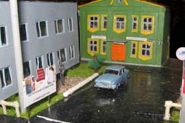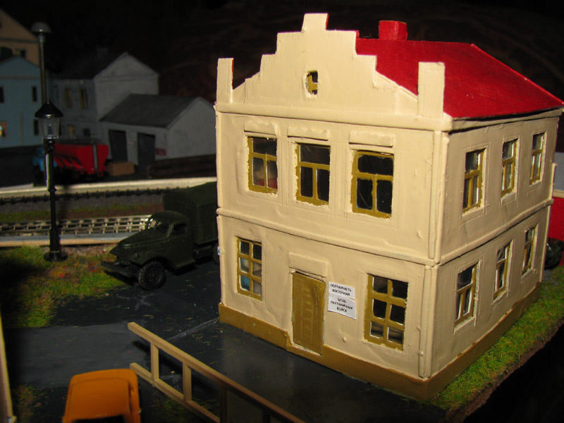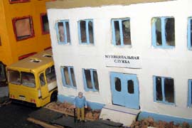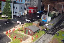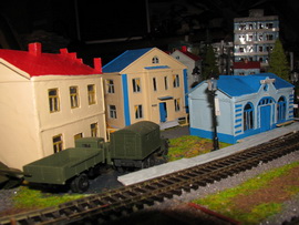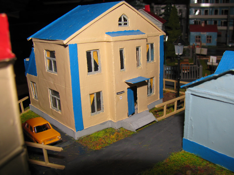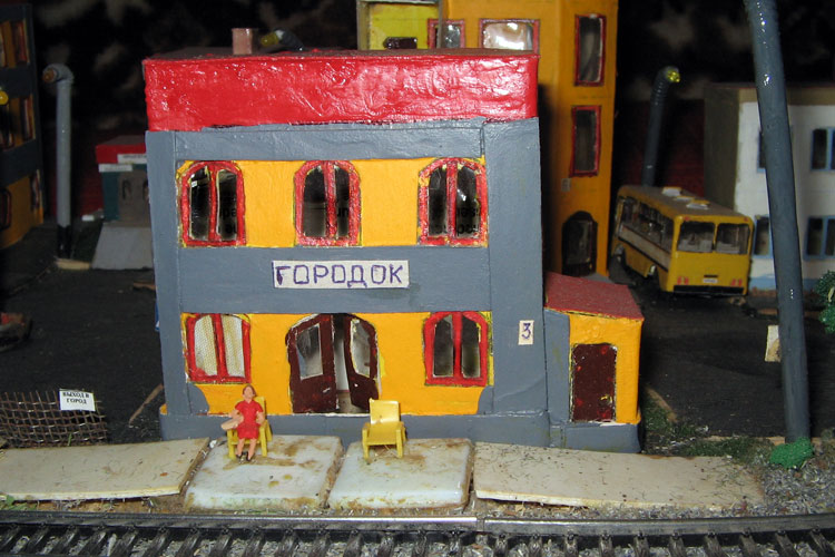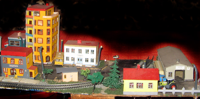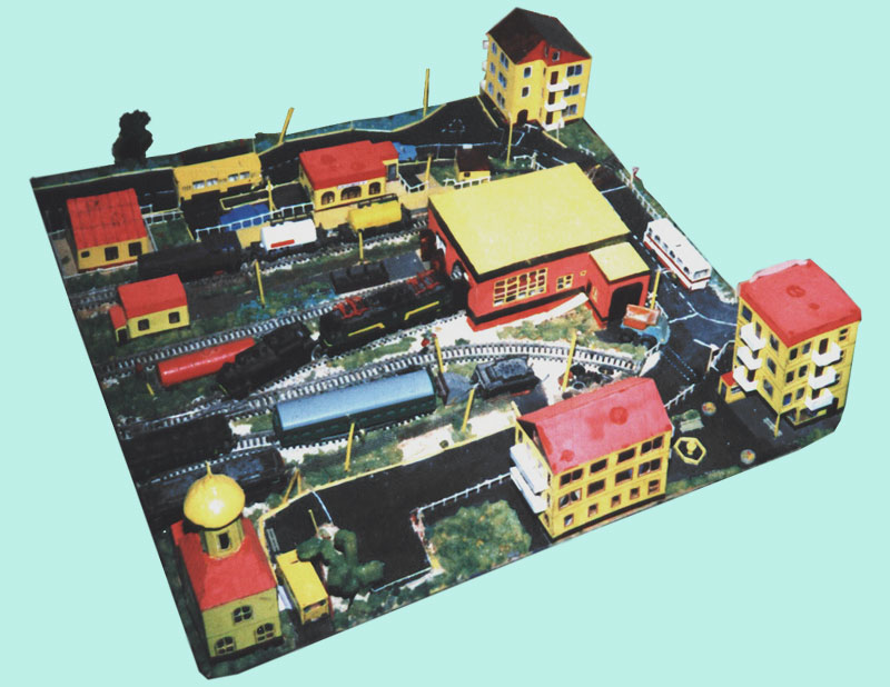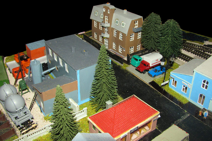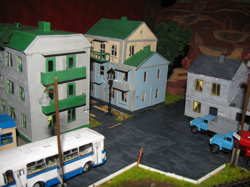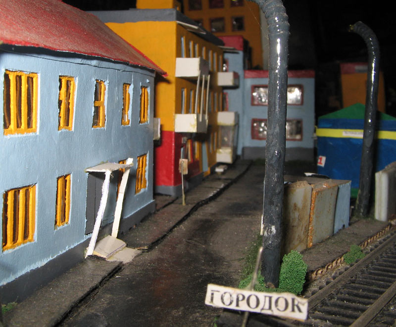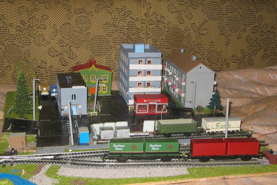 ИСТОРИЯ Если имеется железная дорога, хоть и миниатюрная, значит должно быть депо! Долгое время в качестве него использовались различные тупики на большом макете, иногда обрастая заборами, но конфигурация макета и его застройка не позволяла соорудить регулярное депо с ремонтным цехом. Выход был найден в постройке отдельной диорамы. Диорама была построена в 1997 году, аккурат к юбилею появления у меня модельной железной дороги в типоразмере ТТ, а соответственно и "Дня рождения" моей миниатюрной дороги! Основная концепция диорамы: однопутная железнодорожная станция, а рядом территория локомотивного депо. В 1997 году у меня был как раз финансовый кризис, да и вообще в то время было трудно что-нибудь купить для железной дороги, - в результате пошли в ход старые рельсы от ВТТВ, ранее уже успевшие послужить на основном макете и не блиставшие особым качеством. Зато все здания, сооружения были изготовлены самостоятельно из картона, деревья - из проволоки и крашенного поролона, имитация травяного покрова - из крашеного поролона и присыпки в виде крашенных опилок, насыпь сымитирована песком и мелким щебнем. Вокруг станции и депо находилась жилая зона, включающая как жилые дома, так и магазины, киоски. Был изготовлен сквер с фонтаном. РЕКОНСТРУКЦИЯ К лету 2007 года диорама представляла нерадостное зрелище. Находившись последние лет 6-7 на шкафу, она обросла слоем пыли, само депо скорее напоминало свалку. Было принято решение - диораму модернизировать и расширить. Для этого были заново изготовлены действующие фонари, а также освещение зданий; демонтированы все старые пути и присыпка, подремонтированы старые здания. Полностью обновлено и расширено путевое хозяйство с использованием как новых рельс, так и б/у, но в хорошем состоянии, заново сымитирована специальной присыпкой трава, деревья теперь от Noch. Дополнительно было изготовлено два здания: Клуб железнодорожников и Управление ж/д и поселка. Кроме того, использовано несколько б/у зданий от VERO, подаренные коллегой. Территория депо перенесена на окраину, появился тупик для разгрузочно-погрузочных работ. Площадь диорамы увеличена практически в 2 раза, благодаря чему в Д-Штадте появился новый район. Подробное описание диорамы "Городок". ИСТОРИЯ В 1996 году у меня была мания жилищного строительства на первом и единственном тогда макете, плюс сооружались здания необходимой инфраструктуры. Оказалось на макете не хватило места для больницы. И с этой целью была сооружена диорама Городок, где была больница, несколько жилых зданий, вокзал, кафе, магазин. Диорама была изготовлена летом 1997 года. Небольшая по размеру, она выглядела не вполне реалистично, можно было представить себе окружающее пространство с небольшим скоплением зданий. Это несоответствие практически исчезло после расширения диорамы в 2007 году, когда диорама была расширена в более чем два раза. После реконструкции появился тупик на станции. ОБРАЗ Городок пронзает автомагистраль, по окраине идет железнодорожная однопутка, по одну сторону которого располагается частный дом и ферма. В основной части города расположены вокзал, бензоколонка, больница, административное здание, ресторан, жилой сектор. Все здания самодельные из картона, к диораме «приписаны» несколько автотранспортных средств, включая самодельный автобус ПАЗ-3205, фирменные ав