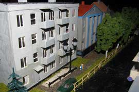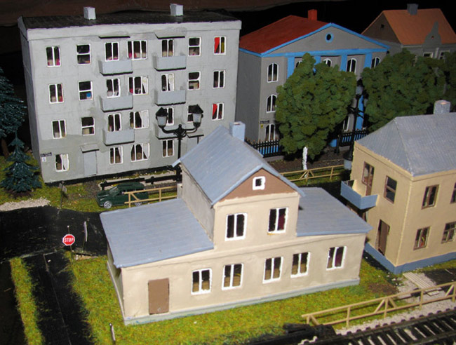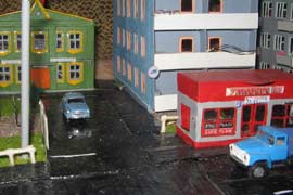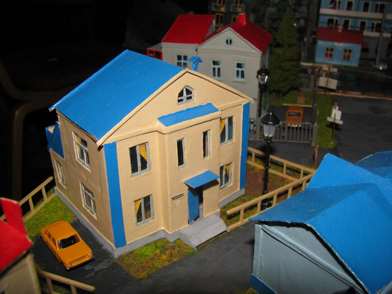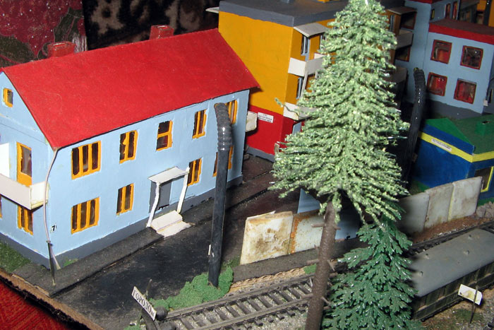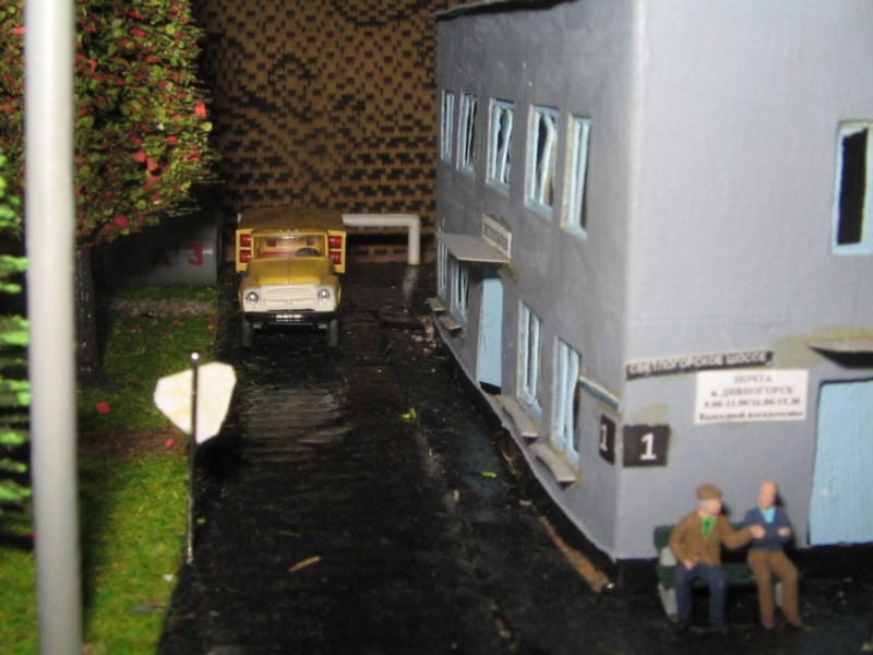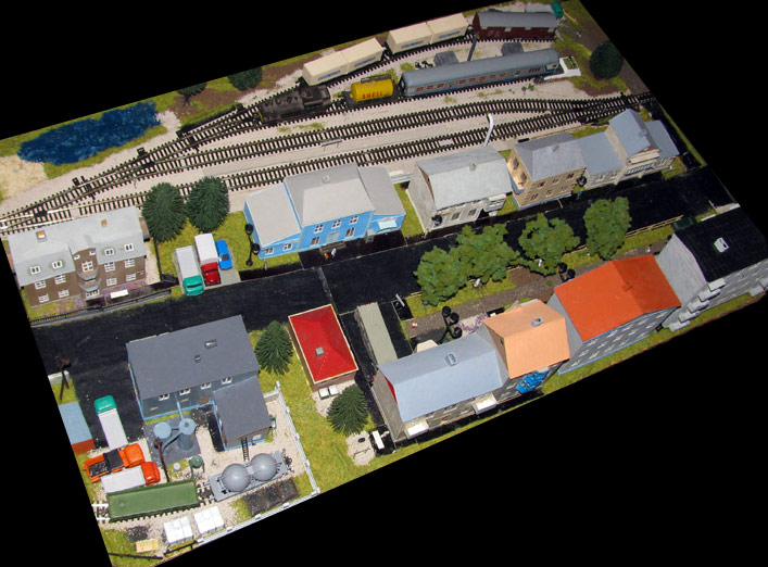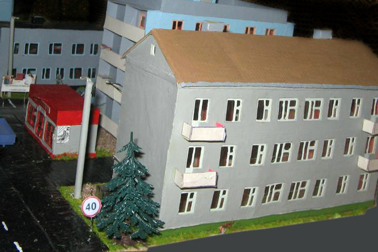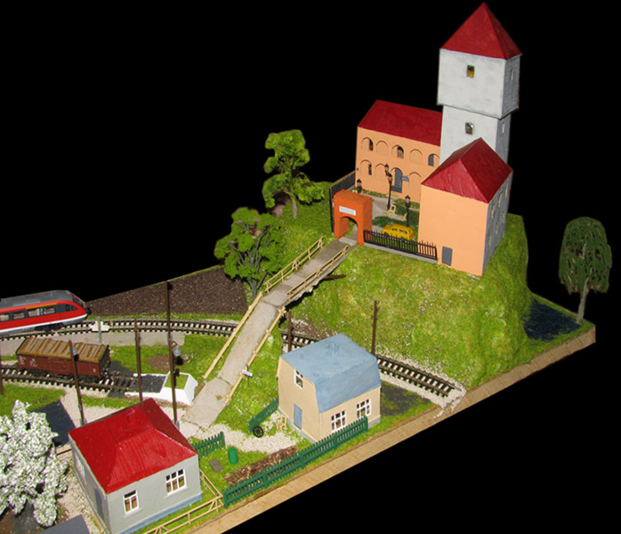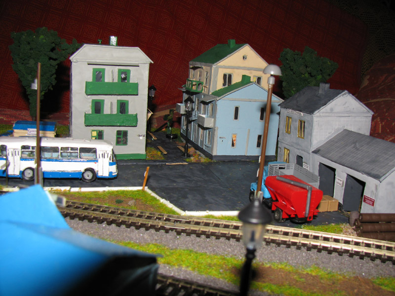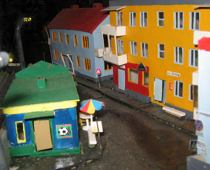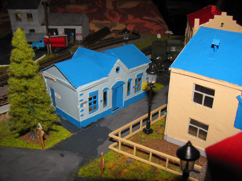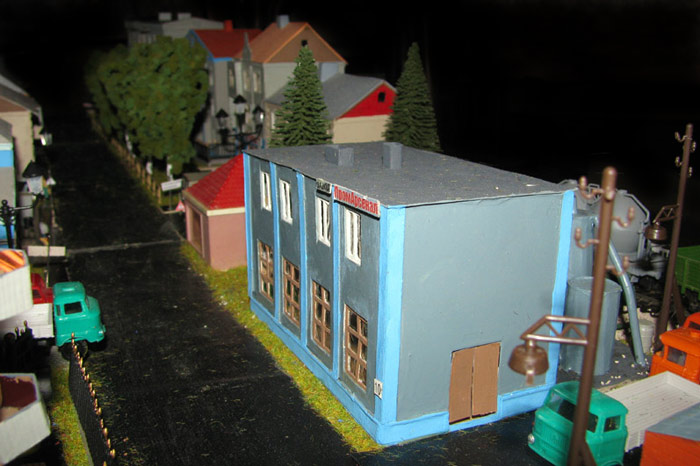 ИСТОРИЯ Если имеется железная дорога, хоть и миниатюрная, значит должно быть депо! Долгое время в качестве него использовались различные тупики на большом макете, иногда обрастая заборами, но конфигурация макета и его застройка не позволяла соорудить регулярное депо с ремонтным цехом. Выход был найден в постройке отдельной диорамы. Диорама была построена в 1997 году, аккурат к юбилею появления у меня модельной железной дороги в типоразмере ТТ, а соответственно и "Дня рождения" моей миниатюрной дороги! Основная концепция диорамы: однопутная железнодорожная станция, а рядом территория локомотивного депо. В 1997 году у меня был как раз финансовый кризис, да и вообще в то время было трудно что-нибудь купить для железной дороги, - в результате пошли в ход старые рельсы от ВТТВ, ранее уже успевшие послужить на основном макете и не блиставшие особым качеством. Зато все здания, сооружения были изготовлены самостоятельно из картона, деревья - из проволоки и крашенного поролона, имитация травяного покрова - из крашеного поролона и присыпки в виде крашенных опилок, насыпь сымитирована песком и мелким щебнем. Вокруг станции и депо находилась жилая зона, включающая как жилые дома, так и магазины, киоски. Был изготовлен сквер с фонтаном. РЕКОНСТРУКЦИЯ К лету 2007 года диорама представляла нерадостное зрелище. Находившись последние лет 6-7 на шкафу, она обросла слоем пыли, само депо скорее напоминало свалку. Было принято решение - диораму модернизировать и расширить. Для этого были заново изготовлены действующие фонари, а также освещение зданий; демонтированы все старые пути и присыпка, подремонтированы старые здания. Полностью обновлено и расширено путевое хозяйство с использованием как новых рельс, так и б/у, но в хорошем состоянии, заново сымитирована специальной присыпкой трава, деревья теперь от Noch. Дополнительно было изготовлено два здания: Клуб железнодорожников и Управление ж/д и поселка. Кроме того, использовано несколько б/у зданий от VERO, подаренные коллегой. Территория депо перенесена на окраину, появился тупик для разгрузочно-погрузочных работ. Площадь диорамы увеличена практически в 2 раза, благодаря чему в Д-Штадте появился новый район. Подробное описание диорамы "Городок". ИСТОРИЯ В 1996 году у меня была мания жилищного строительства на первом и единственном тогда макете, плюс сооружались здания необходимой инфраструктуры. Оказалось на макете не хватило места для больницы. И с этой целью была сооружена диорама Городок, где была больница, несколько жилых зданий, вокзал, кафе, магазин. Диорама была изготовлена летом 1997 года. Небольшая по размеру, она выглядела не вполне реалистично, можно было представить себе окружающее пространство с небольшим скоплением зданий. Это несоответствие практически исчезло после расширения диорамы в 2007 году, когда диорама была расширена в более чем два раза. После реконструкции появился тупик на станции. ОБРАЗ Городок пронзает автомагистраль, по окраине идет железнодорожная однопутка, по одну сторону которого располагается частный дом и ферма. В основной части города расположены вокзал, бензоколонка, больница, административное здание, ресторан, жилой сектор. Все здания самодельные из картона, к диораме «приписаны» несколько автотранспортных средств, включая самодельный автобус ПАЗ-3205, фирменные ав