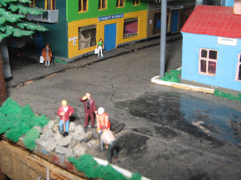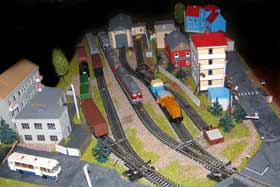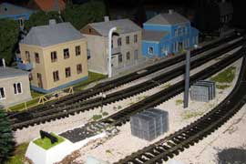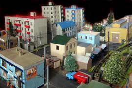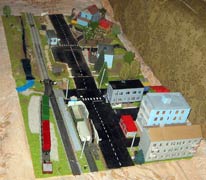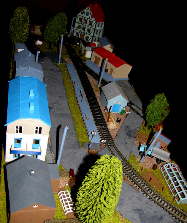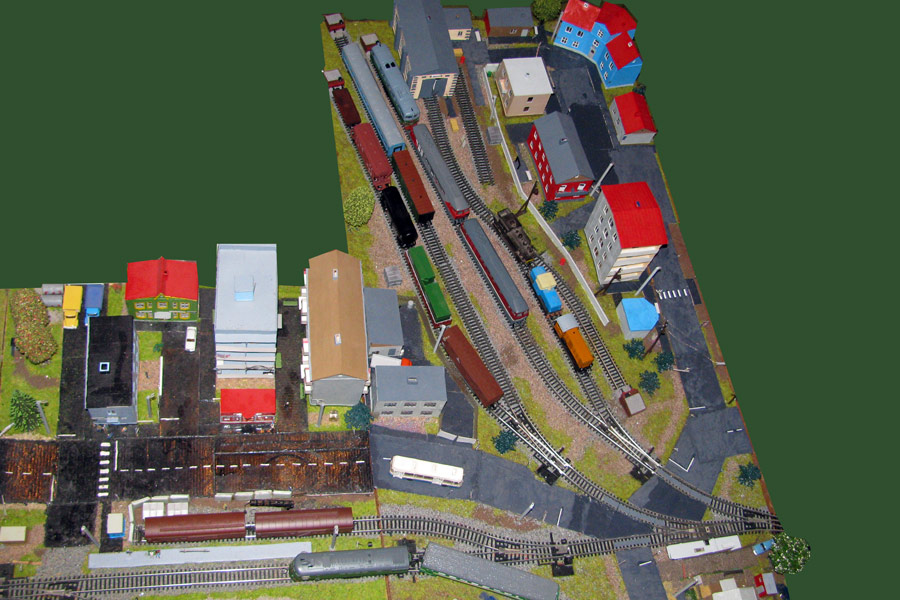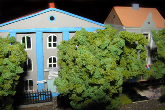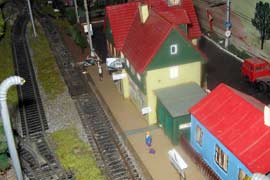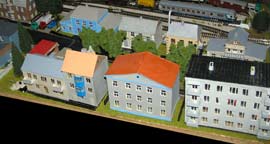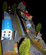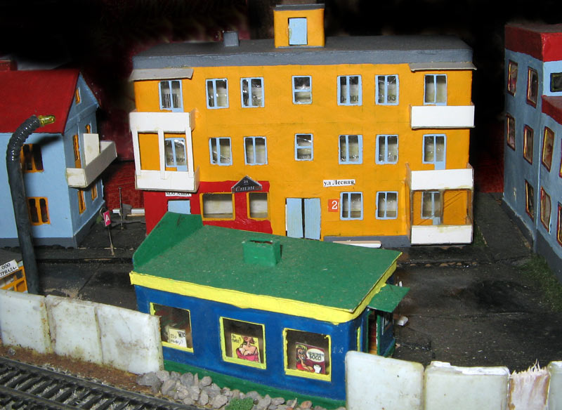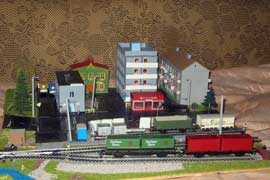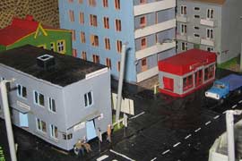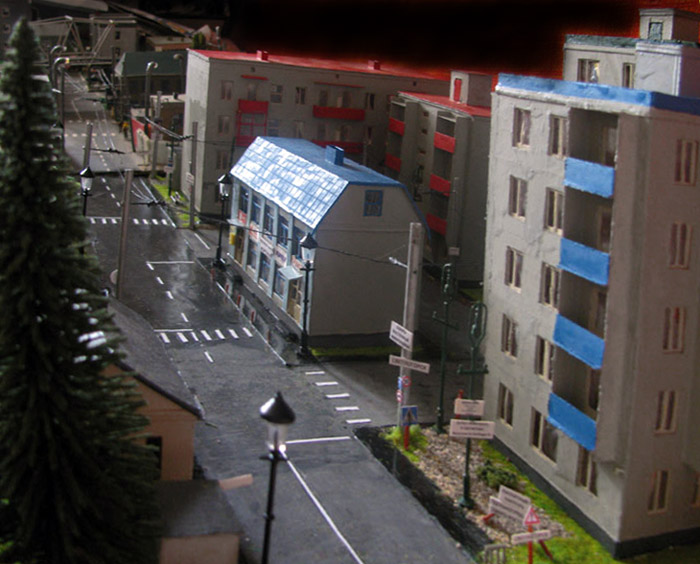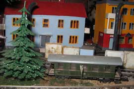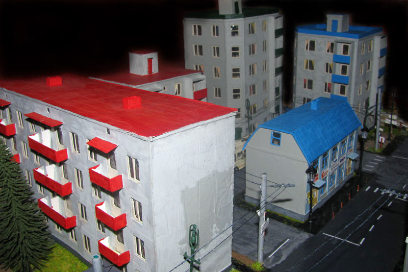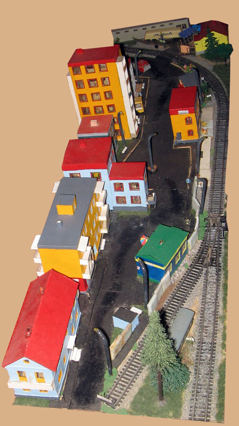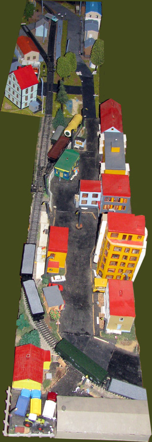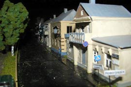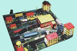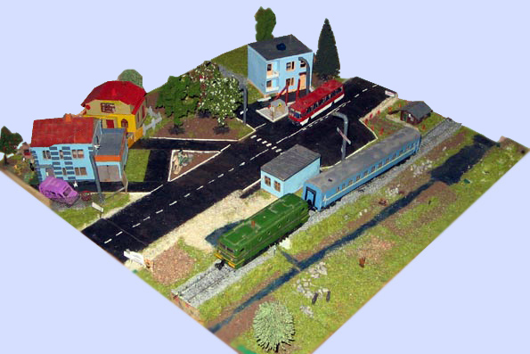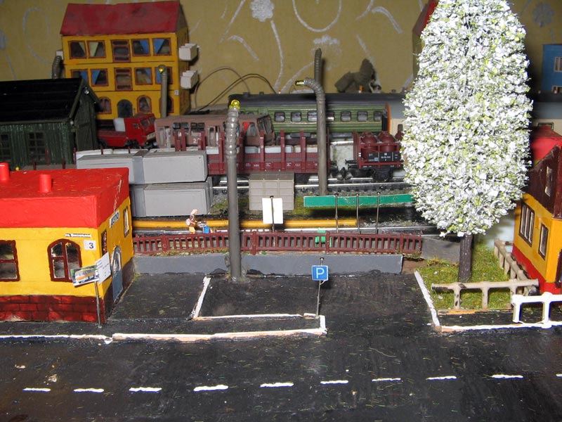 ИСТОРИЯ Если имеется железная дорога, хоть и миниатюрная, значит должно быть депо! Долгое время в качестве него использовались различные тупики на большом макете, иногда обрастая заборами, но конфигурация макета и его застройка не позволяла соорудить регулярное депо с ремонтным цехом. Выход был найден в постройке отдельной диорамы. Диорама была построена в 1997 году, аккурат к юбилею появления у меня модельной железной дороги в типоразмере ТТ, а соответственно и "Дня рождения" моей миниатюрной дороги! Основная концепция диорамы: однопутная железнодорожная станция, а рядом территория локомотивного депо. В 1997 году у меня был как раз финансовый кризис, да и вообще в то время было трудно что-нибудь купить для железной дороги, - в результате пошли в ход старые рельсы от ВТТВ, ранее уже успевшие послужить на основном макете и не блиставшие особым качеством. Зато все здания, сооружения были изготовлены самостоятельно из картона, деревья - из проволоки и крашенного поролона, имитация травяного покрова - из крашеного поролона и присыпки в виде крашенных опилок, насыпь сымитирована песком и мелким щебнем. Вокруг станции и депо находилась жилая зона, включающая как жилые дома, так и магазины, киоски. Был изготовлен сквер с фонтаном. РЕКОНСТРУКЦИЯ К лету 2007 года диорама представляла нерадостное зрелище. Находившись последние лет 6-7 на шкафу, она обросла слоем пыли, само депо скорее напоминало свалку. Было принято решение - диораму модернизировать и расширить. Для этого были заново изготовлены действующие фонари, а также освещение зданий; демонтированы все старые пути и присыпка, подремонтированы старые здания. Полностью обновлено и расширено путевое хозяйство с использованием как новых рельс, так и б/у, но в хорошем состоянии, заново сымитирована специальной присыпкой трава, деревья теперь от Noch. Дополнительно было изготовлено два здания: Клуб железнодорожников и Управление ж/д и поселка. Кроме того, использовано несколько б/у зданий от VERO, подаренные коллегой. Территория депо перенесена на окраину, появился тупик для разгрузочно-погрузочных работ. Площадь диорамы увеличена практически в 2 раза, благодаря чему в Д-Штадте появился новый район. Подробное описание диорамы "Городок". ИСТОРИЯ В 1996 году у меня была мания жилищного строительства на первом и единственном тогда макете, плюс сооружались здания необходимой инфраструктуры. Оказалось на макете не хватило места для больницы. И с этой целью была сооружена диорама Городок, где была больница, несколько жилых зданий, вокзал, кафе, магазин. Диорама была изготовлена летом 1997 года. Небольшая по размеру, она выглядела не вполне реалистично, можно было представить себе окружающее пространство с небольшим скоплением зданий. Это несоответствие практически исчезло после расширения диорамы в 2007 году, когда диорама была расширена в более чем два раза. После реконструкции появился тупик на станции. ОБРАЗ Городок пронзает автомагистраль, по окраине идет железнодорожная однопутка, по одну сторону которого располагается частный дом и ферма. В основной части города расположены вокзал, бензоколонка, больница, административное здание, ресторан, жилой сектор. Все здания самодельные из картона, к диораме «приписаны» несколько автотранспортных средств, включая самодельный автобус ПАЗ-3205, фирменные ав