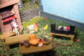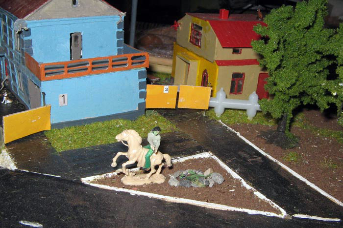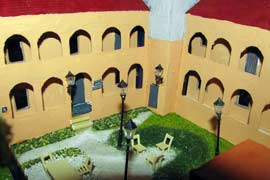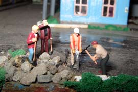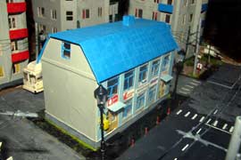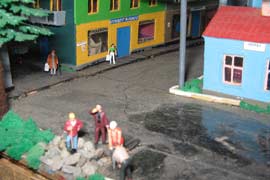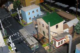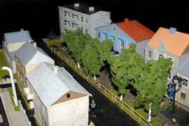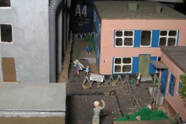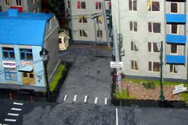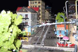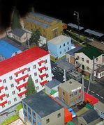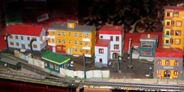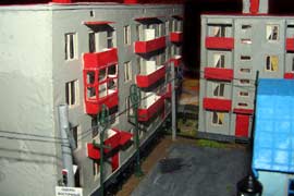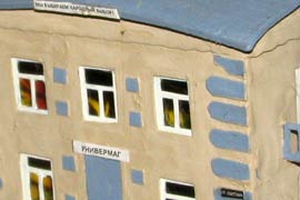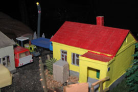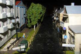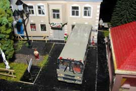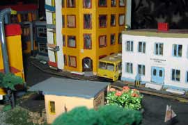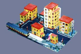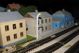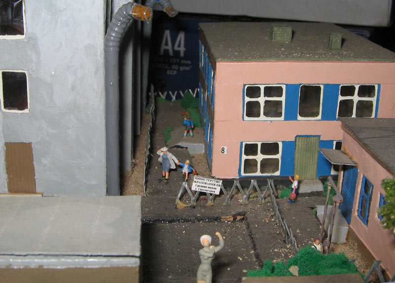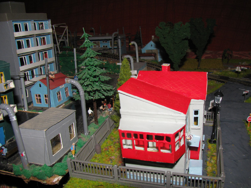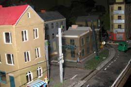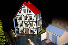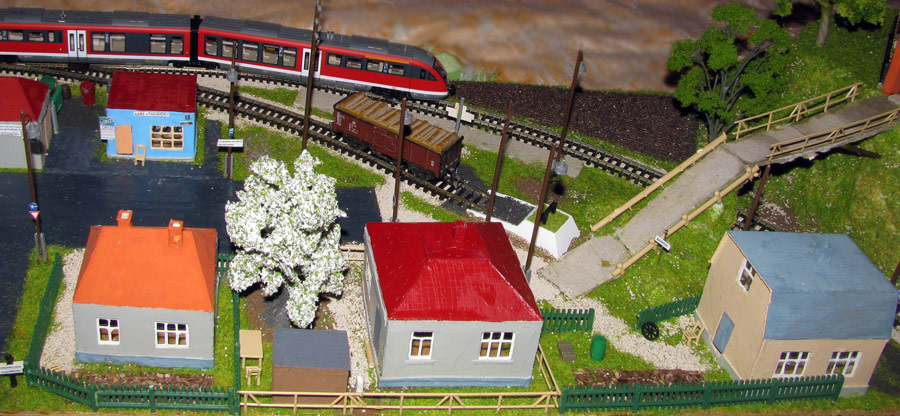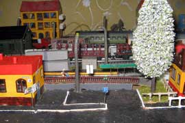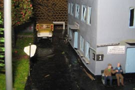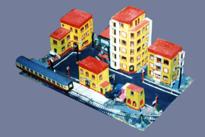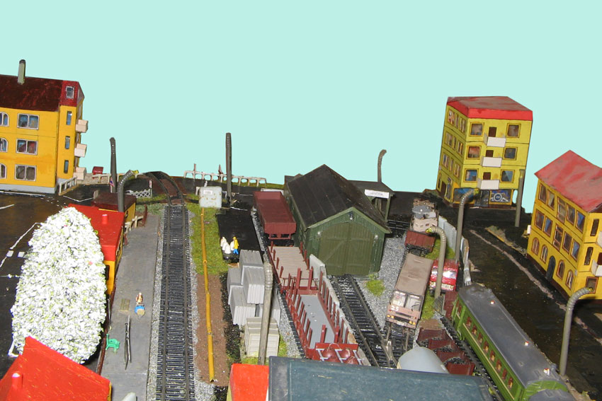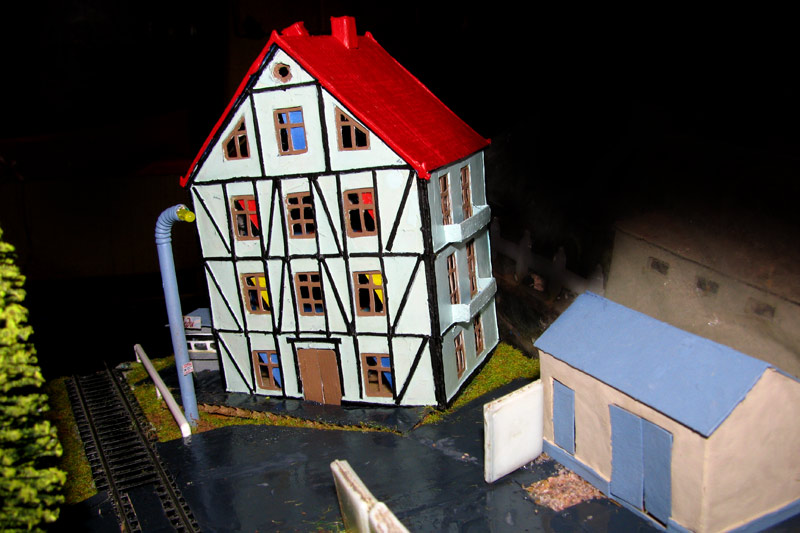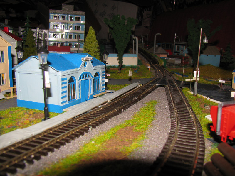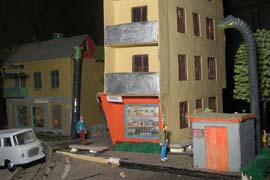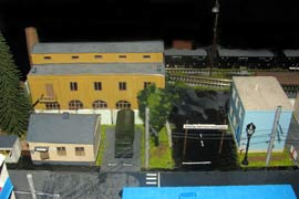 ИСТОРИЯ Если имеется железная дорога, хоть и миниатюрная, значит должно быть депо! Долгое время в качестве него использовались различные тупики на большом макете, иногда обрастая заборами, но конфигурация макета и его застройка не позволяла соорудить регулярное депо с ремонтным цехом. Выход был найден в постройке отдельной диорамы. Диорама была построена в 1997 году, аккурат к юбилею появления у меня модельной железной дороги в типоразмере ТТ, а соответственно и "Дня рождения" моей миниатюрной дороги! Основная концепция диорамы: однопутная железнодорожная станция, а рядом территория локомотивного депо. В 1997 году у меня был как раз финансовый кризис, да и вообще в то время было трудно что-нибудь купить для железной дороги, - в результате пошли в ход старые рельсы от ВТТВ, ранее уже успевшие послужить на основном макете и не блиставшие особым качеством. Зато все здания, сооружения были изготовлены самостоятельно из картона, деревья - из проволоки и крашенного поролона, имитация травяного покрова - из крашеного поролона и присыпки в виде крашенных опилок, насыпь сымитирована песком и мелким щебнем. Вокруг станции и депо находилась жилая зона, включающая как жилые дома, так и магазины, киоски. Был изготовлен сквер с фонтаном. РЕКОНСТРУКЦИЯ К лету 2007 года диорама представляла нерадостное зрелище. Находившись последние лет 6-7 на шкафу, она обросла слоем пыли, само депо скорее напоминало свалку. Было принято решение - диораму модернизировать и расширить. Для этого были заново изготовлены действующие фонари, а также освещение зданий; демонтированы все старые пути и присыпка, подремонтированы старые здания. Полностью обновлено и расширено путевое хозяйство с использованием как новых рельс, так и б/у, но в хорошем состоянии, заново сымитирована специальной присыпкой трава, деревья теперь от Noch. Дополнительно было изготовлено два здания: Клуб железнодорожников и Управление ж/д и поселка. Кроме того, использовано несколько б/у зданий от VERO, подаренные коллегой. Территория депо перенесена на окраину, появился тупик для разгрузочно-погрузочных работ. Площадь диорамы увеличена практически в 2 раза, благодаря чему в Д-Штадте появился новый район. Подробное описание диорамы "Городок". ИСТОРИЯ В 1996 году у меня была мания жилищного строительства на первом и единственном тогда макете, плюс сооружались здания необходимой инфраструктуры. Оказалось на макете не хватило места для больницы. И с этой целью была сооружена диорама Городок, где была больница, несколько жилых зданий, вокзал, кафе, магазин. Диорама была изготовлена летом 1997 года. Небольшая по размеру, она выглядела не вполне реалистично, можно было представить себе окружающее пространство с небольшим скоплением зданий. Это несоответствие практически исчезло после расширения диорамы в 2007 году, когда диорама была расширена в более чем два раза. После реконструкции появился тупик на станции. ОБРАЗ Городок пронзает автомагистраль, по окраине идет железнодорожная однопутка, по одну сторону которого располагается частный дом и ферма. В основной части города расположены вокзал, бензоколонка, больница, административное здание, ресторан, жилой сектор. Все здания самодельные из картона, к диораме «приписаны» несколько автотранспортных средств, включая самодельный автобус ПАЗ-3205, фирменные ав