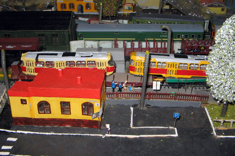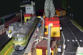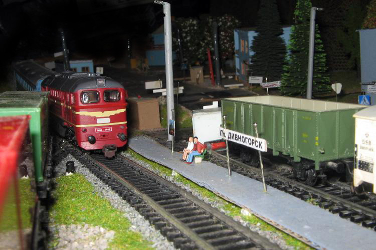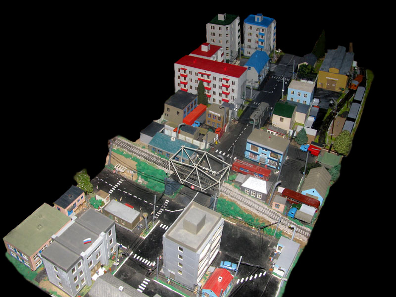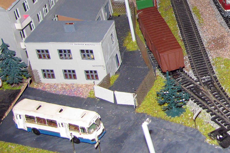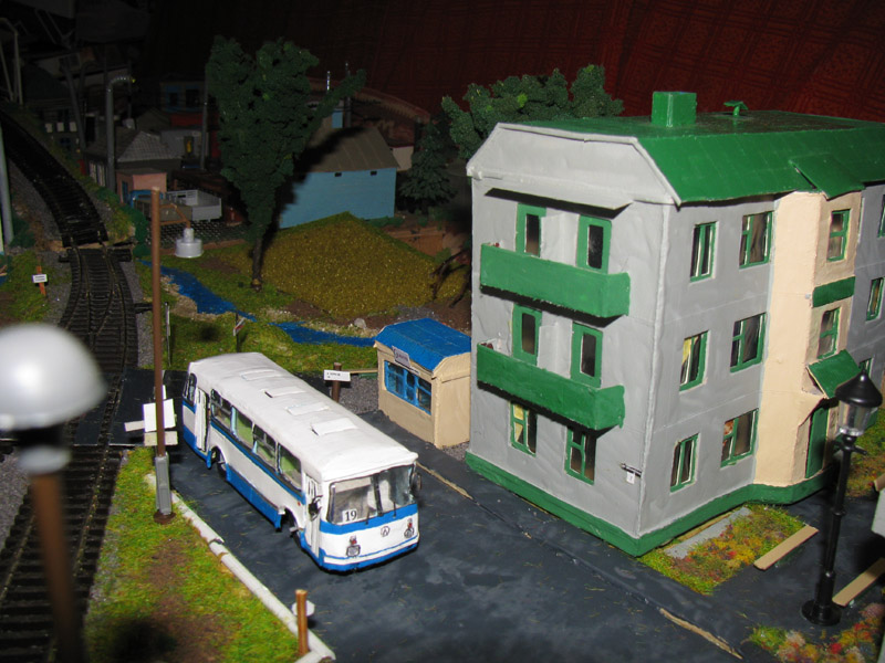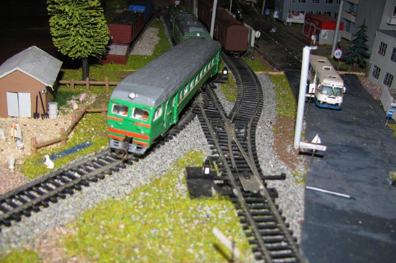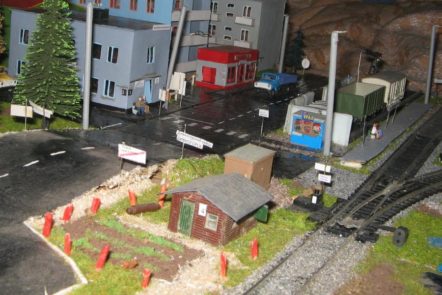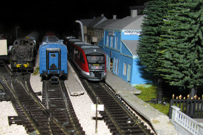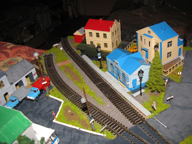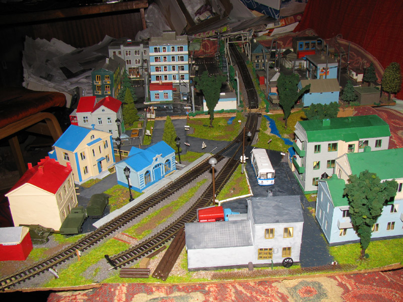 Тульский моделист и любитель транспорта, издатель журнала "Пантограф", создал на своих диорамах необычный мир. Это мир не столько железных дорог, сколько городского наземного транспорта. И всё же здесь - настоящее ТТ! И ещё одна "необычность" - почти все строения здесь сделаны руками автора, и поэтому можно при желании, вглядевшись в эти фотографии, ощутить не "аухагеновский", а вполне российский колорит! Всего есть 17 диорам, на которых расположены два государства и 16 населенных пунктов. Они делятся на два независимых друг от друга государственных образования: СРиД (Союз Райфланда и других земель) и Светлогорье, формально находящихся под одной унией (собственно обе страны имеют одного собственника, но политически независимы). В модельной сфере это заметно по, например, транспортной политике: так Светлогорье ориентируется 100 % на подвижной состав железных дорог СЖД-РЖД-СНГ, а СРиД – в этом плане «всеядный» - имеются как отечественный подвижной состав, так и иномарки, схожая политика присутствует и в формировании автомобильного парка, хотя здесь все менее жестко. Состав СРиД: Центральный округ: 1. г. Райфлянд (название произошло от первого, давно купленного здания вокзала). Приблизительные размеры 1х2 м. Существует и развивается с 1991 года. Транспорт: железная дорога, автобус, троллейбус. 2.пос. Д-Штадт, 1,1х0,5 м, существует с 1997 года. Сейчас находится в процессе удвоения территории и реконструкции. Транспорт: железная дорога (локомотивно-вагонное депо), автобус транзит. 3. д. Захаровка, небольшой населенный пункт, выросший на основе крошечного остатка старого макета А. Захарова (Москва), который был расширен, был построен жилой дом, модернизирована станция, травяной покров, насыпь, установлены заборы, стулья, стол и т.п. Станция однопутная. Новоградский округ: 1. г. Новоград-Карпатский. Создан в 2010 г. Транспорт: железная дорога, междугородний автобус. 2. с.Подзамковое. Создано в 2010 году. Транспорт автобус, железная дорога. 3. пос. Русинка. Построен в январе 2011 года. Транспорт железная дорога и транзитный автобус. Светлогорье: Светлогорский район: 1. г. Светлогорск. 1х2,5 м, существует с 2006 года. Транспорт: железная дорога, трамвай, троллейбус, автобус. 2. пос. Новое поселение. 0,5 х 0,5 м, существует с 2007 года. Транспорт: железная дорога, автобус транзит. 3. пос. Лучегорск и пос. Восточный. Созданы в 2010 году. Транспорт: железная дорога (станция Восточный), пригородный автобусный маршрут № 19. Дивногорский район: 1. пос. Дивногорск. восточная часть: 0,5 х 0,5 м, существует с 2008 года, западная на совместной диораме с Железнодорожным с весны 2009 года. Транспорт: железная дорога, автобус транзит. 2. пос. Железнодорожный. Существует с 2009 года, здесь находится управление железнодорожной компании «Светлогорская магистраль» и депо с небольшой ремонтной базой. Транспорт: пригородный автобус маршруты 12, 20, 21. 3. пос. Радужный. Существует с марта 2010 года, западный ворота Светлогорья, транспорт жд станция и автобус маршрута 21. 4. д. Бахметьево. Существует с осени 2009 года (большая часть, фрагмент с весны 2009 года), жд станция, автобус маршрута 12, 32. Городоцкий район: 1. г. Городок, 1х0,3 м, существует с 1997 года, заметно расширен и модернизирован в 2007 году. Транспорт: железная дорога и автобус. 2. пос. Городище. Существует на диораме с Бахметьево с осени 2009 года. Один жилой дом в саксонском стиле, и торговы