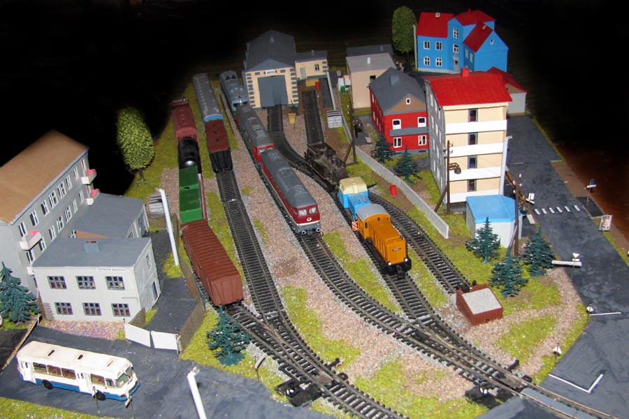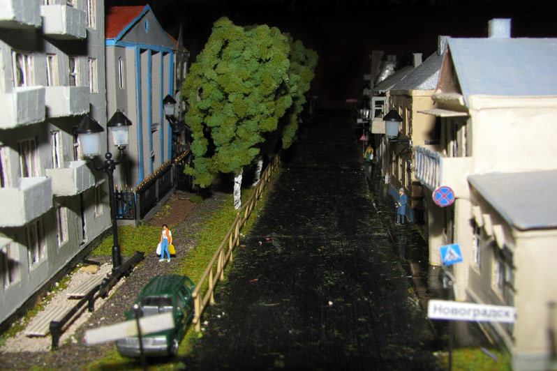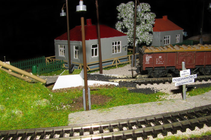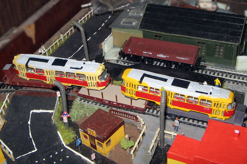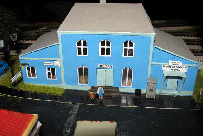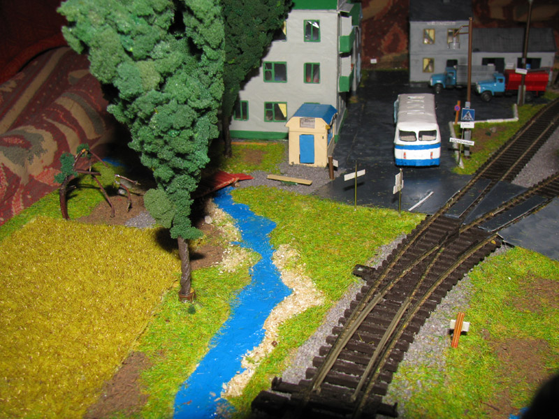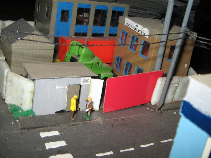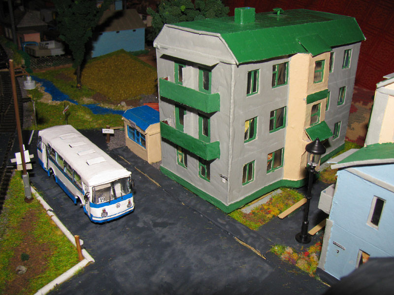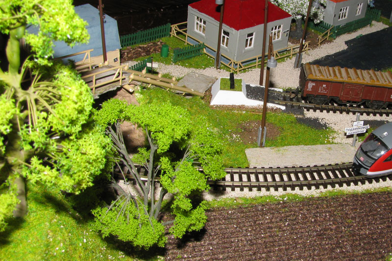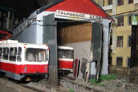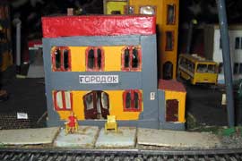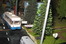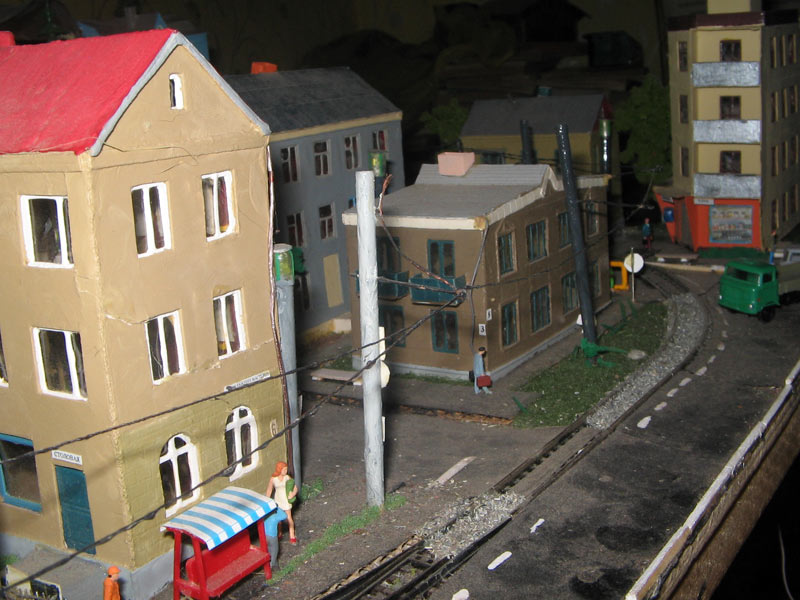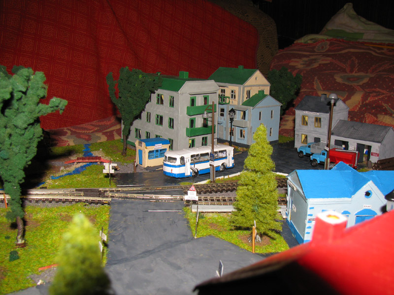 Тульский моделист и любитель транспорта, издатель журнала "Пантограф", создал на своих диорамах необычный мир. Это мир не столько железных дорог, сколько городского наземного транспорта. И всё же здесь - настоящее ТТ! И ещё одна "необычность" - почти все строения здесь сделаны руками автора, и поэтому можно при желании, вглядевшись в эти фотографии, ощутить не "аухагеновский", а вполне российский колорит! Всего есть 17 диорам, на которых расположены два государства и 16 населенных пунктов. Они делятся на два независимых друг от друга государственных образования: СРиД (Союз Райфланда и других земель) и Светлогорье, формально находящихся под одной унией (собственно обе страны имеют одного собственника, но политически независимы). В модельной сфере это заметно по, например, транспортной политике: так Светлогорье ориентируется 100 % на подвижной состав железных дорог СЖД-РЖД-СНГ, а СРиД – в этом плане «всеядный» - имеются как отечественный подвижной состав, так и иномарки, схожая политика присутствует и в формировании автомобильного парка, хотя здесь все менее жестко. Состав СРиД: Центральный округ: 1. г. Райфлянд (название произошло от первого, давно купленного здания вокзала). Приблизительные размеры 1х2 м. Существует и развивается с 1991 года. Транспорт: железная дорога, автобус, троллейбус. 2.пос. Д-Штадт, 1,1х0,5 м, существует с 1997 года. Сейчас находится в процессе удвоения территории и реконструкции. Транспорт: железная дорога (локомотивно-вагонное депо), автобус транзит. 3. д. Захаровка, небольшой населенный пункт, выросший на основе крошечного остатка старого макета А. Захарова (Москва), который был расширен, был построен жилой дом, модернизирована станция, травяной покров, насыпь, установлены заборы, стулья, стол и т.п. Станция однопутная. Новоградский округ: 1. г. Новоград-Карпатский. Создан в 2010 г. Транспорт: железная дорога, междугородний автобус. 2. с.Подзамковое. Создано в 2010 году. Транспорт автобус, железная дорога. 3. пос. Русинка. Построен в январе 2011 года. Транспорт железная дорога и транзитный автобус. Светлогорье: Светлогорский район: 1. г. Светлогорск. 1х2,5 м, существует с 2006 года. Транспорт: железная дорога, трамвай, троллейбус, автобус. 2. пос. Новое поселение. 0,5 х 0,5 м, существует с 2007 года. Транспорт: железная дорога, автобус транзит. 3. пос. Лучегорск и пос. Восточный. Созданы в 2010 году. Транспорт: железная дорога (станция Восточный), пригородный автобусный маршрут № 19. Дивногорский район: 1. пос. Дивногорск. восточная часть: 0,5 х 0,5 м, существует с 2008 года, западная на совместной диораме с Железнодорожным с весны 2009 года. Транспорт: железная дорога, автобус транзит. 2. пос. Железнодорожный. Существует с 2009 года, здесь находится управление железнодорожной компании «Светлогорская магистраль» и депо с небольшой ремонтной базой. Транспорт: пригородный автобус маршруты 12, 20, 21. 3. пос. Радужный. Существует с марта 2010 года, западный ворота Светлогорья, транспорт жд станция и автобус маршрута 21. 4. д. Бахметьево. Существует с осени 2009 года (большая часть, фрагмент с весны 2009 года), жд станция, автобус маршрута 12, 32. Городоцкий район: 1. г. Городок, 1х0,3 м, существует с 1997 года, заметно расширен и модернизирован в 2007 году. Транспорт: железная дорога и автобус. 2. пос. Городище. Существует на диораме с Бахметьево с осени 2009 года. Один жилой дом в саксонском стиле, и торговы