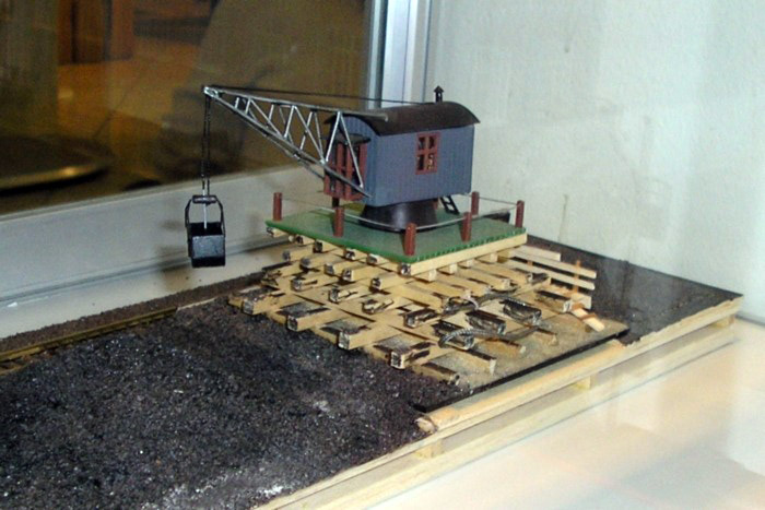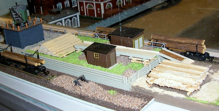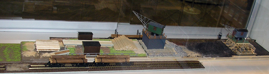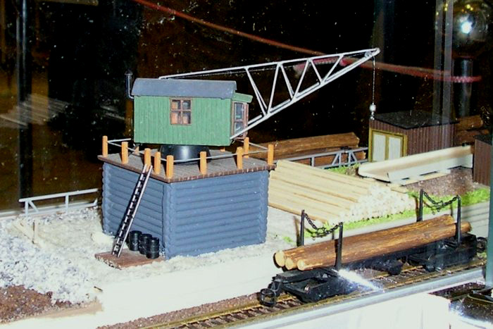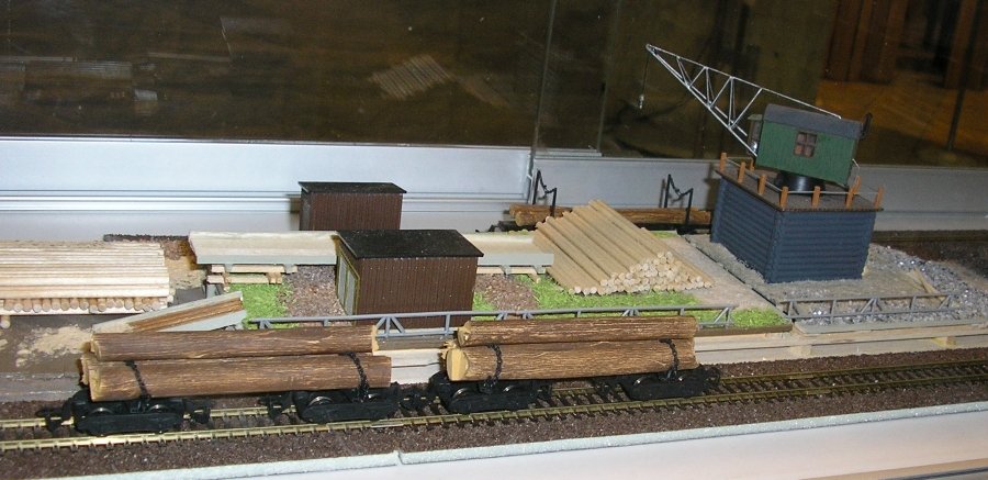 Небольшая диорама, построенная московским моделистом С.А. ануфриевым, экспонировалась на III выставке "РЖД в моделях" в Политехническом музее в Москве в октябре-ноябре 2008 г. Диорама имеет линейную композицию. Тема левой части - погрузка-выгрузка лесоматериалов, справа - площадка для складирования угля. На диораме установлены два крана; по краям проходят два пути, на которых размещено несколько самодельных лесовозных вагонов со свежеспиленными мощными стволами. Расположение путей предполагает, что диорама может выступать частью более крупного макета.