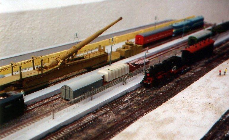Фото 8. Модуль, условно изображающий музей на Варшавском вокзале. Хорошо видны артиллерийская установка на ж.д. ходу и красный вагон ЦМВ от "ТТ-модель", а также - ТЭ7 и "егоровский" вагон от "Пересвета". К сожалению, сходство музея на макете с реальным музеем сильно ограничено ассортиментом модельного подвижного состава...