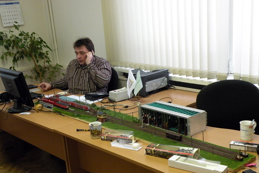 Фото 1. Макет на стадии строительства в московском офисе фирмы "Schneider Intercom" и его строитель - Р.Мишин.