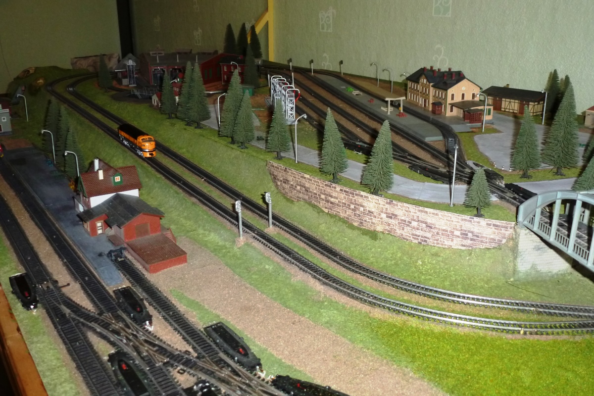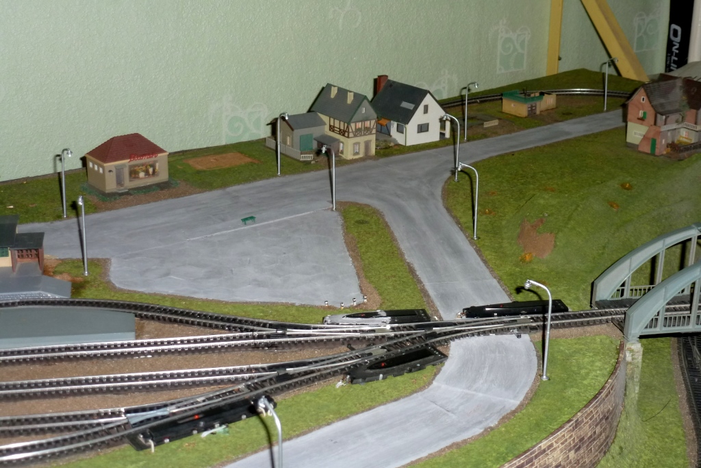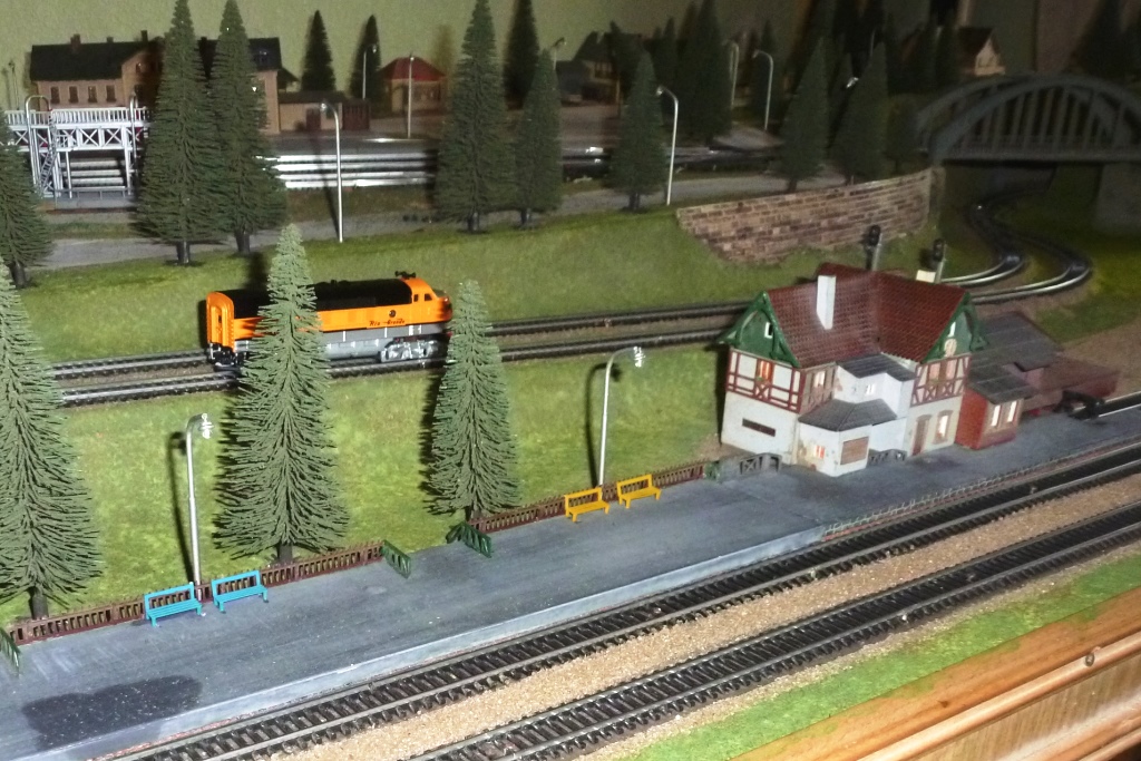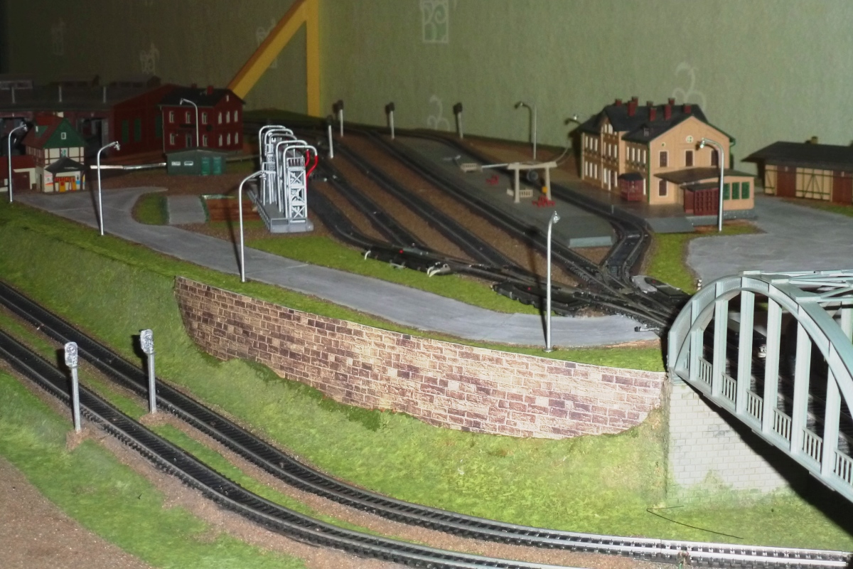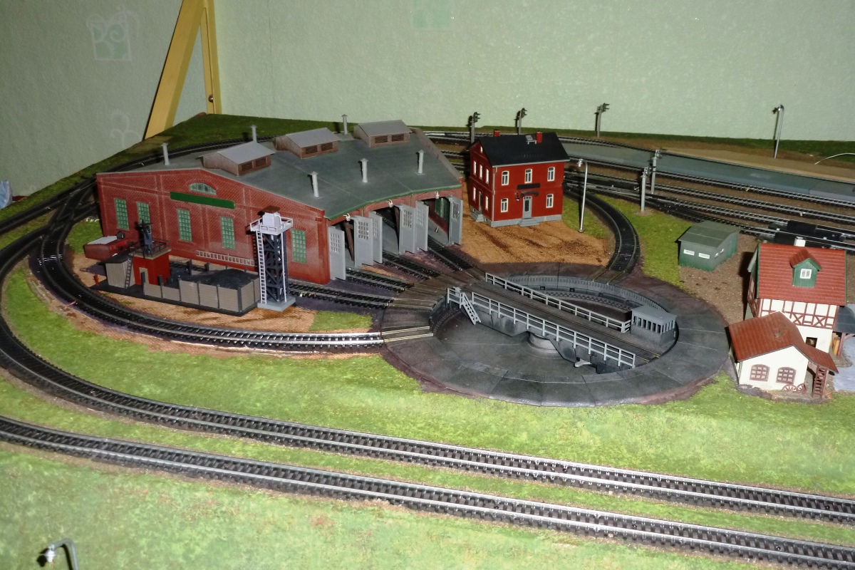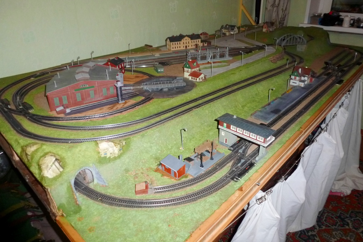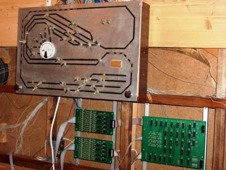Задумка макета появилась в далеком 1986-м, когда наконец, в звании капитана, автор макета получил отдельную квартиру. Макет размером 240 х 120 см был построен монокаркасным. Каркас деревянный - брусок 40 х 40 и 30 х 30 мм, пропитан спиртовой морилкой. До сих пор дерево в отличном состоянии. Перекрытие из оргалита, да в то время ничего больше подходящего и не было. Фанера была бы тяжеловата. Макет прикреплен к стене комнаты и откидывается на двух шарнирах. Рельсовая схема - перехлеснутая восьмерка. Движение осуществляется по часовой стрелке. Общая длина рельсового пути около 20-25 м; установлено 19 стрелок, 12 светофоров. Когда праздновали дни рождения детей, поиграть на макете собиралась вся знакомая детвора. И никакого лимонада не надо было! Управляли втроём: двое на "кирпичах" (блоки питания типа Z1 кирпича) и один стрелочник - за пультом. Отработав таким образом 10 лет, с 1996 года макет был в консервации, пережил три переезда. Переезжал на "Волге" и таскался вручную по лестницам. И наконец в 2007 году нашел свое постоянное место. В 2010-м началась вторая жизнь макета - он был автоматизирован. Используется логика TTL, с жестким алгоритмом работы светофоров в зависимость от положения стрелок и занятости пути предыдущим поездом. В это же время на макете появляется веерное депо с поворотным кругом от Fleishmann ТТ. Е.Бычков