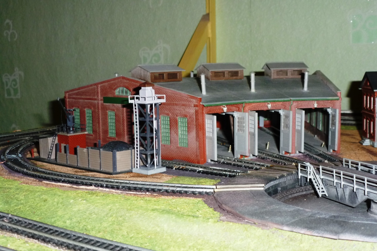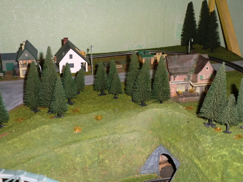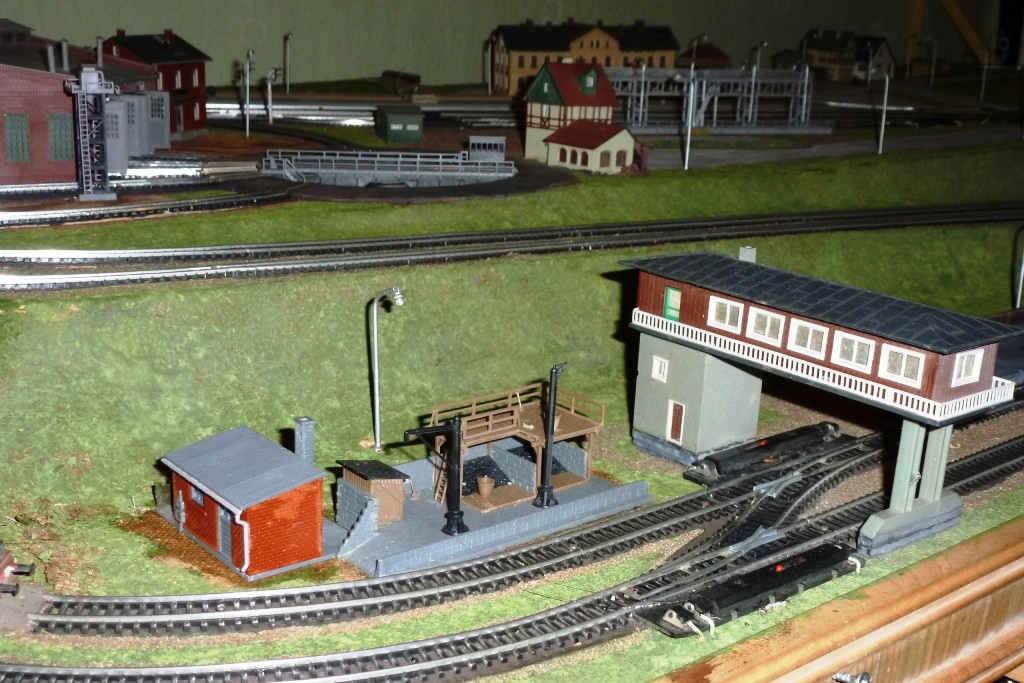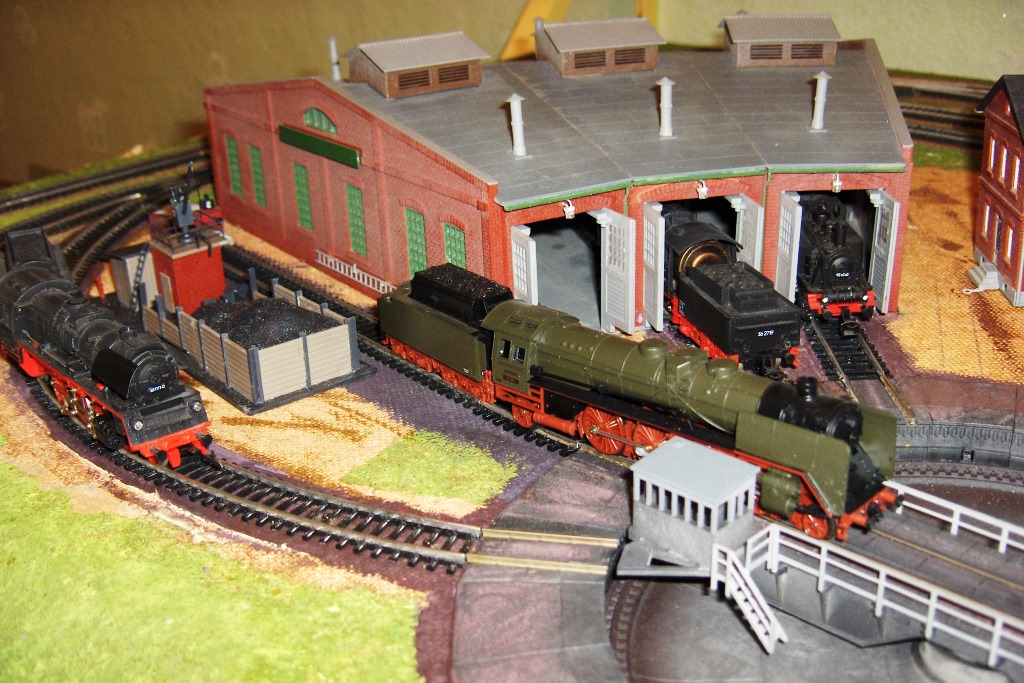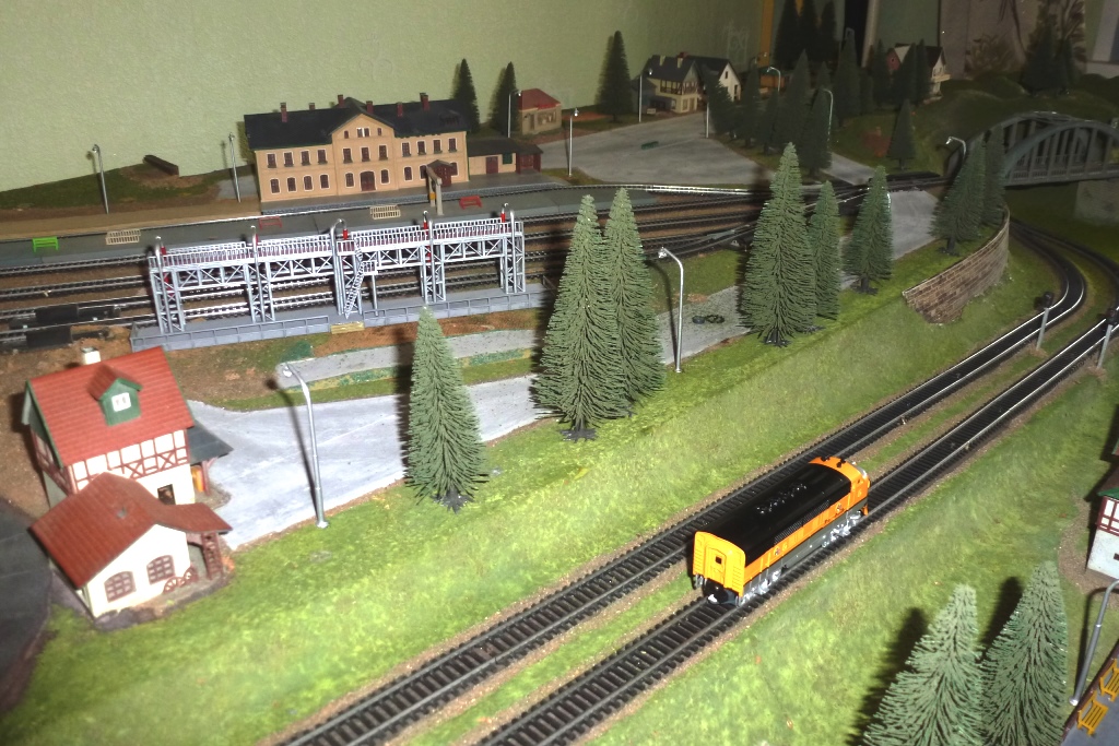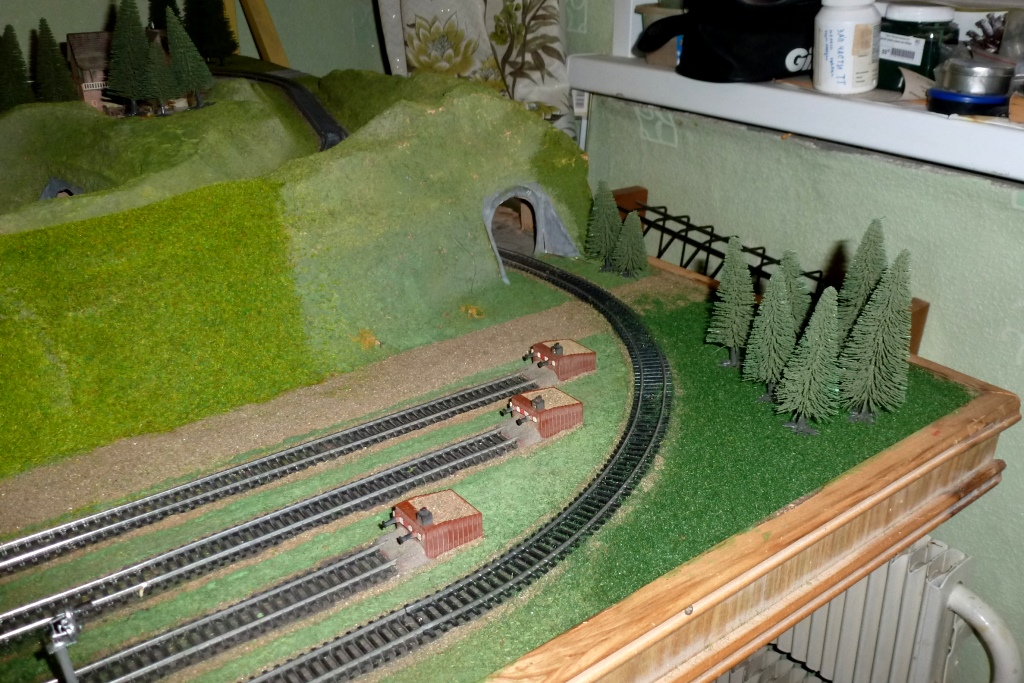 Задумка макета появилась в далеком 1986-м, когда наконец, в звании капитана, автор макета получил отдельную квартиру. Макет размером 240 х 120 см был построен монокаркасным. Каркас деревянный - брусок 40 х 40 и 30 х 30 мм, пропитан спиртовой морилкой. До сих пор дерево в отличном состоянии. Перекрытие из оргалита, да в то время ничего больше подходящего и не было. Фанера была бы тяжеловата. Макет прикреплен к стене комнаты и откидывается на двух шарнирах. Рельсовая схема - перехлеснутая восьмерка. Движение осуществляется по часовой стрелке. Общая длина рельсового пути около 20-25 м; установлено 19 стрелок, 12 светофоров. Когда праздновали дни рождения детей, поиграть на макете собиралась вся знакомая детвора. И никакого лимонада не надо было! Управляли втроём: двое на "кирпичах" (блоки питания типа Z1 кирпича) и один стрелочник - за пультом. Отработав таким образом 10 лет, с 1996 года макет был в консервации, пережил три переезда. Переезжал на "Волге" и таскался вручную по лестницам. И наконец в 2007 году нашел свое постоянное место. В 2010-м началась вторая жизнь макета - он был автоматизирован. Используется логика TTL, с жестким алгоритмом работы светофоров в зависимость от положения стрелок и занятости пути предыдущим поездом. В это же время на макете появляется веерное депо с поворотным кругом от Fleishmann ТТ. Е.Бычков