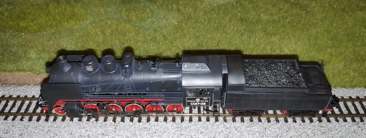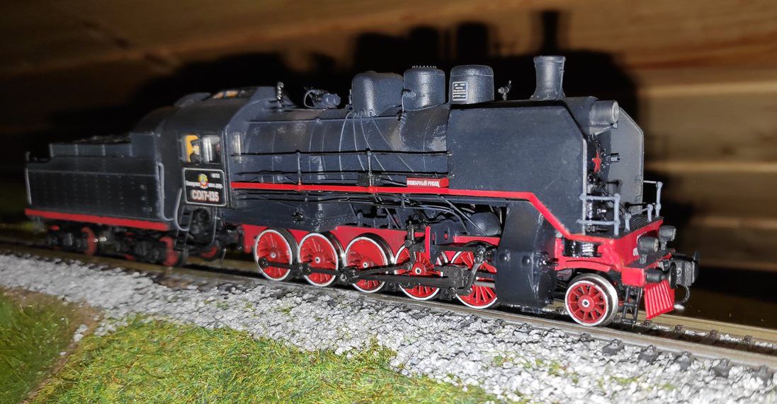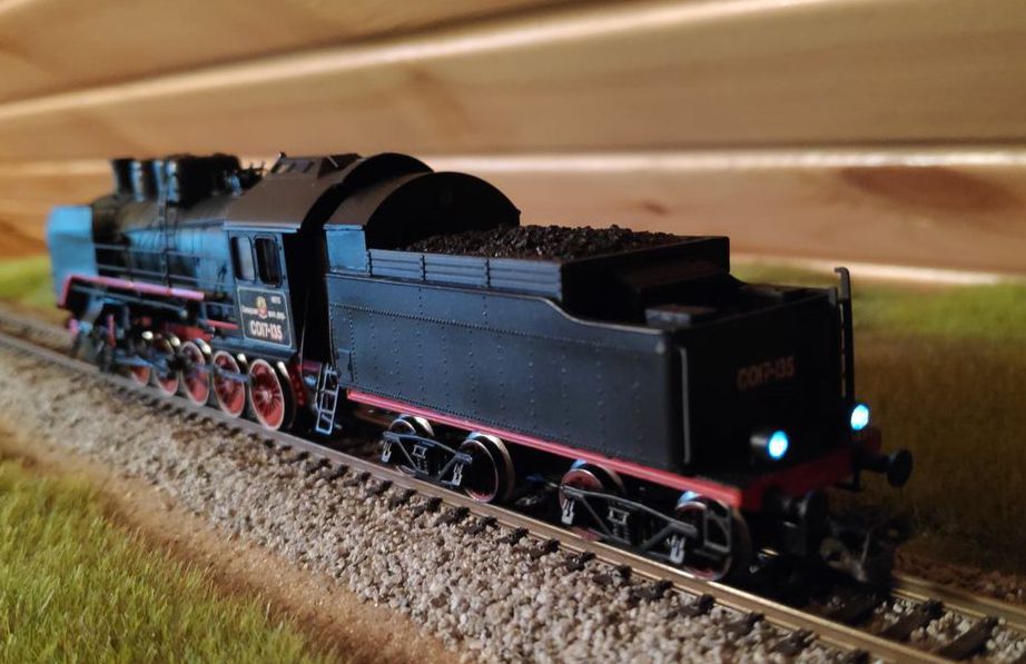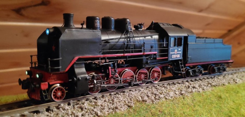 Разновидности: нет Эпоха: 3-4 Принадлежность: СЖД Фирма-производитель: Братский С. Год начала производства: 2022 Описание моделиМодель паровоза СО17-135 выполнена московским моделистом С.В. Братским в 2022 году. В модели применена ходовая часть в сборе от модели немецкого паровоза серии 58 фирмы «Арнольд». По сравнению с паровозами серий 50/52 фирмы «Тиллиг», шасси которых обычно используется для изготовления СО, эта ходовая часть более точно совпадает по своей геометрии с размерами отечественного локомотива. В качестве тендера использован с небольшими доработками тендер паровоза Эм производства «Пересвета». Именно такими тендерами были укомплектованы паровозы СО первых выпусков. Котёл, будку и другие детали модели Сергей Владимирович сделал из листового пластика, проволоки и других подручных материалов. Освещение выполнено на светодиодах и переключается в сторону движения. Модель паровоза СО17-135 изготовлена на заказ и находится в частной коллекции. Другие модели паровоза СО: - от В.Дёмина (СОк); - от С.Братского (СО17-1680). - от С.Братского (СО17-2956). Описание прототипаПаровозы серии СО ("Серго Орждоникидзе") строились с 1934. Они имели практически те же габариты, что и паровозы сериия Э, но были мощнее и хорошо зарекомендовали себя в эксплуатации, в силу чего получили на советских ж.д. относительно широкое распространение. Цифра 17 после обозначения серии (СО17) свидетельствовала о нагрузке на ось 17 т. Всего в период до 1944 г. было выпущено 384 паровоза СО и 443 паровоза СОв (с вентиляторной тягой), а также 1438 паровозов СОк (с конденсацией пара). В период с 1945 по 1951 гг. было построено ещё 2222 паровоза серии СО. Итоговое количество - 4487 штук! - уступает только знаменитому паровозу серии Э (всех индексов). В музеи России попало целых 7 паровозов этой серии. В Петербурге можно встретить СО17-2413 и СОм14-1137, в Новосибирском музее - СОм17-508, в Московском музее истории ж.д. техники - СО17-2211, в Нижнем Новгороде - СО17-2956, в Ростове-на-Дону - СО17-2724, в техническом музее в Тольятти - СО17-65. В ближнем зарубежье можно встретить СО17-3268, который стоит в Брестском ж.д. музее. Ряд паровозов серии СО установлен в городах России в качестве паровозов-памятников.