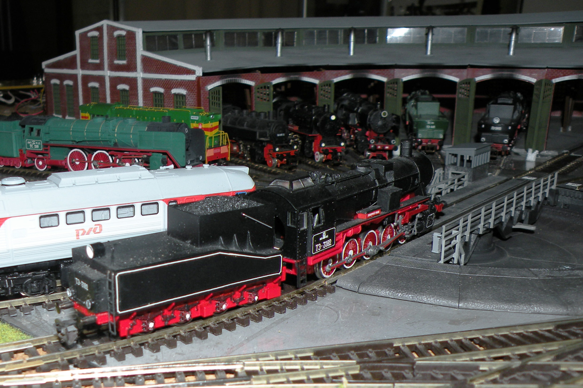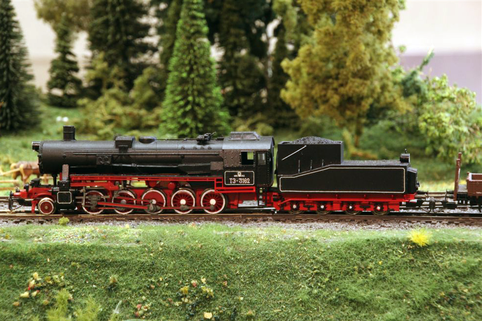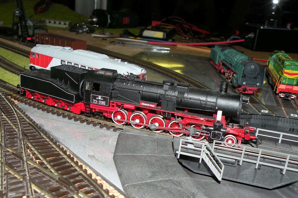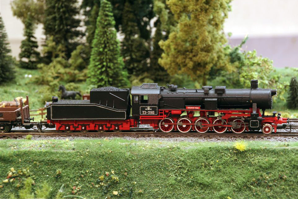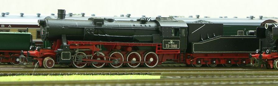 Эпоха: III Принадлежность: СЖД Фирма-производитель: Д.Екимов Год начала производства: 2012 Описание моделиМодель паровоза ТЭ-3162 - конверсия, выполнанная московским моделистом Д.Екимовым на базе модели паровоза 52 от Tillig (доработка, окраска, надписи). Использован модельный жесткорамный ("венский") тендер, выпущенный фирмой PMT в середине 2000-х гг. крайне малой серией. В работе над конверсией принимали участие С.Ермоленко (Ростов-на-Дону) - разработка декалей и А.Андреев (Москва) - электрика. В настоящее время модель находится в коллекции Александра Андреева. Описание прототипаСерия ТЭ в 1952 г. присвоена МПС СССР трофейным паровозам серии 52, строившимся на европейских заводах для фронтовых перевозок фашистской Германии с сентября 1942 г. В период с 1942 по 1944 г. в Германии и на оккупированных землях было построено 6244 паровоза серии 52. Из них более двух тысяч было захвачено в качестве трофеев и получено по репарациям на ж.д. СССР. Паровозы серии 52 называли «военными паровозами», что связано не только с периодом изготовления, но и с рядом конструктивных особенностей. Среди них важнейшие: закрытая со всех сторон будка машиниста, ограниченное использование цветных металлов, сокращённая более чем в полтора раза номенклатура деталей. Паровозы имели колёсную формулу 1-5-0, отличалась большой надёжностью и хорошей мощностью, эквивалентной отечественным паровозам серии Э; отсюда и советское название – ТЭ: «трофейный, по мощности равен серии Э». По данным А.А.Васильева, в послевоенном СССР эксплуатировалось 2053 паровоза бывшей 52-й серии – больше, чем в любой другой отдельно взятой стране Европы. Паровоз ТЭ-3162 в 2000-х гг. с тендером "венского" типа эксплуатировался с ретро-поездами, затем, утратив работоспособность, был размещен в депо "Подмосковная". В настоящее время сохраняются и другие паровозы ТЭ с аналогичными тендерами: ТЭ-6769 - экспонат музея на Варшавском вокзале в Санкт-Петербурге; ТЭ-4564 - экспонат ж.д. музея в Калининграде; ТЭ-2596 сохраняется в Брестском ж.д. музее.