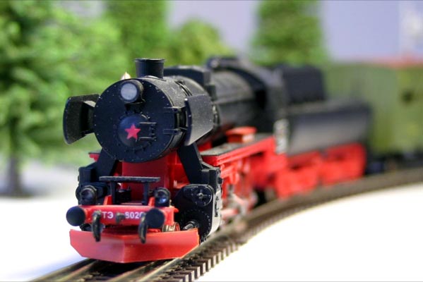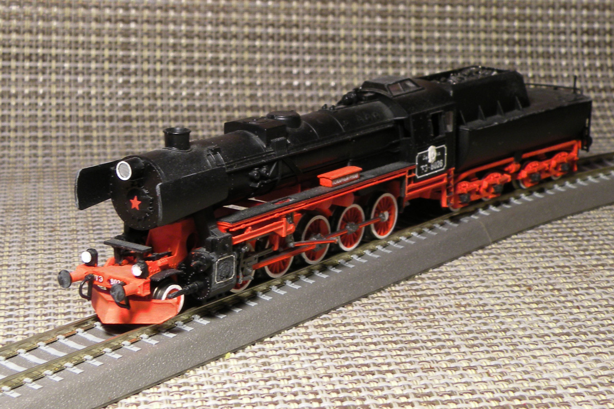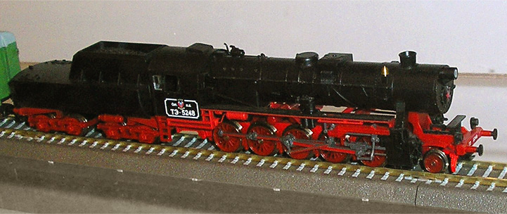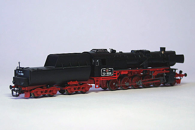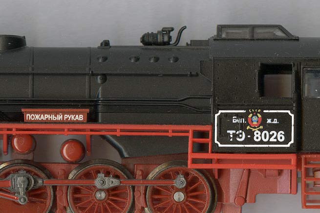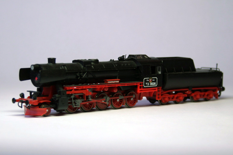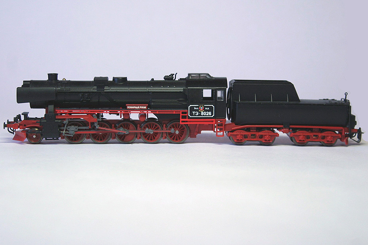 Разновидности: ТЭ с дымоотбойниками и световым фонарём (ТЭ-8026 Бел.ж.д.), ТЭ без дымоотбойника и светового фонаря (ТЭ-5248 Окт.ж.д.) Эпоха: III Принадлежность: СЖД Фирма-производитель: ModellDepo - Tillig Год начала производства: 2004 Год окончания производства: по настоящее время Описание моделиМодель паровоза ТЭ-8026 Белорусской ж.д. заявлена фирмой Modelldepo как мелкосерийная промышленная конверсия модели паровоза серии 52 с ванным тендером от Tillig (арт. 02270). Корпус паровоза выполнен пластмассовым, корпус тендера металлическим. Мотор находится в тендере и имеет привод на все четыре оси, одна из которых для лучшего сцепления имеет прорезиненные колёса. Токосъём с первой и последней ведущих колёсных пар паровоза и со всех колёсных пар тендера. Освещение переключается по ходу движения поезда. Возможна установка цифрового декодера. Ограниченной серией фирма Tillig в кооперации с другой немецкой фирмой РМТ выпустила модификацию паровоза ТЭ с жесткорамным тендером (арт. 02279). Таким образом, моделисты получают возможность разнообразить свой парк трофейных «52-х». Описание прототипаСерия ТЭ в 1952 г. присвоена МПС СССР трофейным паровозам серии 52, строившимся на европейских заводах для фронтовых перевозок фашистской Германии с сентября 1942 г. В период с 1942 по 1944 г. в Германии и на оккупированных землях было построено 6244 паровоза серии 52. Из них более двух тысяч было захвачено в качестве трофеев и получено по репарациям на ж.д. СССР. Паровозы серии 52 называли «военными паровозами», что связано не только с периодом изготовления, но и с рядом конструктивных особенностей. Среди них важнейшие: закрытая со всех сторон будка машиниста, ограниченное использование цветных металлов, сокращённая более чем в полтора раза номенклатура деталей. Паровозы имели колёсную формулу 1-5-0, были укомплектованы четырёхосными тендерами (в подавляющем большинстве использовались тендеры ванного типа, однако на сети СЖД работали трофейные паровозы этой серии и с тендерами прямоугольной формы и жёсткой укороченной базой, а также тендерами по типу тендеров паровозов серии 50 - "мирного" прообраза 52й серии). Паровозы серии отличалась большой надёжностью и хорошей мощностью, эквивалентной отечественным паровозам серии Э; отсюда и советское название – ТЭ: «трофейный, по мощности равен серии Э». По данным А.А. Васильева, в послевоенном СССР эксплуатировалось 2053 паровоза бывшей 52-й серии – больше, чем в любой другой отдельно взятой стране Европы. Паровозы серии ТЭ работали на Белорусской, Октябрьской, Прибалтийской, Львовской и других дорогах западной части СССР до середины 1970-х гг. После этого некоторые из списанных паровозов были отданы промышленным предприятиям, часть была отправлена на железные дороги стран социалистического содружества, однако немалая часть сохранялась на базах запаса до конца 1990-х – начала 2000-х гг., а затем была разделана в металлолом. Сегодня паровозы ТЭ являются одними из самых распространеных экспонатов железнодорожных музеев. В России их можно встретить в Москве (ТЭ-5415 с ванным тендером), Санкт-Петербурге (ТЭ-6769 с жесткорамным тендером), Нижнем Новгороде (ТЭ-622 с тендером по типу тендеров паровоза немецкой серии 50), Ростове-на-Дону (ТЭ-322 с ванным тендером), Калининграде (ТЭ-4564 с жесткорамным тендером), Тольятти (ТЭ-4844 с жесткорамным тендером). В СНГ эти паровозы стоят в