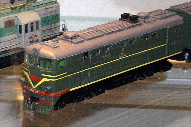 Эпоха: IV Принадлежность: СЖД Фирма-производитель: Александр Шувиков Описание моделиМодель тепловоза 2ТЭ10Л-1537 изготовлена А. Шувиковым с использованием деталей моделей тепловозов, производимых фирмой «Пересвет» и экспонировалась на выставке в Санкт-Петербурге в 2005 и 2006 гг., в Москве в 2006 г. и др. Описание прототипаГрузовой тепловоз серии 2ТЭ10Л был создан в 1961 г. на Луганском тепловозостроительном заводе как дальнейшее развитие тепловоза 2ТЭ10. Вместо кузовов несущей конструкции на нём были применены кузова с несущей рамой по принципу ТЭ3, с новой, характерной только для 21ТЭ10Л, формой кабины. Мощность дизелей составляла 2 х 3000 л.с.; проектная мощность локомотива составляла 1910 кВт, конструкционная скорость – 100 км/ч. Тепловозы 2ТЭ10Л изготавливались до 1977 г. включительно; за это время построено около трёх с половиной тысяч двухсекционных тепловозов этой серии. Их массовое списание началось в 1990-е гг., и сегодня 2ТЭ10Л остались на Российских железных дорогах в незначительном количестве. Тепловоз 2ТЭ10Л-2110 (настоящий номер 2100) экспонируется в музее Новосибирска; еще один 2ТЭ10Л-254 экспонируется в Ташкентском музее.