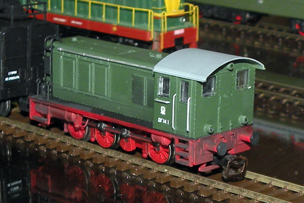 Эпоха: 3 !Принадлежность: СЖД Фирма-производитель: Tillig (исходная модель) Год начала производства: 2011 (Tillig) Год окончания производства: 2008 Артикул: 04632, 04635, 04638 (Tillig) Описание моделиНовая модель немецкого тепловоза V36 выпускается фирмой Tillig. Три оси - токосъемные и ведущие; освещение (два фонаря - тёплый белый свет) переключается по ходу движения. Модель выпускалась и выпускается в различных разновидностях, некоторые из которых конструктивно соответствуют прототипам, работавшим в СССР. Таким образом, модель может выступать основой для легкой окрасочной конверсии. Другие модели тепловоза Дг14: - старая модель от Zeuke-BTTB (конверсия). Описание прототипаВ 1945 г. на базу автомотрис на ст. Раменское Мск жд поступил немецкий тепловоз типа 1941 г. постройки 0-3-0 с гидромеханической передачей, дизелем мощностью 360 л.с. и сцепной массой 42 т. На советских ж.д. тепловоз получил обозначение Дг14-1 (дизельный с гидропередачей, нагрузка на рельсы от колёсной пары 14 т). В 1946 г. ВНИИЖТ совместно с кафедрой тепловозостроения МВТУ провели испытания тепловоза на Московско-курской ж.д. Здесь локомотив работал некоторое время на манёврах, а также обслуживал пассажирские поезда на участке Фрязево – Ногинск и сделал две поездки на участке Москва-Белев. Еще один локомотив того же типа работал в послевоенные годы в депо Вильнюс (Лит. ж.д.). По воспоминаниям работавшего на нем машиниста, одно время он был окрашен в зелёный цвет, другое время - в серый.