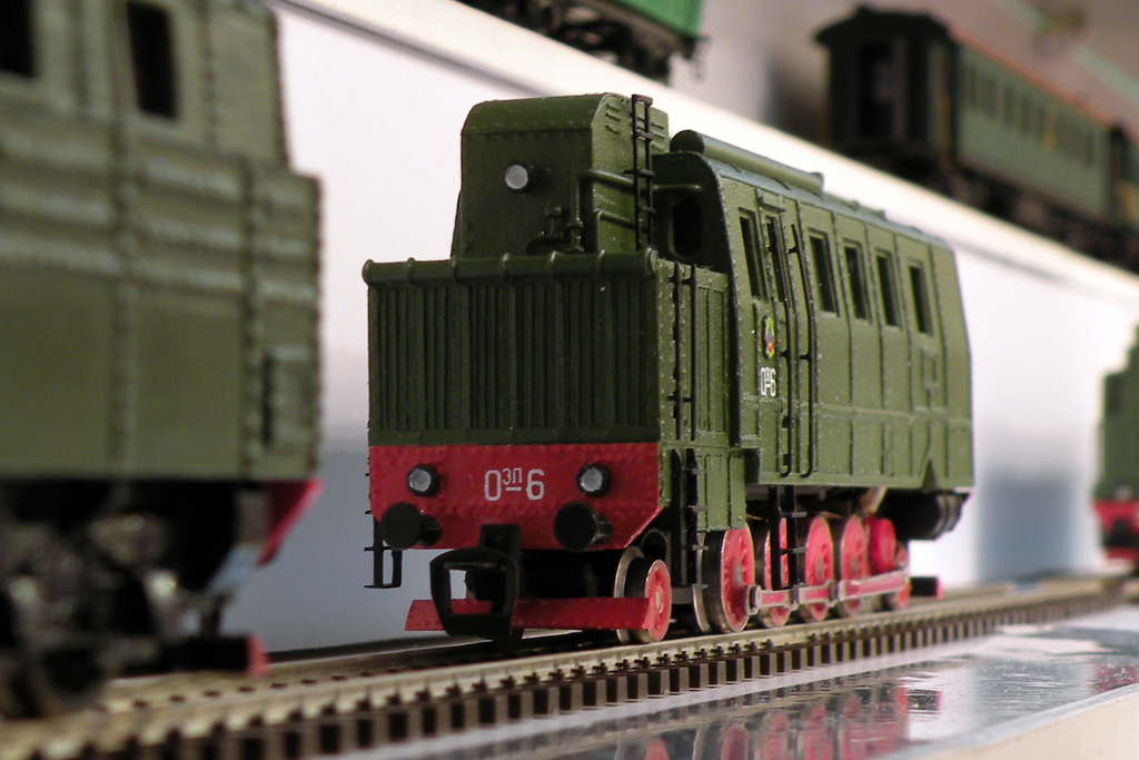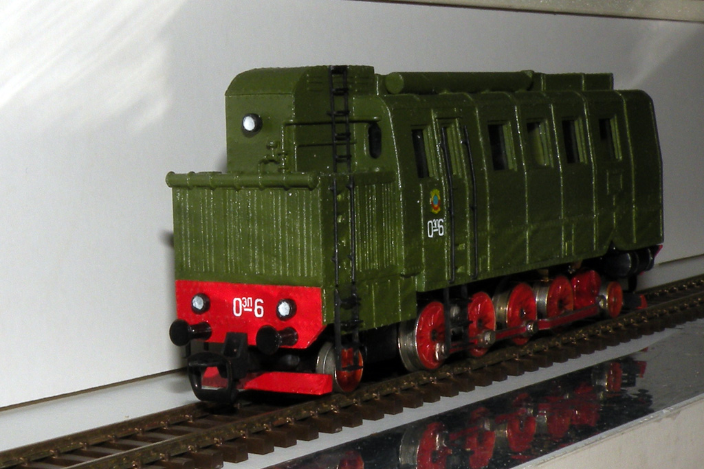 Разновидности: нет Эпоха: II Принадлежность: СЖД Фирма-производитель: Мурашов А. Год начала производства: 2013 Описание моделиВ 2012-13 гг., после многолетнего перерыва, наро-фоминский моделист Алексей Мурашов вернулся к своим любимым прототипам - довоенным советским тепловозам - и представил на весенней выставке 2013 г. в ЦМЖТ (Санкт-Петербург) модель тепловоза Оэл6. Модель ходовая, изготовлена вручную из различных материалов. Видео прохождения модели по Раменскому макету. Описание прототипаВ 1927 г. НКПС заказал Коломенскому заводу им. В.В. Куйбышева постройку двух опытных тепловоза с дизелями мощностью по 600л. с. и электрической передачей. Эти тепловозы предназначались в основном для маневровой работы и обслуживания поездов на второстепенных пиниях. Один из них (получивший впоследствии серию Оэл6) имел осевую формулу 1-4-1 и групповой привод осей через отбойный вал. Постройка этого тепловоза была завершена в ноябре 1931 г. Полная масса тепловоза равнялась 100 т, сцепная масса — 72 т, наибольшая скорость — 55 км/ч. Холодильник тепловоза имел необычную конструкцию - вал вентилятора располагался горизонтально и приводился во вращение электродвигателем; воздух при этом выбрасывался не вверх, как обычно, а в стороны. Тепловоз Оэл6 был направлен для работы на Ашхабадскую железную дорогу. Он проработал в качестве локомотива несколько лет. Затем его использовали как электростанцию или преобразователь тока. По типу тепловоза Оэл6 в 1933 году Коломенский машиностроительный завод построил тепловоз Оэл10, имевший некоторые технические отличия. До настоящего времени эти уникальные машины не сохранились.