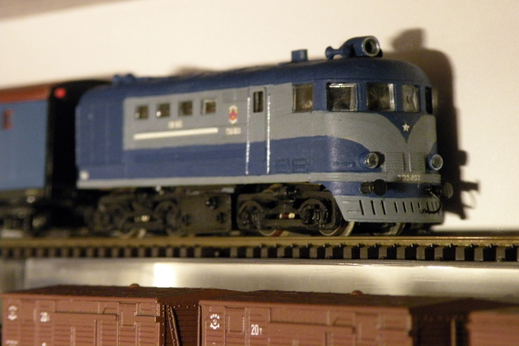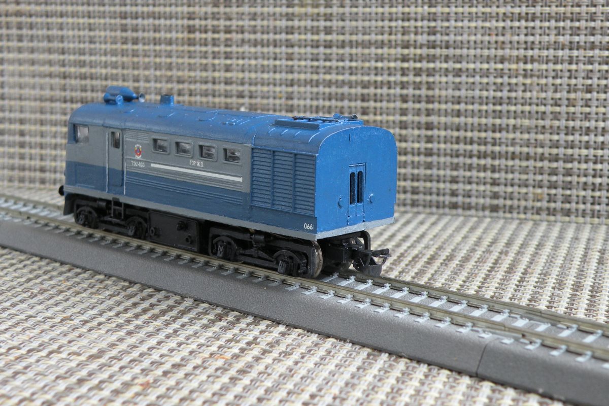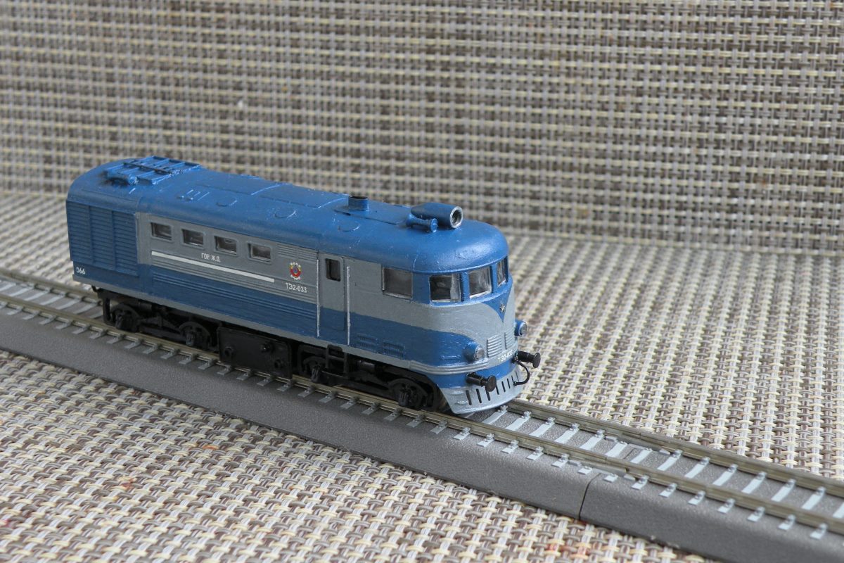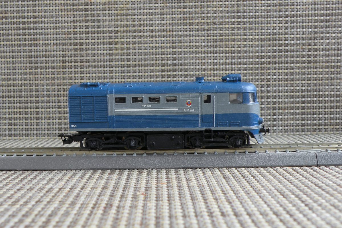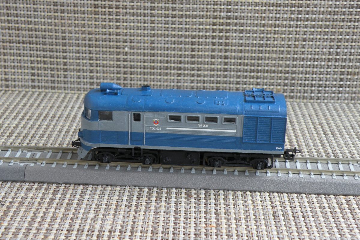 Разновидности: модель выполнена в единственном экземпляре. Эпоха: III Принадлежность: СЖД Фирма-производитель: Сергеев И. Год начала производства: 2014 Описание моделиМодель тепловоза ТЭ2-033 в односекционном варианте выполнена петербургским моделистом Игорем Сергеевым. Ходовая часть - на основе старой модели ЧМЭ2 от ВТТВ (привод на две центальные оси). Для изготовления корпуса частично использованы детали модели тепловоза ТЭ3 со старотипной кабиной производства "Пересвет". Оригинальные боковины тележек изготовлены самостоятельно. Модель впервые экспонировалась на выставке в ЦМЖТ, Санкт-Петербург, в марте 2014 г. Другие модели тепловоза ТЭ2: - от В.Бражника (малая серия); - от С.Ермоленко; - от С.Братского; - от А.Шувикова.