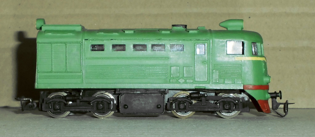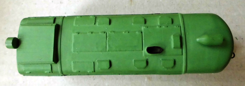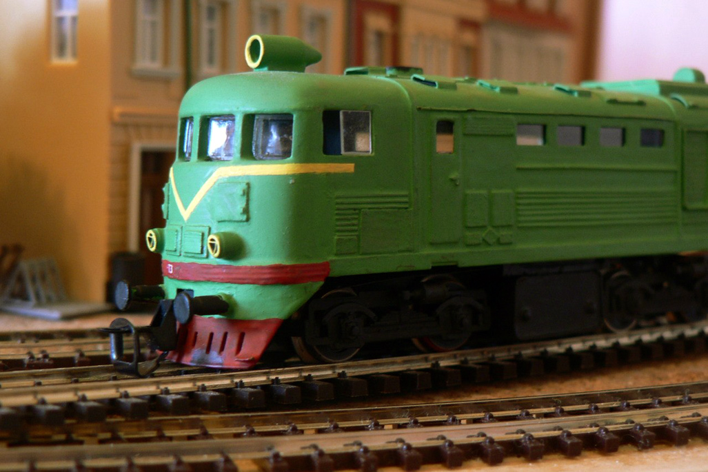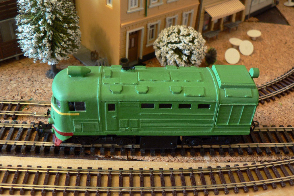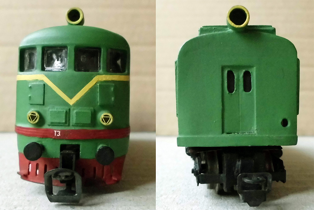 Эпоха: III-IV Принадлежность: СЖД Фирма-производитель: Ходаков А. Описание моделиЕдинственная в своём роде модель тепловоза ТЭ6 выполнена петербургским моделистом Антоном Ходаковым. Корпус, боковины тележек и топливные баки модели выполнены вручную с использованием различных материалов. Модель ходовая: использована ходовка от тепловоза ЧМЭ2 (производство фирмы ВТТВ), привод на две оси. В настоящее время модель находится в коллекции Льва Мощевитина (Москва). Описание прототипаПо заказу Министерства обороны в 1952 году Харьковский завод транспортного машиностроения создал односекционный четырёхосный тепловоз-электростанцию серии ТЭ6, удовлетворявший требованиям защиты от факторов поражения ядерного взрыва. Военный тепловоз ТЭ6 внешне очень похож на одну секцию гражданского тепловоза ТЭ2, на основе которой он создан, и отличается только внутренним оборудованием. (По некоторым данным, в противоположной кабине машиниста стороне кузова ТЭ6 отсутствовал межсекционный переход и межсекционные разъёмы, однако это не соответствует имеющимся фотографиям. См. кадр 8). Для защиты от повреждения электромагнитным импульсом ядерного взрыва в кузове тепловоза ТЭ6 проложена металлическая шина, на которую выводится заземление электрооборудования тепловоза. Воздух в герметизированный кузов и систему воздухозабора дизеля проходил через два круглых сетчатых фильтра, проворачивающихся в раздельных масляных ваннах. С помощью высокопроизводительного вентилятора с электроприводом в кузове тепловоза создавалось избыточное давление, что должно было препятствовать попаданию радиоактивной пыли. Тепловозы эксплуатировались в частях и соединениях Министерства обороны. Известны машины с девятью различными номерами, однако общее количество выпущенных тепловозов ТЭ6 остаётся загадкой. По-видимому, ни один из них до настоящего времени не сохранился.