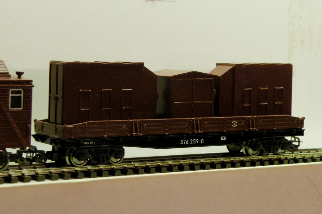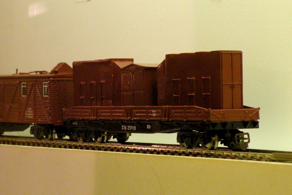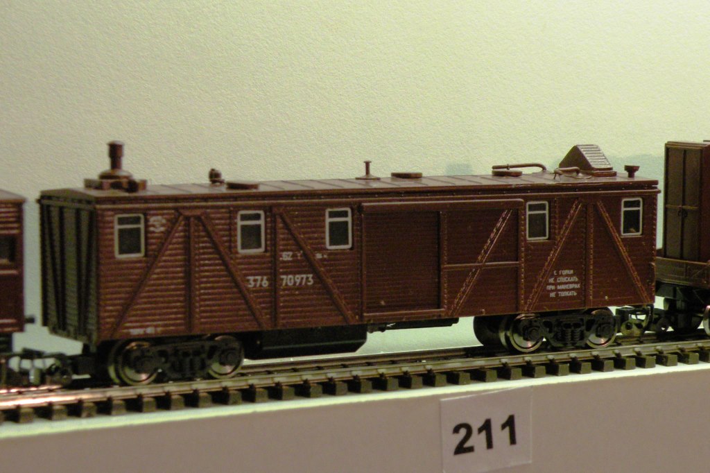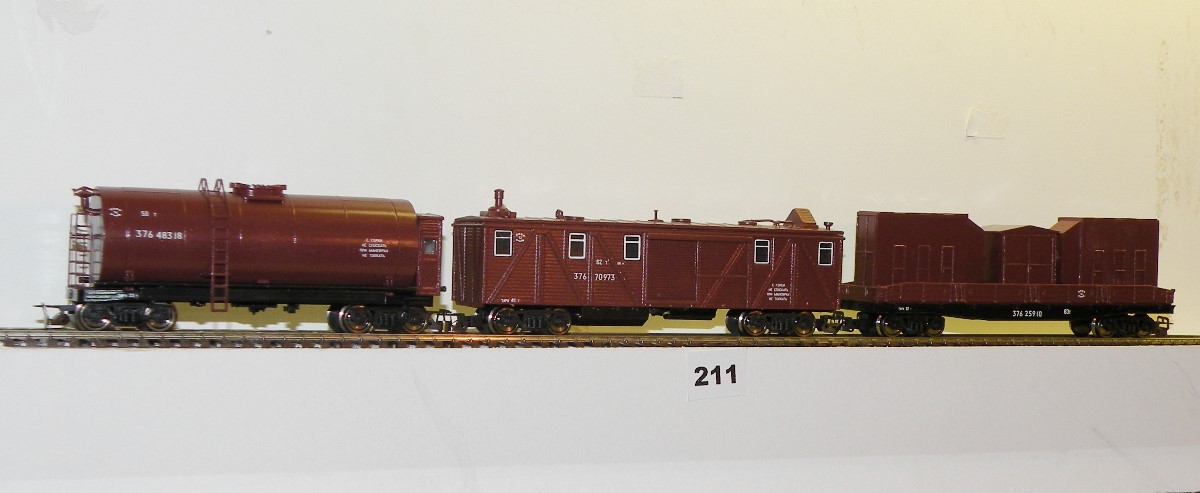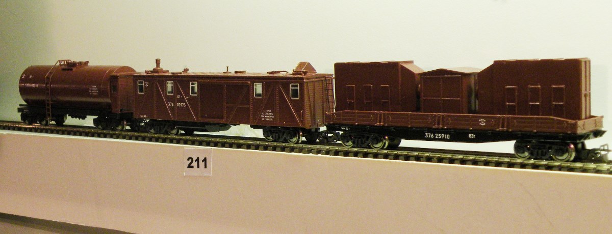 Разновидности: модель выполнена в одном экземпляре Эпоха: IV Принадлежность: СЖД Фирма-производитель: Иванов С. Год начала производства: 2017 Описание моделиСостав банно-прачечного поезда в трёхвагонгом исполнении - работа петербурского моделиста Сергея Иванова. В состав входят три вагона, каждый из которых выполнен на базе определенной серийной модели производства фирмы "Пересвет": 1) вагон-цистерна для воды (на базе цистерны-термоса); 2) вагон-электростанция (на базе четырехосного крытого вагона грузоподъемностью 50 т); 3) вагон-сушилка (на базе четырехосной платформы с деревянными бортами). Модель впервые экспонировалась на выставке "Железнодорожная модель - 2017" в ЦМЖТ, Санкт-Петербург. Описание прототипаВпервые банно-прачечные поезда появились в русской армии в 1904 году, во время русско-японской войны. Использовались они для бытового обслуживания солдат на фронте. И во время Великой Отечественной войны, и в мирное время такие позезда продолжали (и до настоящего времени продолжают) нести свою службу. Кроме представленных трёх вагонов, в состав банно-прачечного поезда входят вагон-баня, вагоны-склады чистого и грязного белья, вагон-прачечная и целый ряд других вагонов. Советская, а теперь Российская армия – единственная в мире, где есть такие поезда.