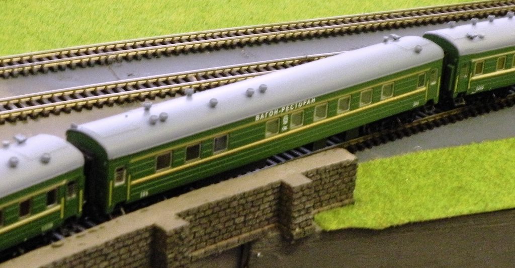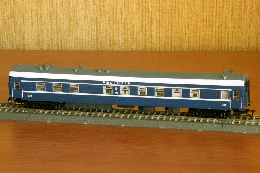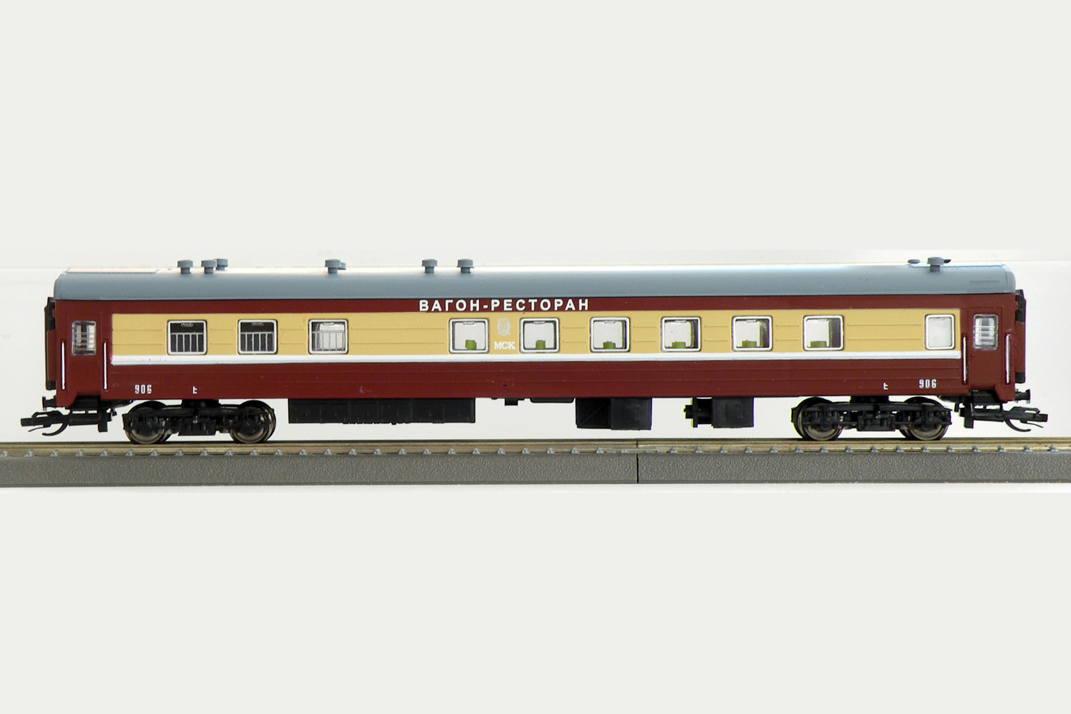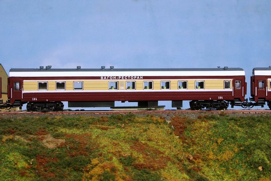 Разновидности: разные окрасочные схемы (под разные составы), разные бортовые номера Эпоха: III Принадлежность: СЖД Фирма-производитель: ТТ-Модель Год начала производства: 2010 Год окончания производства: малосерийная модель, производится небольшими партиями (в комплектах с купейными ЦМВ) Артикул: 2221-21, 2240-40 Описание моделиМодель вагона-ресторана (ЦМВ начала 60-х гг.) в окраске поезда "Красная Стрела", соответствующей эпохе, в 2010 г. выпущена малой серией фирмой "ТТ-Модель" (арт. 2221-21). От серийного ЦМВ-ресторана модель отличается формой и рарсположением крышевых дефлекторов, наличием угольных ящиков и откидных форточек на окнах. (Эта последняя деталь присутствовала только на вагонах "Красной Стрелы", в дальнейшем она была упразднена, видимо, для облегчения производства моделей). В 2011 г. появился такой же вагон в наборе поезда "Россия" 60-х гг. в соответствующей окраске (арт. 2240-40), а в 2012 г. - в составе поезда "Экспресс Москва - Ленинград". В 2007 г. аналогичная модель в окраске "Красной стрелы" была самостоятельно изготовлена московским моделистом Александром Андреевым. От варианта фирмы "ТТ-Модель" она отличается числом дефлекторов и деталями подвагонного оборудования. Нужно отметить, что все имеющиемя варианты модели выполнены в значительной степени "по мотивам", так как первые вагон-рестораны от VEB Wagonbau Ammendorf имели другое расположение окон - с меньшим шагом, что требует изготовление кузова "с нуля".