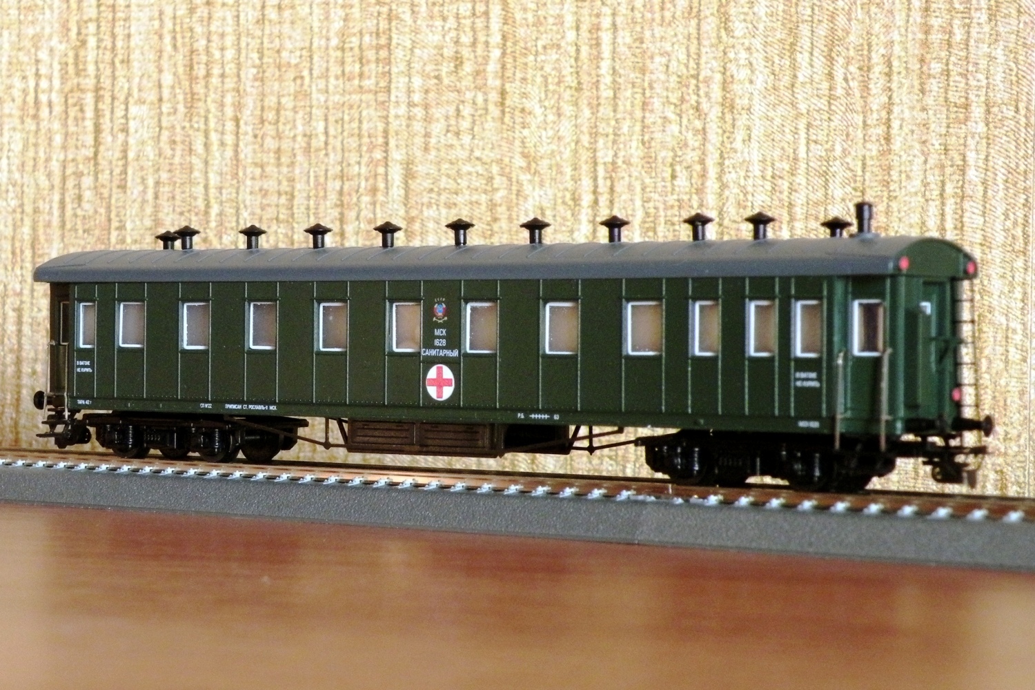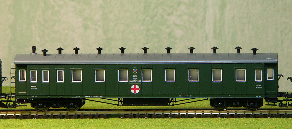 Разновидности: два разных набора Эпоха: III Принадлежность: СЖД Фирма-производитель: Пересвет Год начала производства: 2009 Год окончания производства: 2009 (малая серия - 200 наборов + 30 наборов) Артикул: 2200 Описание моделиМодель санитарного поезда была выпущена фирмой "Пересвет" в виде двух различных наборов, дополняющих друг друга. Первый набор (арт. 2200) появился осенью 2009 г. и имел ограниченный триаж - 200 экз. Он включаюет три вагона. Вагон-аптека и вагон-кухня представляют собой переделанные 50-тонные вагоны. Они отличаются от исходной модели крытого вагона наличием окон, расположение труб и дефлекторов на крыше, а также торцевыми стенами с дверями и поручнями. Третий вагон - переделанный из плацкартного 20,2-метрового "егоровского". Второй набор появился в декабре 2009 г. Он был выпущен тиражом 30 экз. и не имел отдельного артикула. Этот набор включает в себя два "егоровских" вагона с новыми номерами, один из которых, к тому же, отличается расположением крышевых дефлекторов (расположение соответствует купейному прототипу). Таким образом, полный модельный состав санитарного поезда может быть сформирован из пяти разных вагонов. Все вагоны снабжены качественными надписями и отличаются хорошей деталировкой. Интерьер в "егоровских" вагонах отсутсвует, но это практически не заметно, поскольку в окнах вагонов "матовые стёкла" (закленные изнутри матовой плёнкой). Другие модели санитарных вагонов длиной 20.2 м.: - от С.Иванова ("егоровский" вагон); - от В.Дёмина (вагон "владикавказского" типа); - от Д.Екимова. Описание прототипаМодель, выпущенная "Пересветом", представляет собой передвижной амбулаторный пункт, приписанный к ст. Рославль-II Мск ж.д. - один из тех, которые функционировали на советских железных дорогах в послевоенную эпоху. Санитарные вагоны, переделанные из 20,2-метровых пассажирских вагонов, в настоящее время экспонируются в ж.д. музеях Москвы и Новосибирска. В Гомеле (Беларусь) в качестве памятника установлен вагон санитарного поезда, переделаный из 50-тонного крытого вагона.