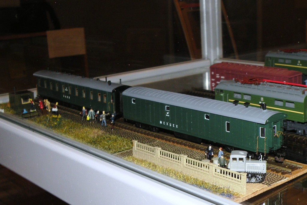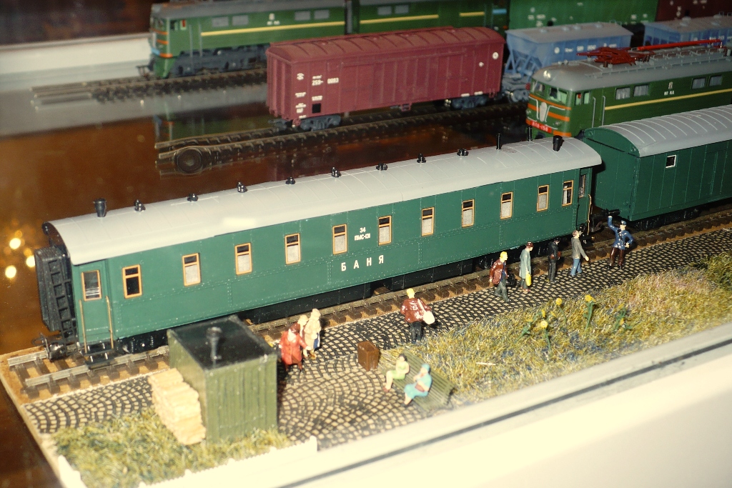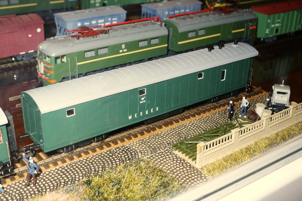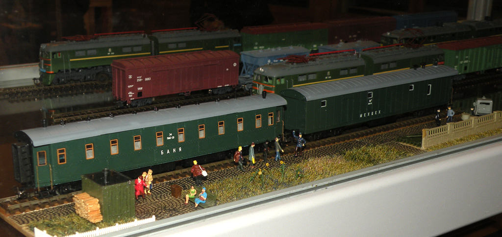 Эпоха: III-IV Принадлежность: СЖД Фирма-производитель: Демин В. Год начала производства: 2015 Описание моделиВ марте 2015 г. на выставке "Железнодорожная модель" в Центральном музее ж.д. транспорта (СПб) петербургский моделист Виктор Дёмин представил новую авторскую модель - вагон-баню в сцепе с вагоном - механическим цехом. Модель вагона-бани выполнена на основе малосерийной модели плацкартного вагона "Владикавказского типа" ("Пересвет", 2012). Модель вагона-мехцеха представляет собой конверсию малосерийной модель багажного "егоровского" вагона ("Пересвет", 2010).