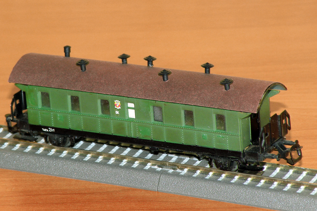 Модель трофейного вагона-бригадника СЖД создана петербургским моделистом Игорем Сергеевым на базе известного пасажирского вагона-"семиоконника" от Zeuke-BTTB-Tillig (арт. по каталогу ВТТВ 3210, Tillig - 3210) с использованием дефлекторов-"грибков" от фирмы "Пересвет".