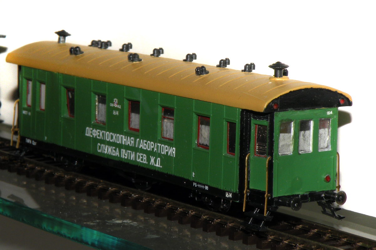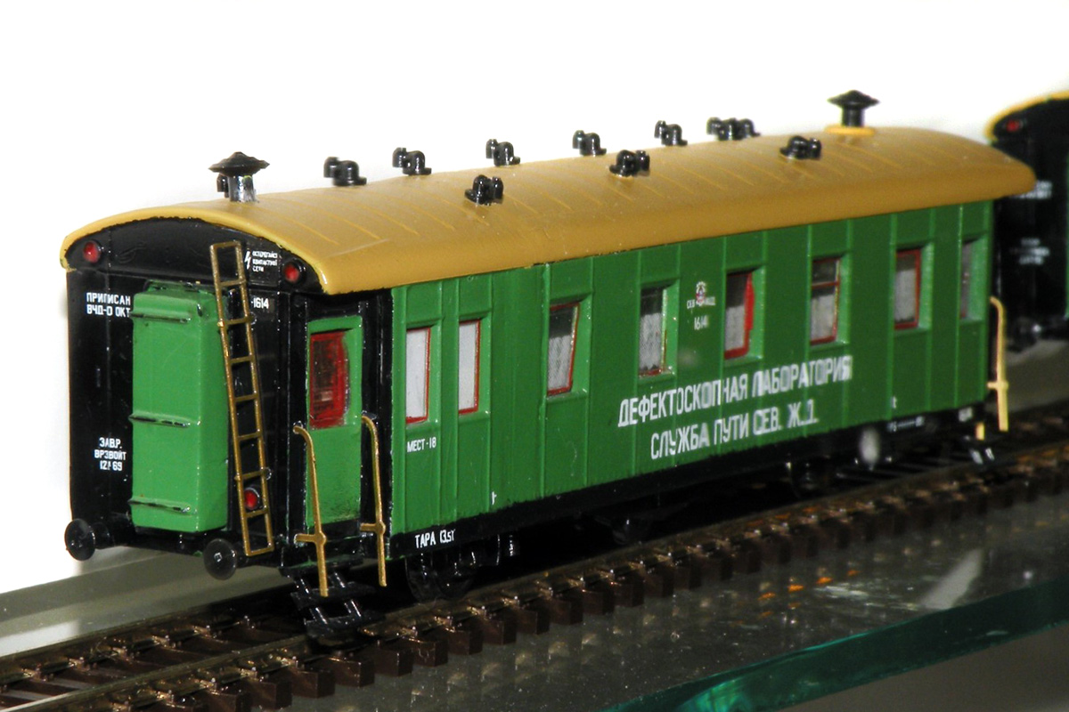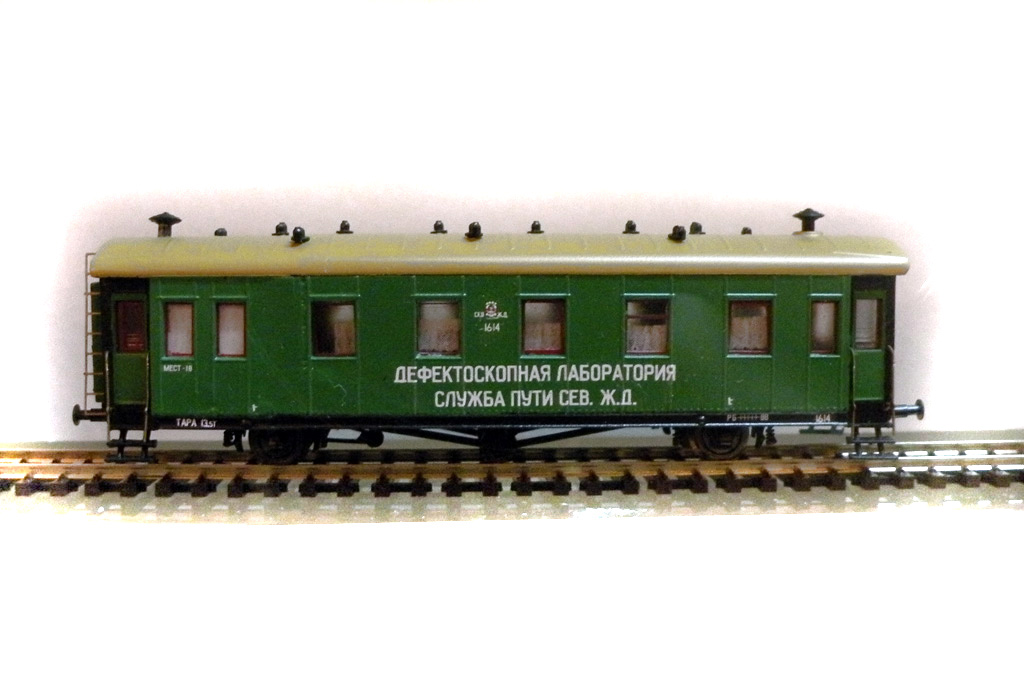 Эпоха: III Принадлежность: СЖД Фирма-производитель: Кечетов М. Год начала производства: 2014 Описание моделиМодель выполнена московским моделистом Михаилом Кечетовым и впервые экспонировалась на выставке в "Железнодорожная модель" в марте 2014 г. в ЦМЖТ, Санкт-Петербург. Для изготовления модели использованы детали "егоровских" вагонов производства фирмы "Пересвет". Описание прототипаВагон-прототип - дефектоскопная лаборатория службы пути Северной ж.д. - выполнен на базе двухосного пассажирского вагона длиной 14 м советской (довоенной) постройки.