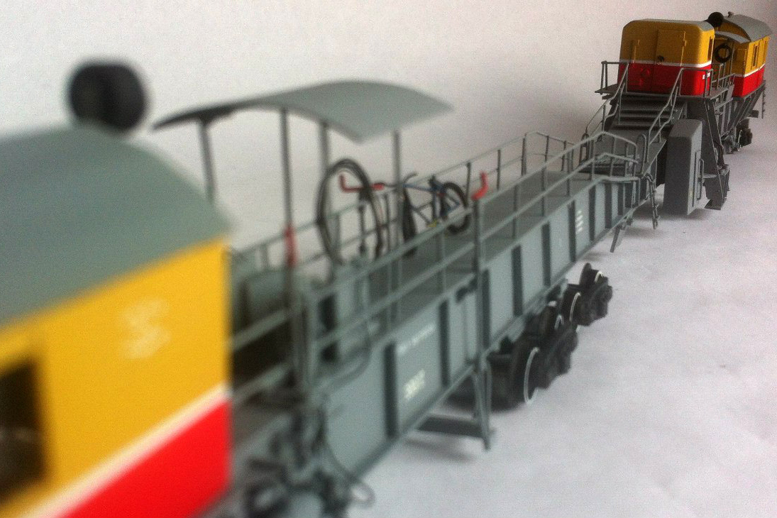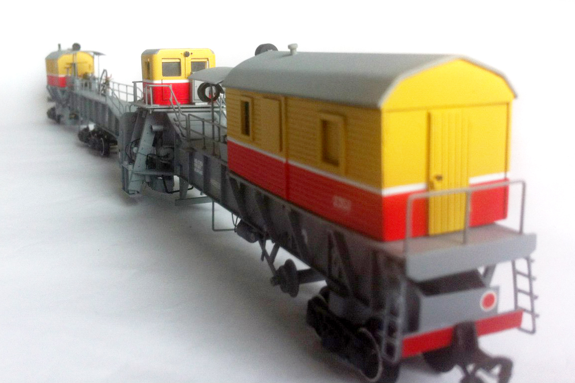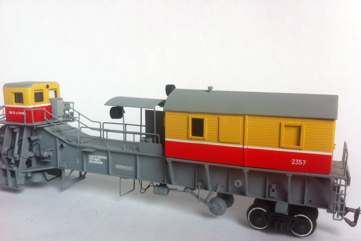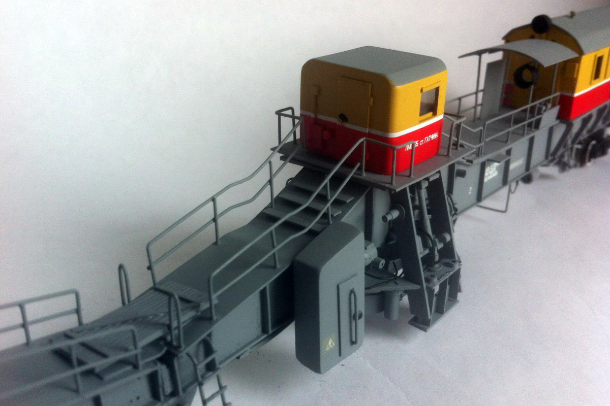Эпоха: IV Принадлежность: СЖД Фирма-производитель: Прийменко В. Год начала производства: 2016 Описание моделиМодель электробалластёра ЭЛБР-1 - авторская работа петербургского моделиста Вячеслава Прийменко. Использованы традиционные для моделиста материалы: ПВХ пластик 1мм, полистирол, медь, а также тележки ЦНИИ-Х3О от фирмы "Пересвет". Модель отличается высокой сложностью и хорошей деталировкой. Модель впервые экспонировалась на выставке в Центральном музее ж.д. транспорта в Санкт-Петербурге в марте 2016 г. Описание прототипаЭлектробалластёр предназначен для механизированной подъемки пути, подведения балласта под шпалы поднятой путевой решетки непрерывно во время движения при любых типах рельсов до 75 кг/пог.м и железобетонных шпалах, а при навеске рихтовочного устройства служит для непрерывной рихтовки пути. Транспортирование осуществляется отдельным локомотивом или в составе грузового поезда, перед последним хвостовым вагоном. Обслуживающий персонал 3-4 человека. Разработчик - ПКБ Главстроймеханизации; изготовитель - завод Министерства транспортного строительства СССР.