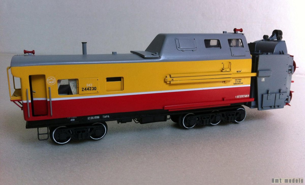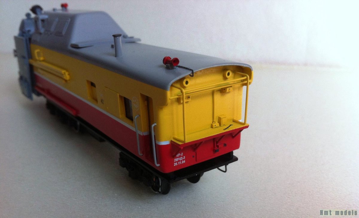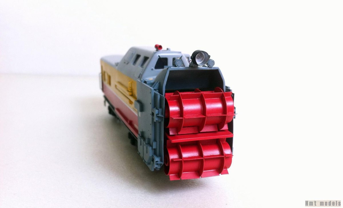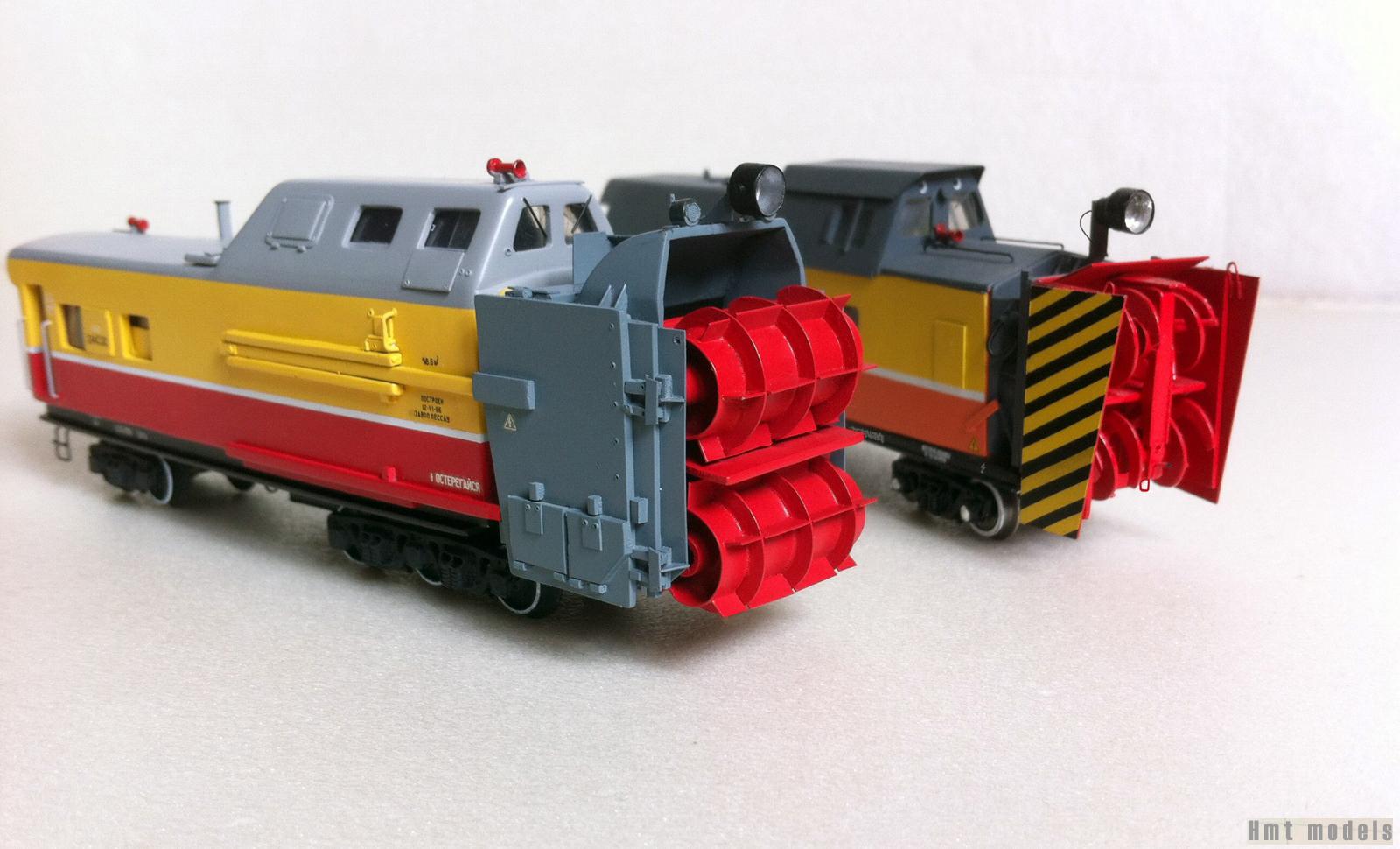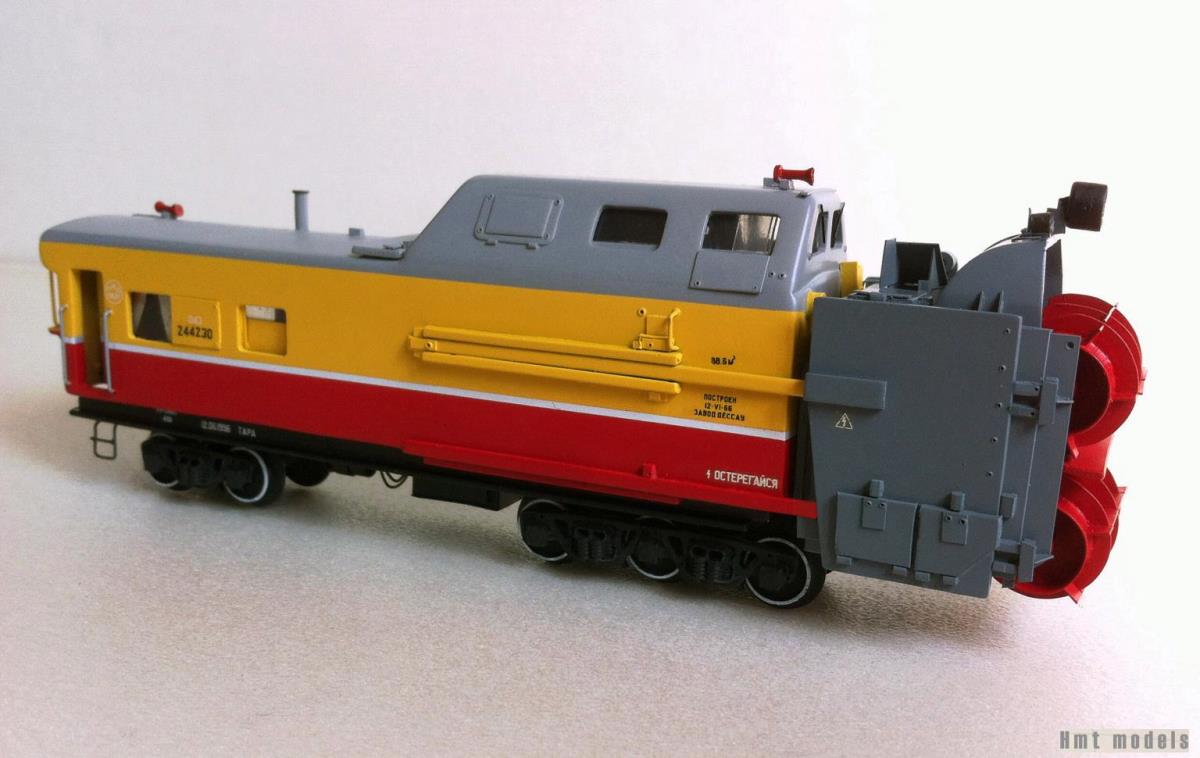 Разновидности: модель выполнена в единственном экземпляре Эпоха: V Принадлежность: РЖД Фирма-производитель: Прийменко В. Год начала производства: 2017 Описание моделиМодель снегоочистителя ЭСО - авторская работа петербургского моделиста Вячеслава Прийменко. Модель выполнена "с нуля", для ее изготовления использованы ПВХ пластик толщиной 1,5 мм, полистирол, медная проволока. Использованы тележки ЦНИИ-Х3О фирмы "Пересвет", на основе которых изготовлена в том числе и трёхосная передняя тележка. Проработаны мелкие детали и интерьеры кабины управления и купе блигады. Описание прототипаСнегоочиститель ЭСО трехроторный электрический с питателями предназначен для очистки железнодорожных путей от снега любой плотности высотой снежного заноса до 4,5 м. (ширина - от 3,5 до 5 м.). Снегоочистительное устройство состоит из двух питателей, ротора, подрезного ножа, рассекателя, основных крыльев и подкрылков. Питатель представляет собой барабан с лопатками, на концах которых укреплены ножи. Выброс снега производится в сторону от очищаемых путей. Скорость движения машины при высоте снежного заноса 4,5 м составляет 0,5 км/ч. Мощность электродвигателей 960 кВт. Численность обслуживающего персонала 2 чел. Производился Кировским машиностроительным заводом имени Первого Мая. В Новосибирском музее ж.д. техники (ст. Сеятель) экспонируется роторный снегоочиститель ЭСО 1960 г.выпуска.